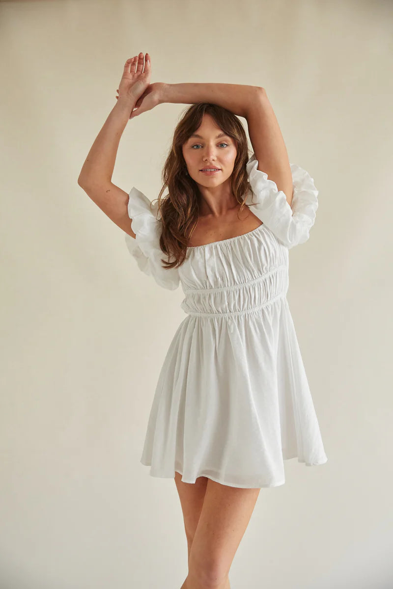 Have some fun in the sun in the Santal Puff Sleeve Babydoll Mini Dress! This flirty piece is complete with an square neckline, short puff sleeves, a fitted waist, and flouncy silhouette. Available in pink and white. Pair with some for a casual look.