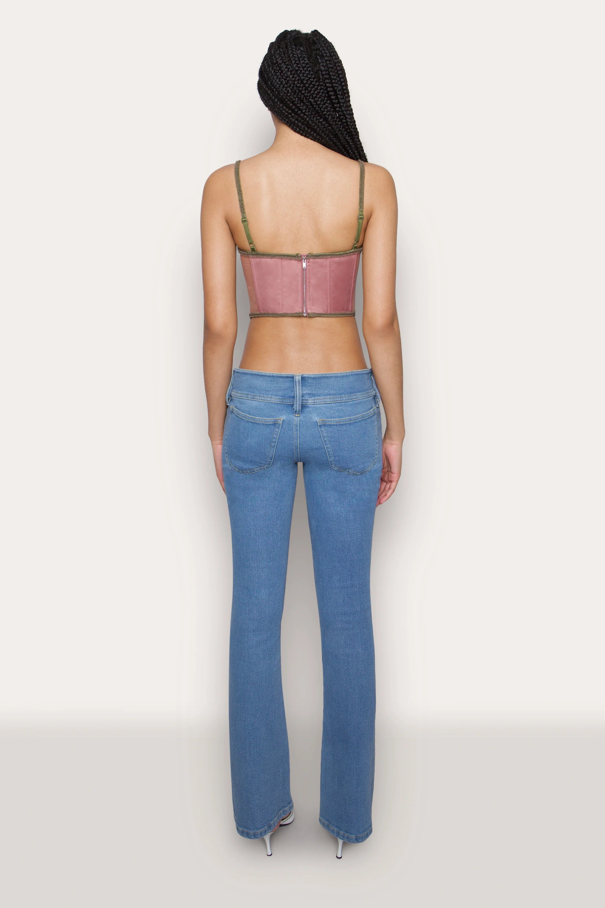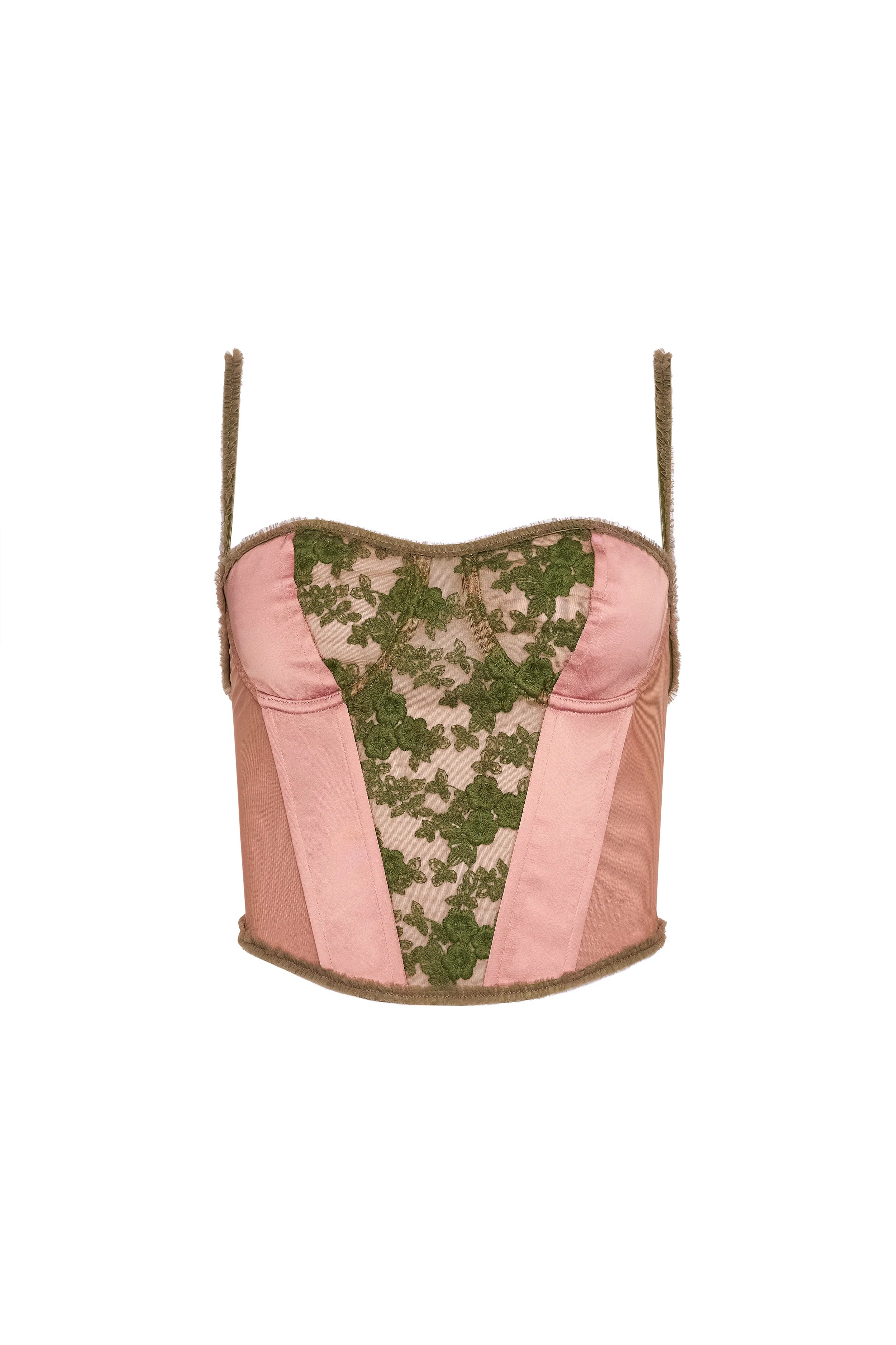 We firmly believe in a corset for every occasion. This is our latest favorite. a pieced satin and mesh style with contrast floral lace. The boned structure provides a supportive fit. and the ruched chiffon detailing means it's easy to dress up.