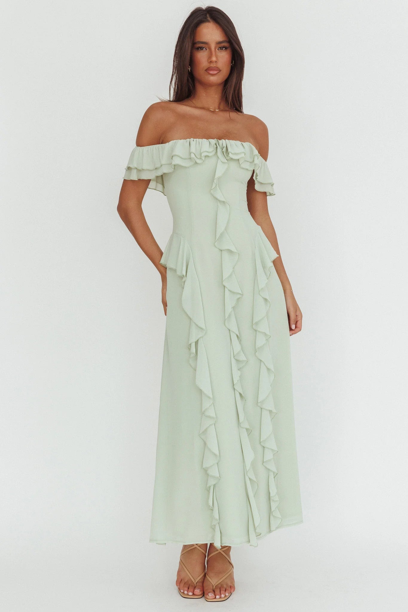 Make an impression in our stunning Scarlet maxi dress. It features an off-shoulder design with adorable ruffle trim throughout. It's perfect for Friday night dinner dates with your girls teamed with a saddle bag and mules for a chic look.