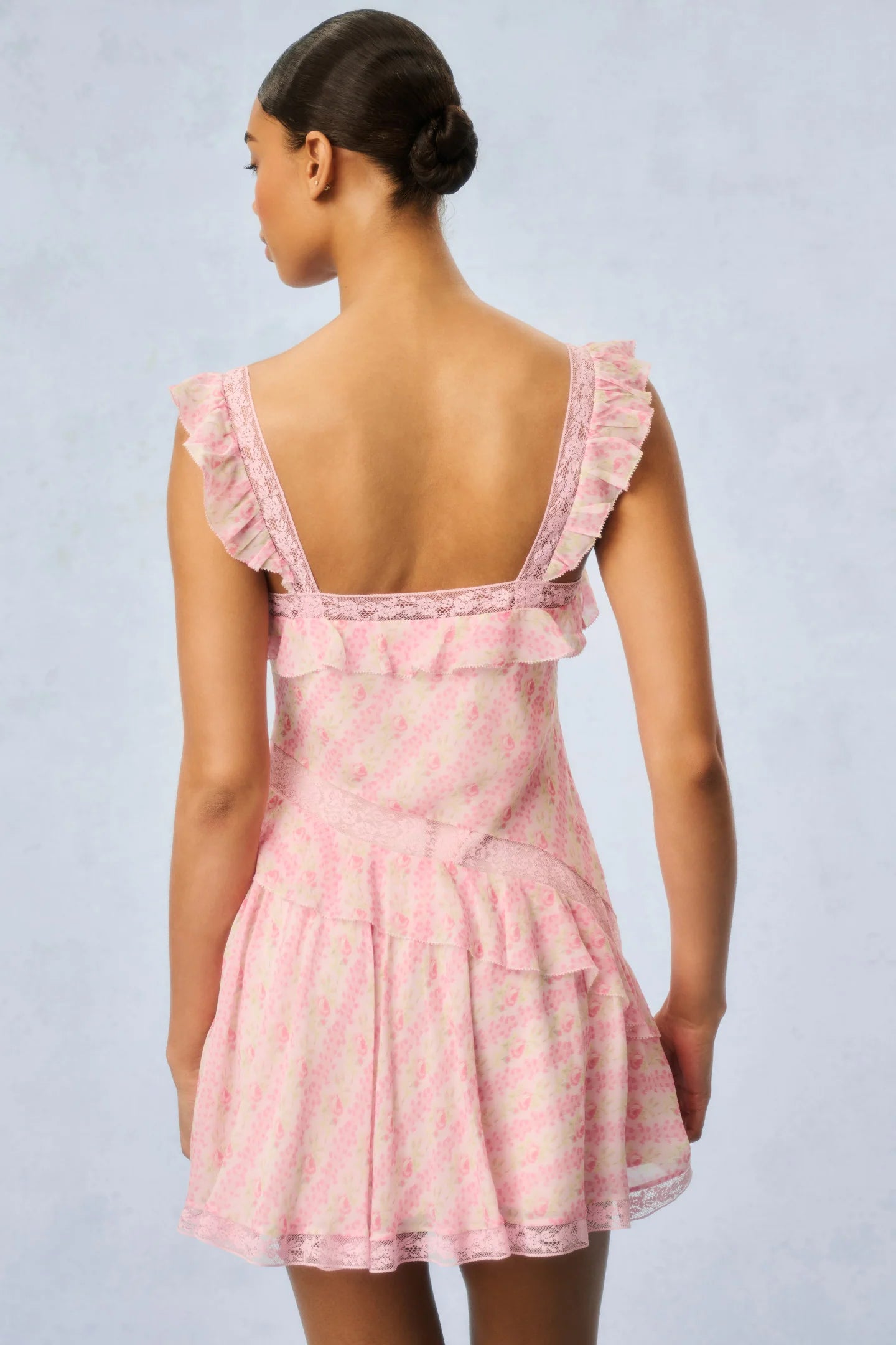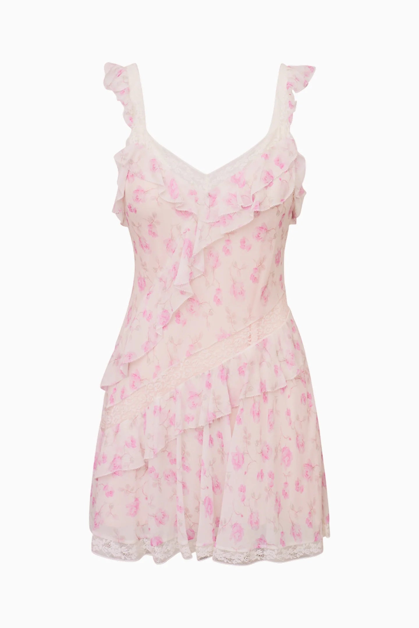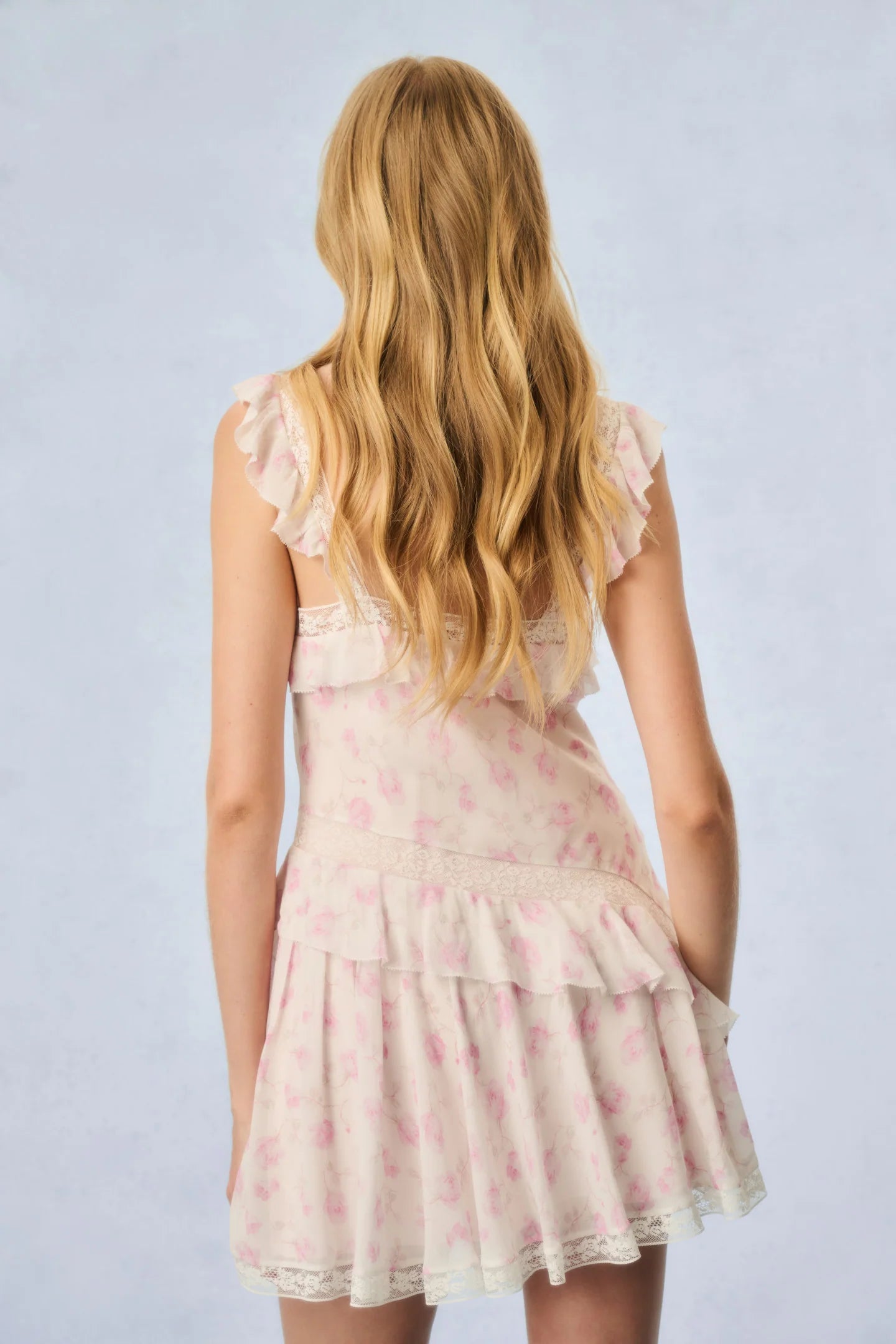 The Serima Dress is back as part of our Fragrance Capsule collection, this time arriving in our best-selling perfume prints.. This gorgeous sun dress is designed with a printed viscose chiffon fabric. The mini begins with tank top straps above a slight v-neckline adorned with tiny ruffles. An asymmetrical ruffle lines the bodice before descending to the airy, pleated skirt.