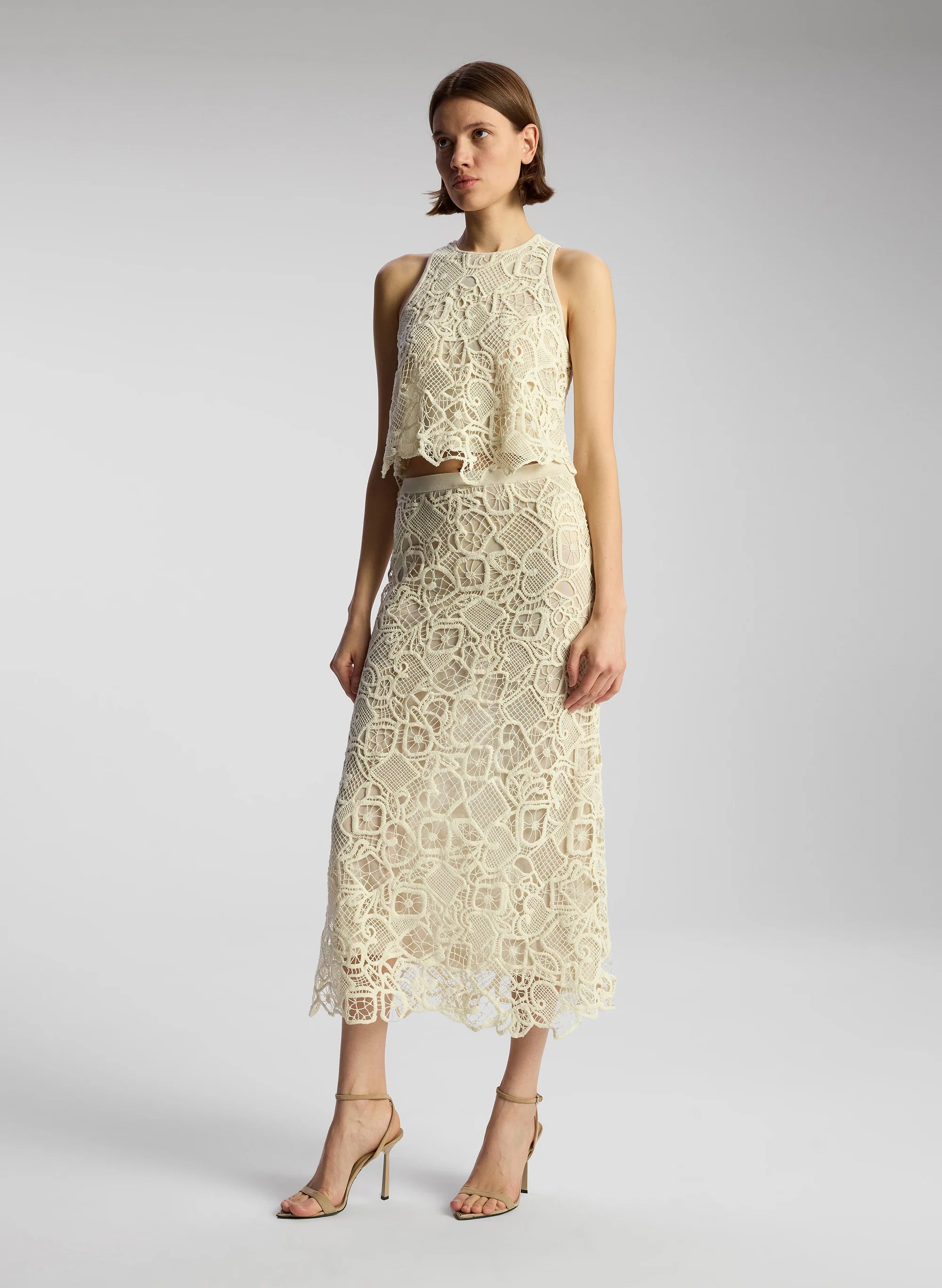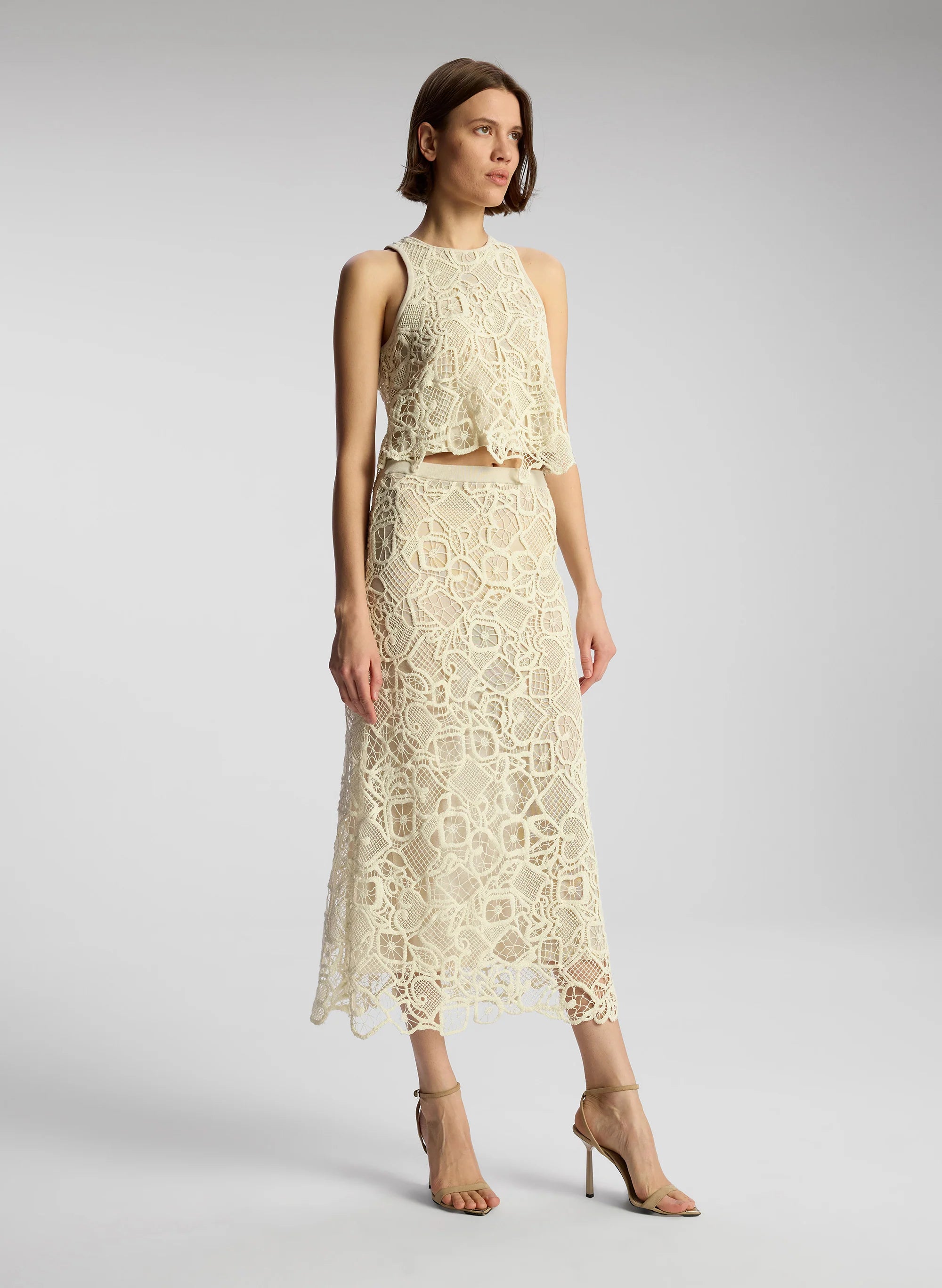 The Shay Skirt is crafted from our custom Garcia lace in a warm white hue. This midi skirt features a pull-on waistband and tonal lining that accentuates the natural edges of the lace. This style runs true to size. Shop Bottoms.