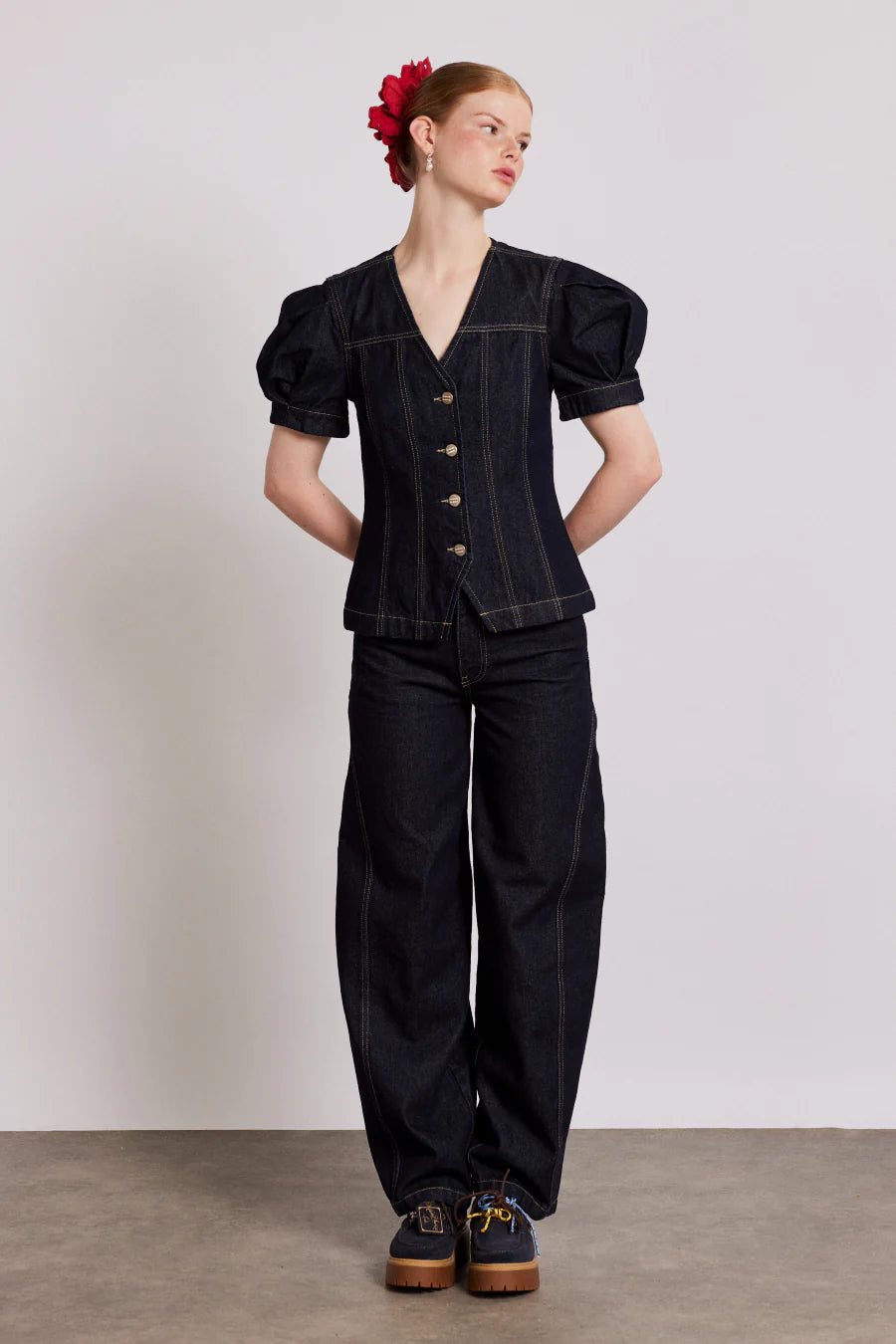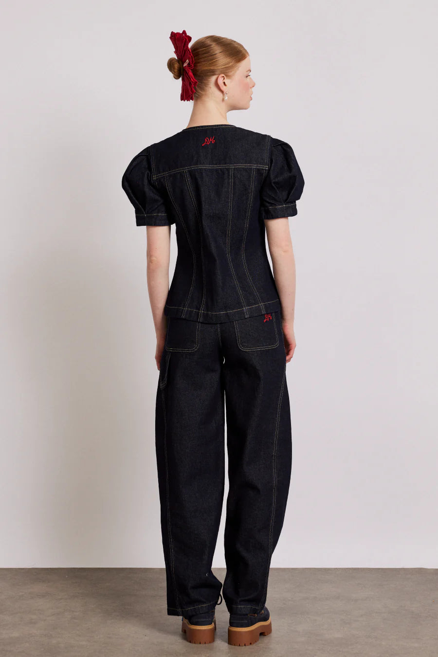 Our instantly iconic Shell denim top comes in a dark indigo. featuring puff sleeves and a shank button fastening. This style was designed in London.