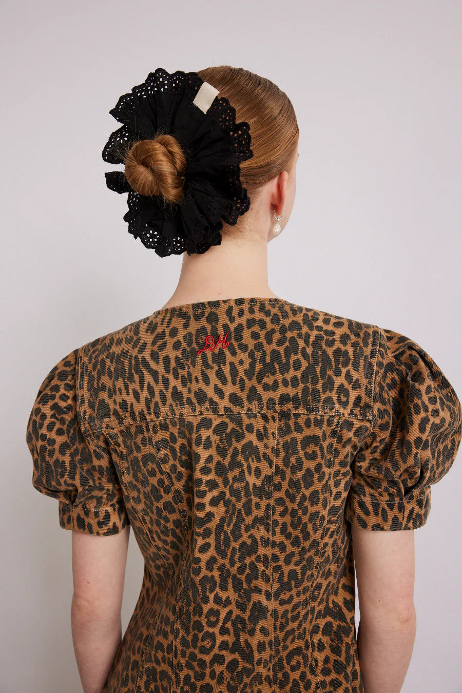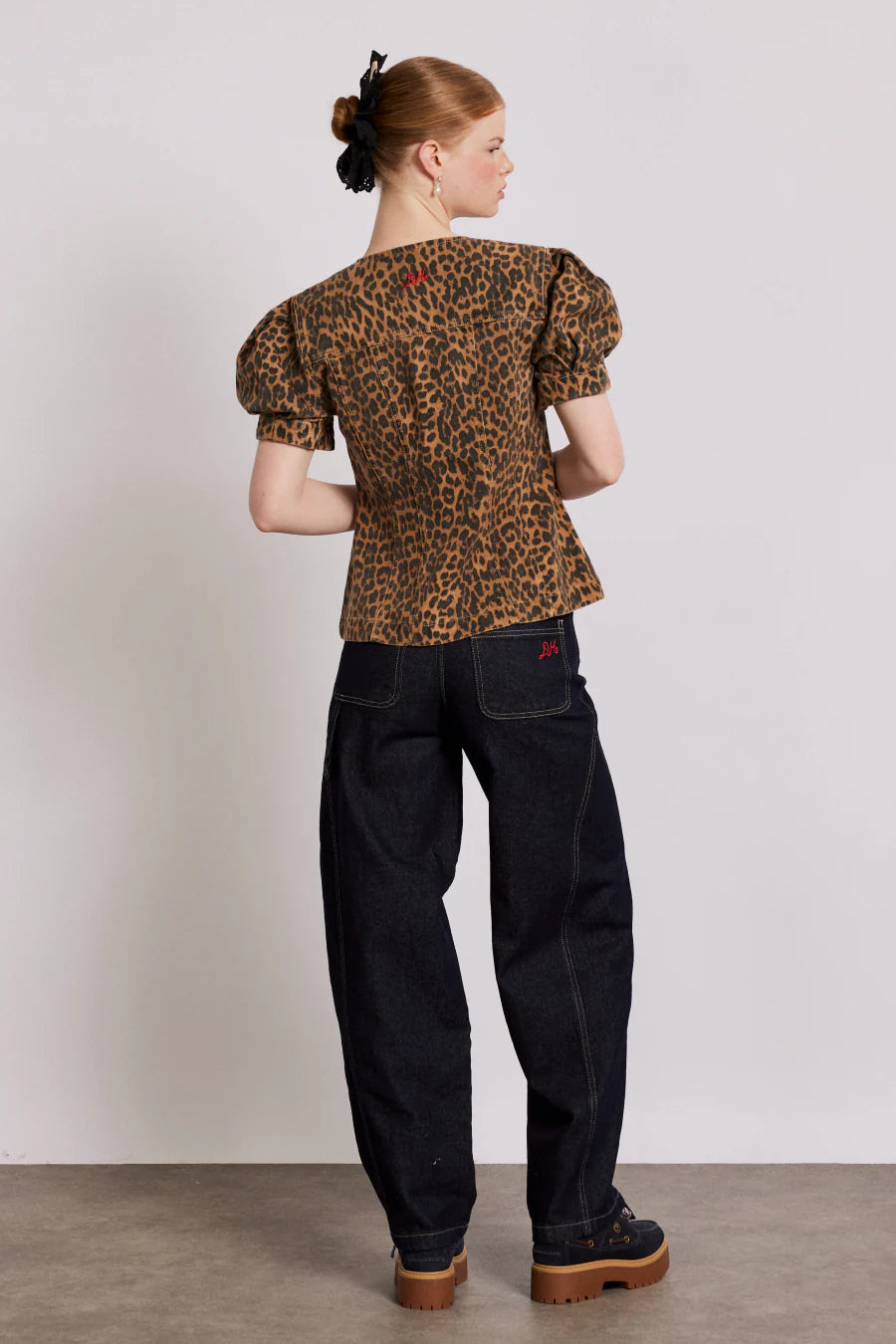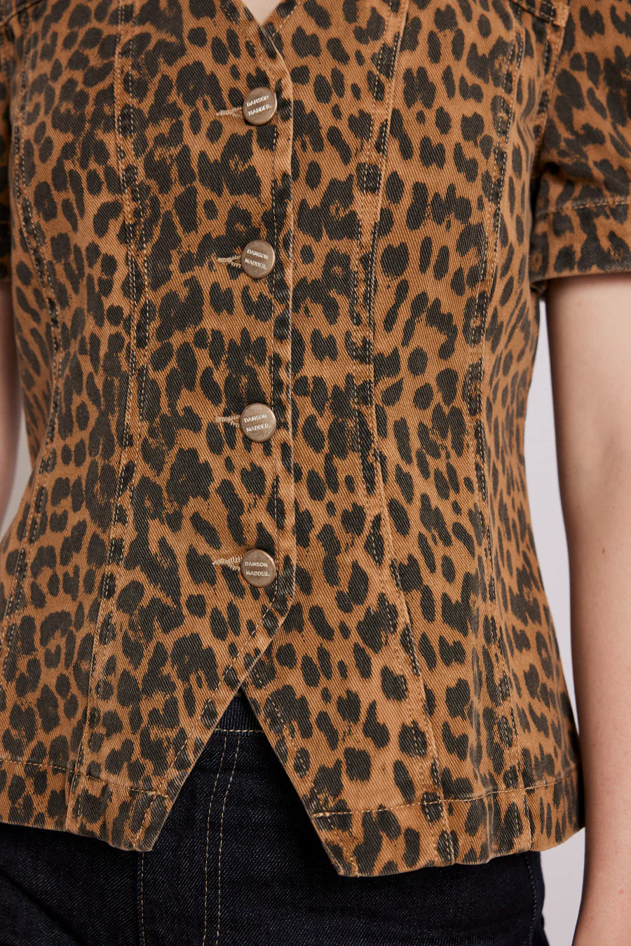 Our instantly iconic Shell denim top comes in our signature Leopard Print. featuring puff sleeves and a shank button fastening. This style was designed in London.