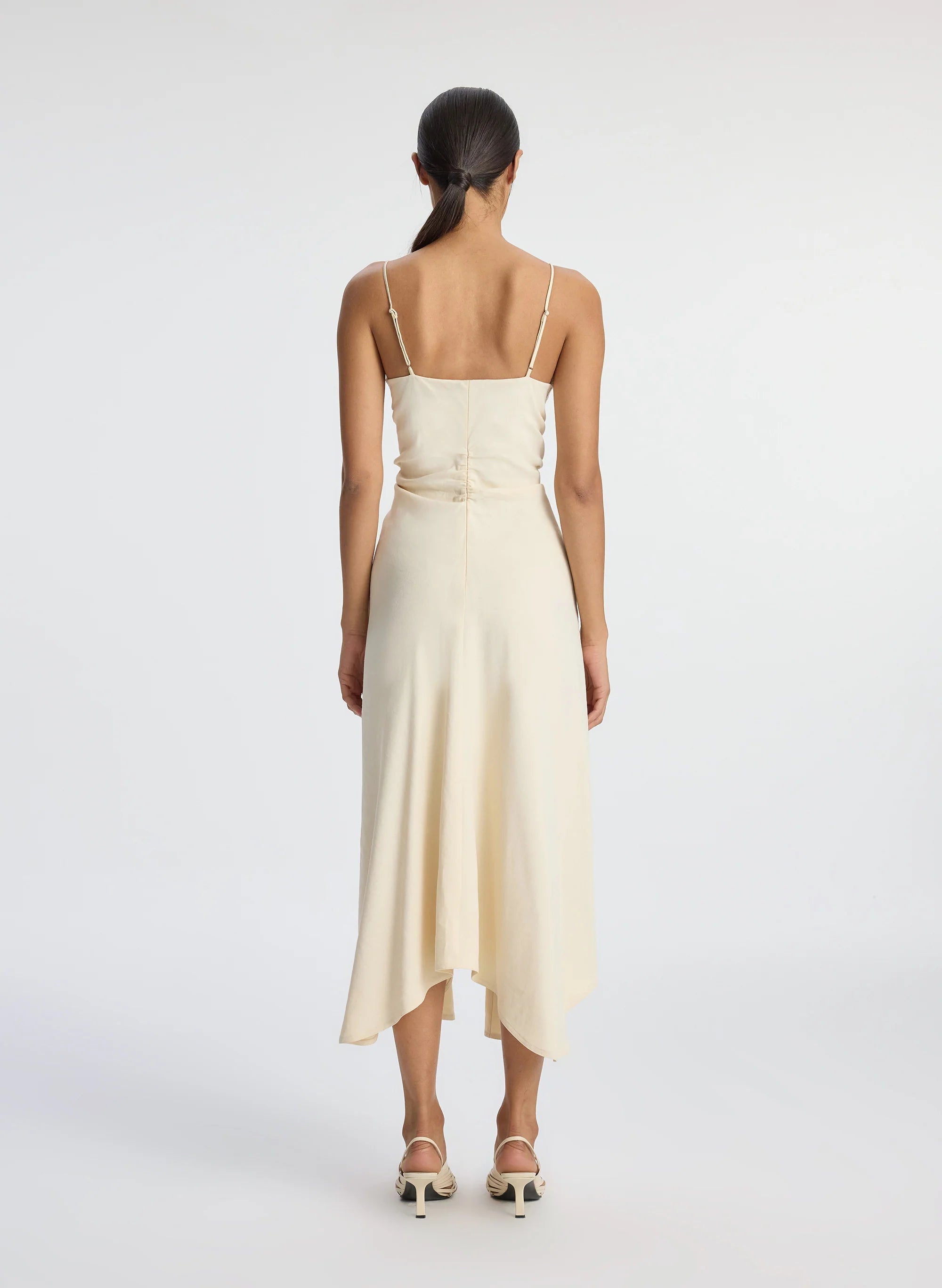 The Silvia Dress is crafted from our structured linen twill fabric in an ivory hue. This midi silhouette is sleek yet beautifully detailed. with a ruched bodice enhanced with curved hand-crochet seams. A graceful handkerchief hemline adds to the intricacy. while a squared neckline with thin adjustable straps offers a sleek offset. This style runs true to size. Shop Dresses