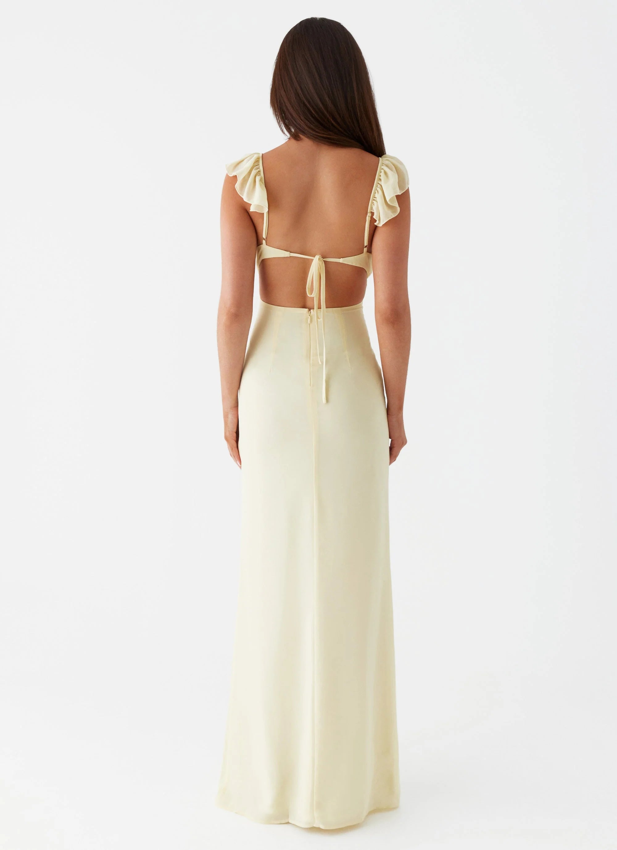 Introducing the Silvie Maxi Dress. his dress features a flattering V neckline, complemented by frill straps and intricate neckline detailing, enhancing its elegant appeal. With an open back adding a touch of allure,
