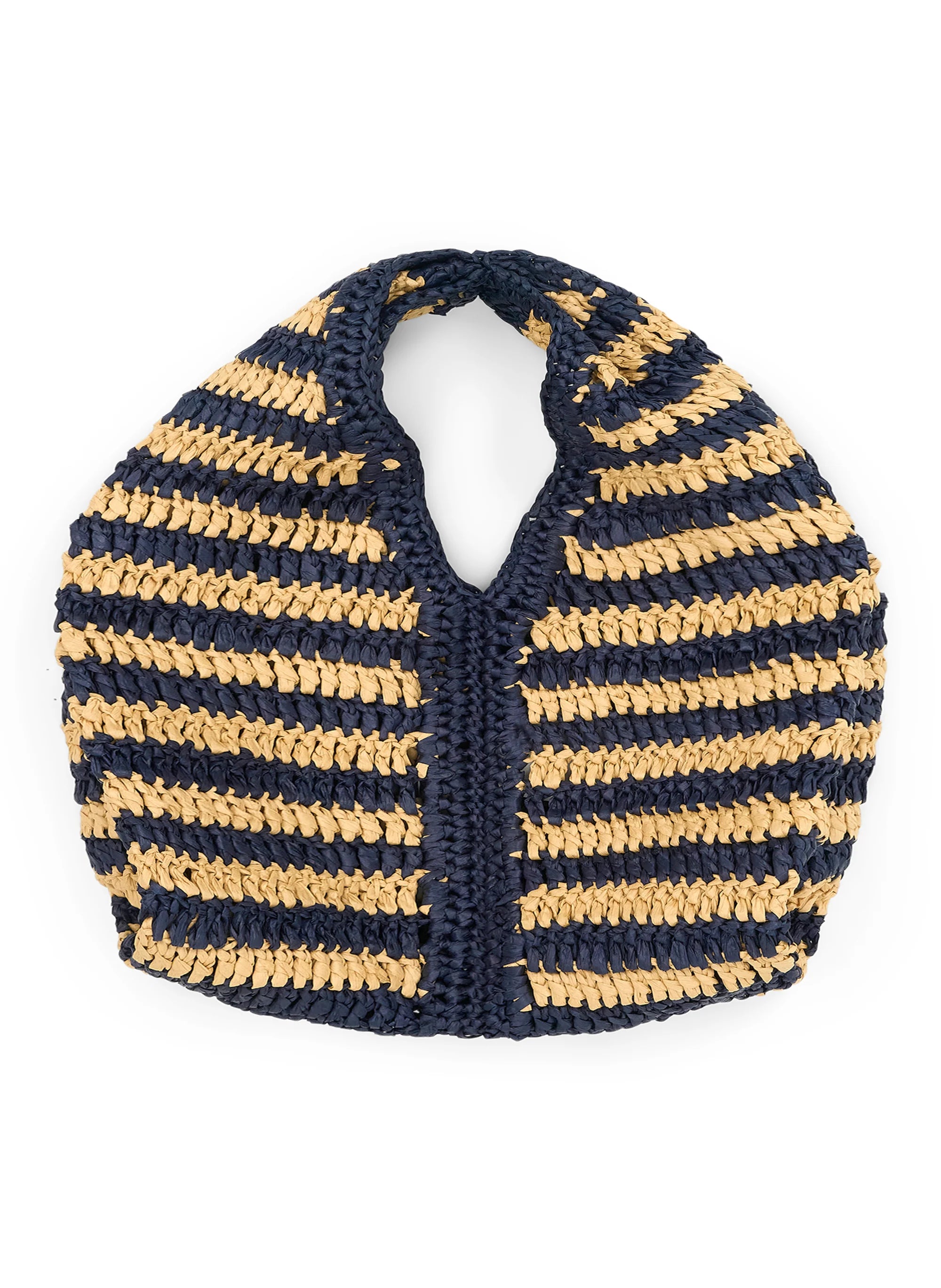 The Simone Bag is woven from raffia in natural tan and navy stripe. This mini silhouette features a soft. flexible shape with a twisted handle for modern impact. Shop Bags.