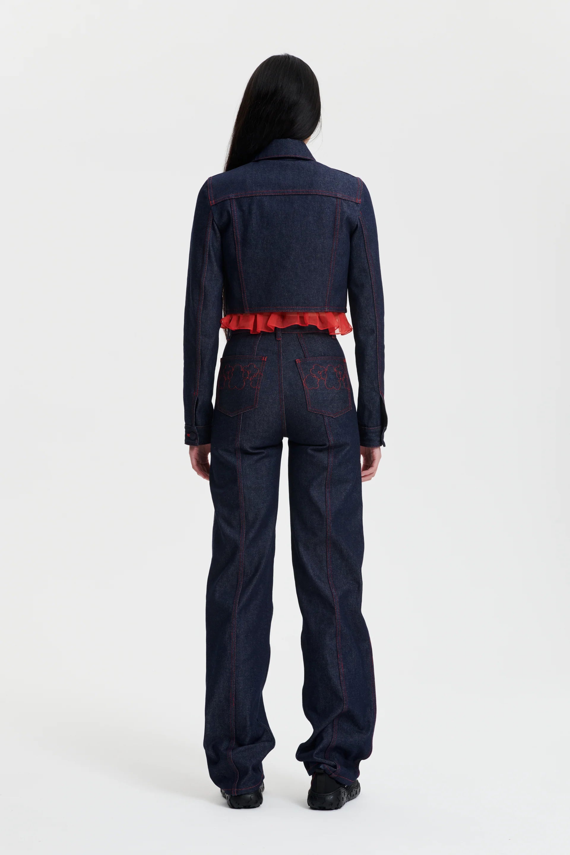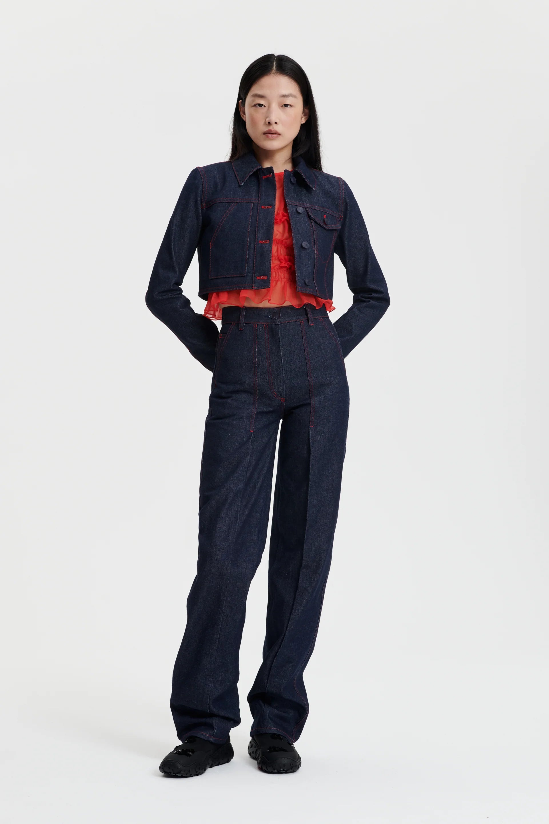 Cecilie Bahnsenís take on everyday dressing is met with the Sixta Trouser. Crafted from Japanese denim in 100% cotton the effortless trouser merges elegance through a delicate front pleat. A high-waisted silhouette with a straight leg structure finished with front and back pockets and traditional denim closure.