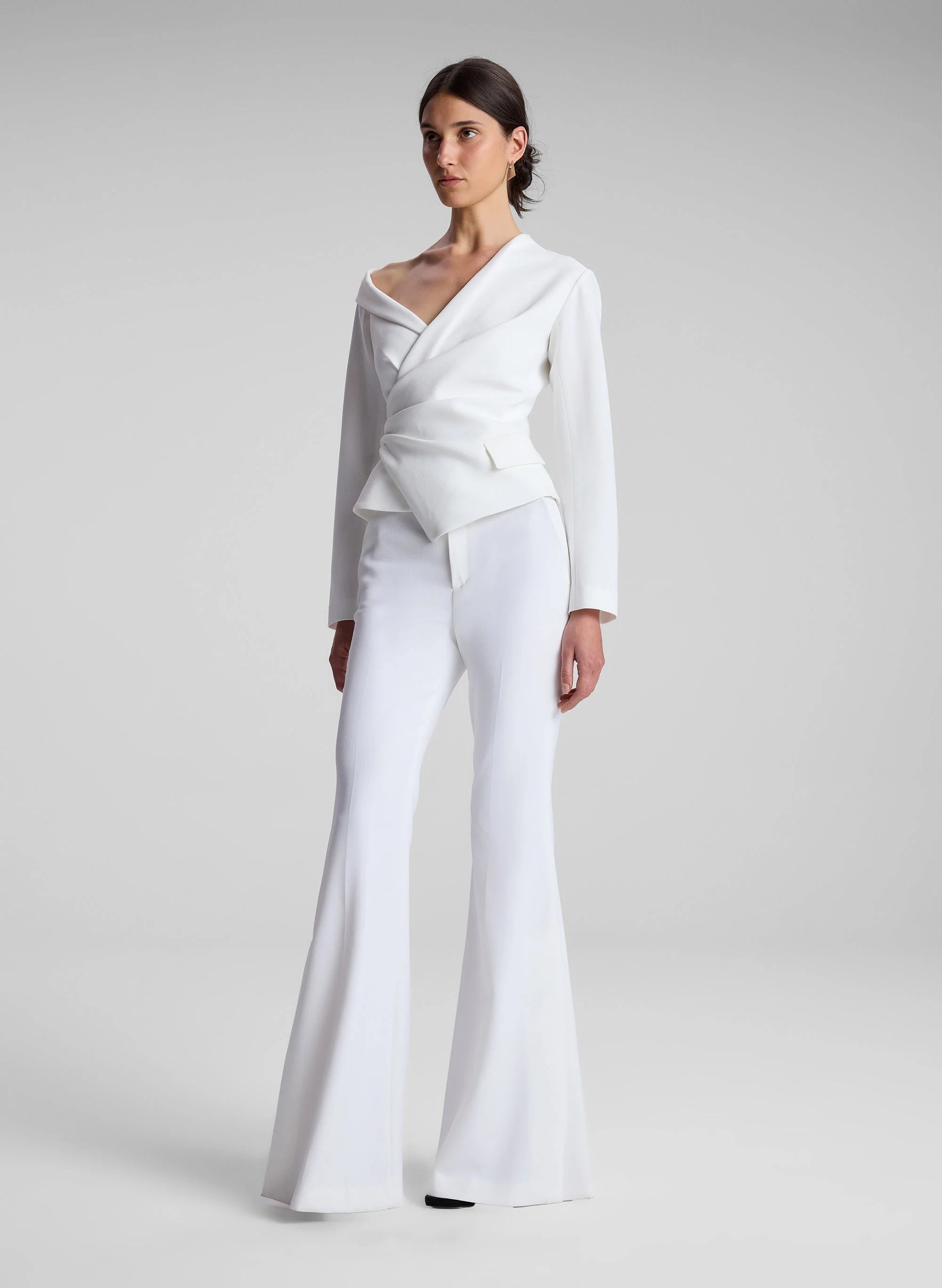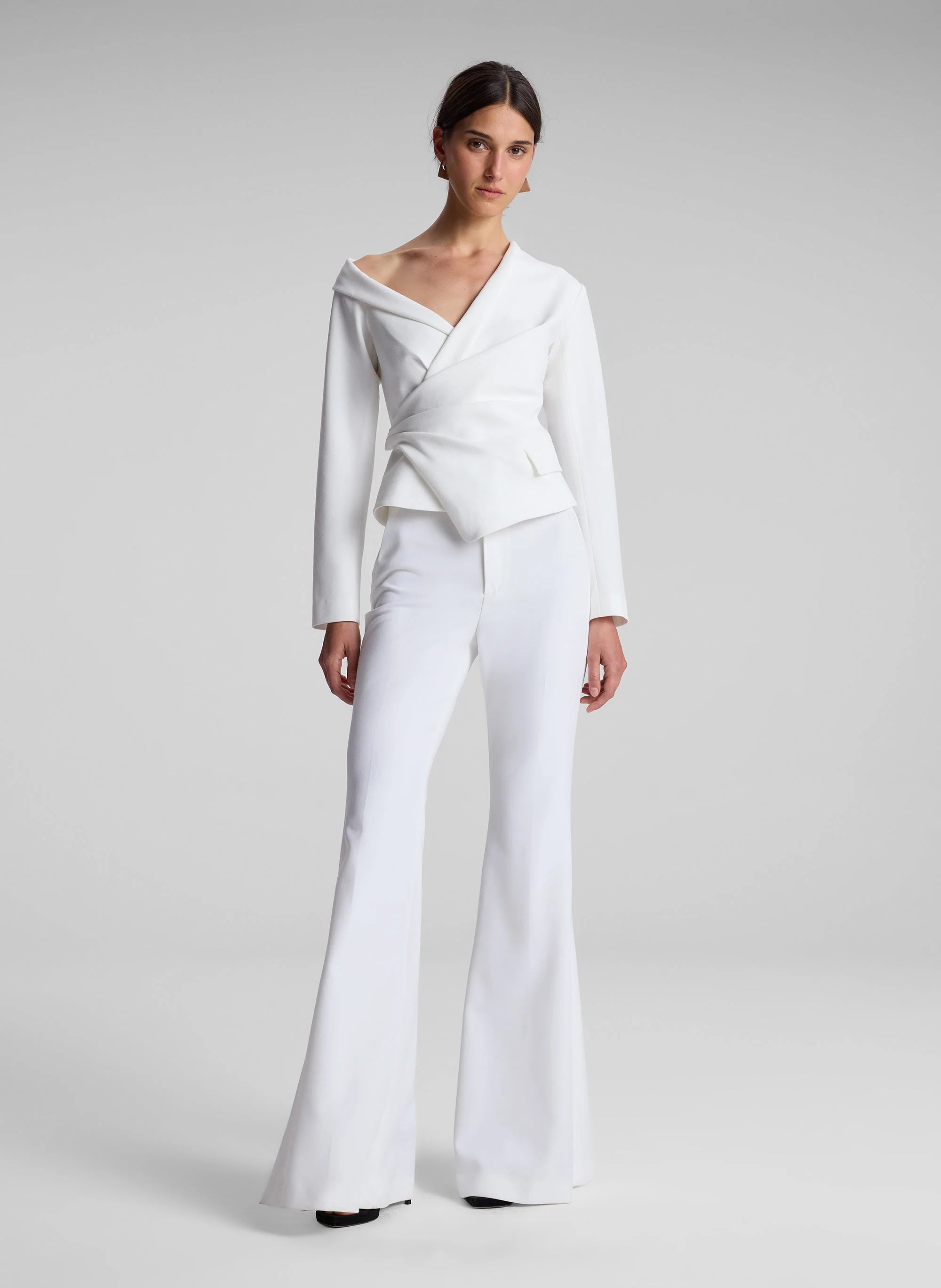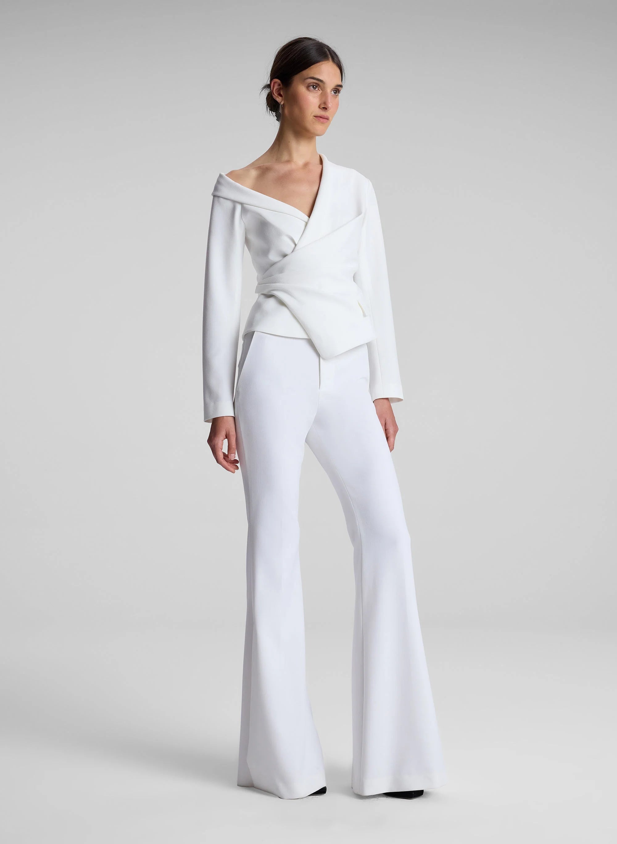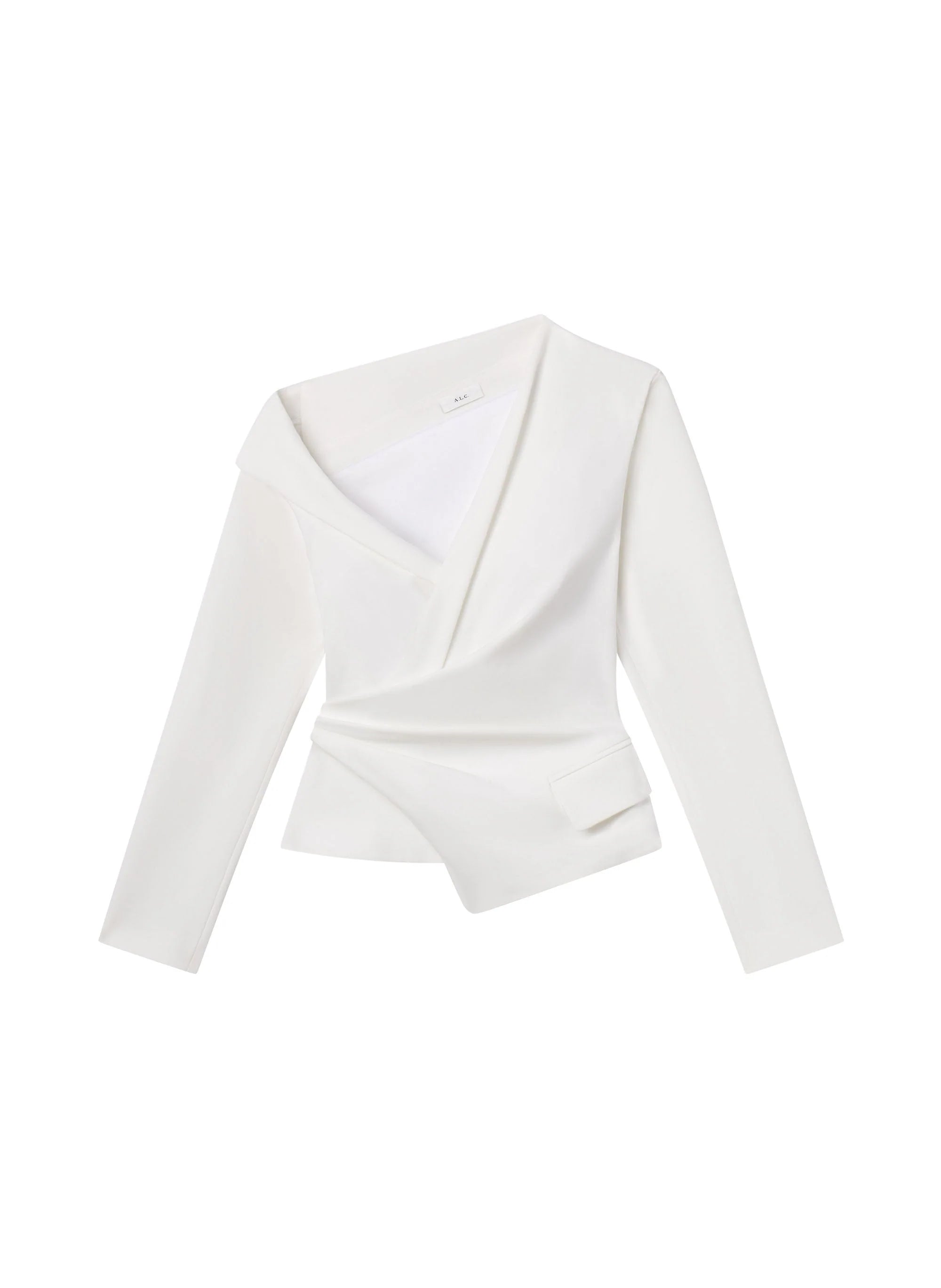 The Skyla Top is crafted of our signature suiting blend fabric in a daikon hue. This asymmetrical silhouette features long sleeves. a single off-shoulder neckline and a wrapped waist that secures with a button. This style runs small. Shop Tops.