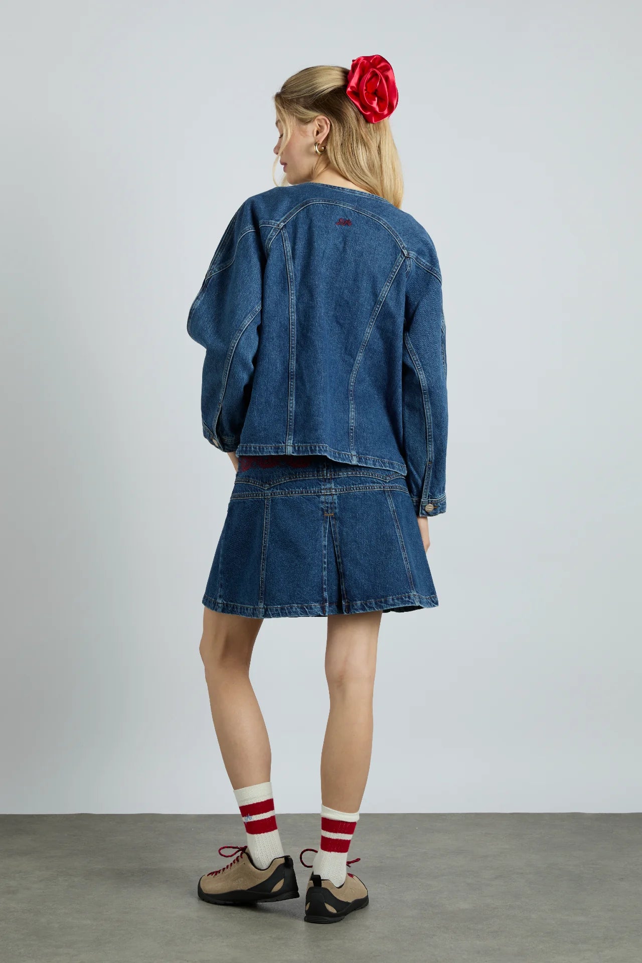 Our sloane skirt in vintage blue wash features Damson's signature red embroidery along the waist. with exaggerated pleat detailing at the front.