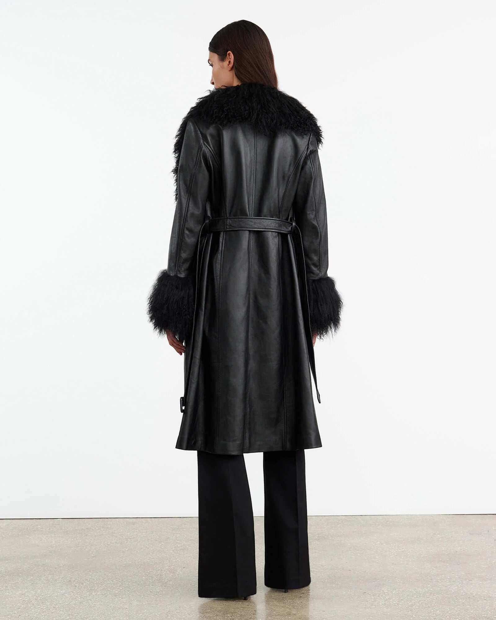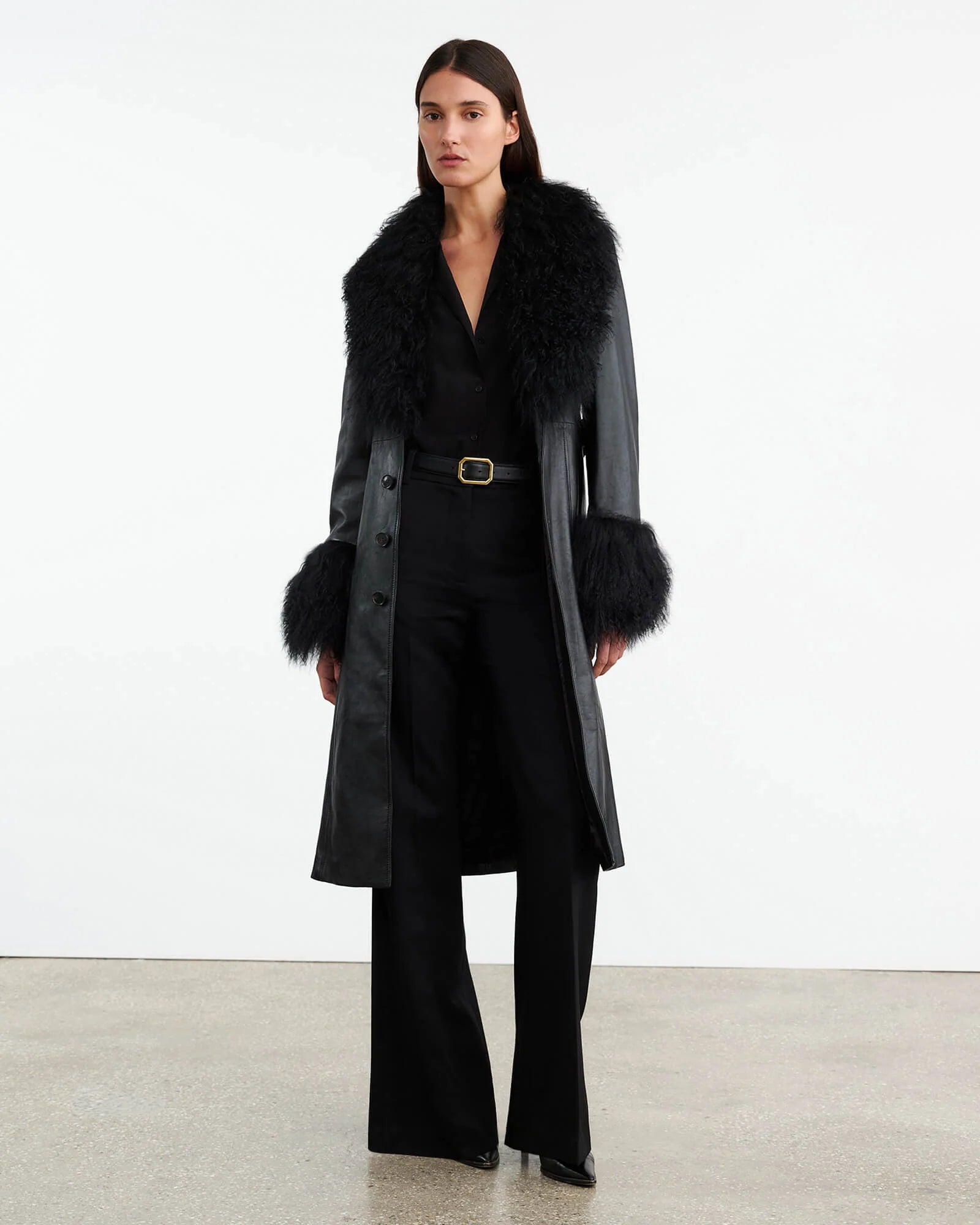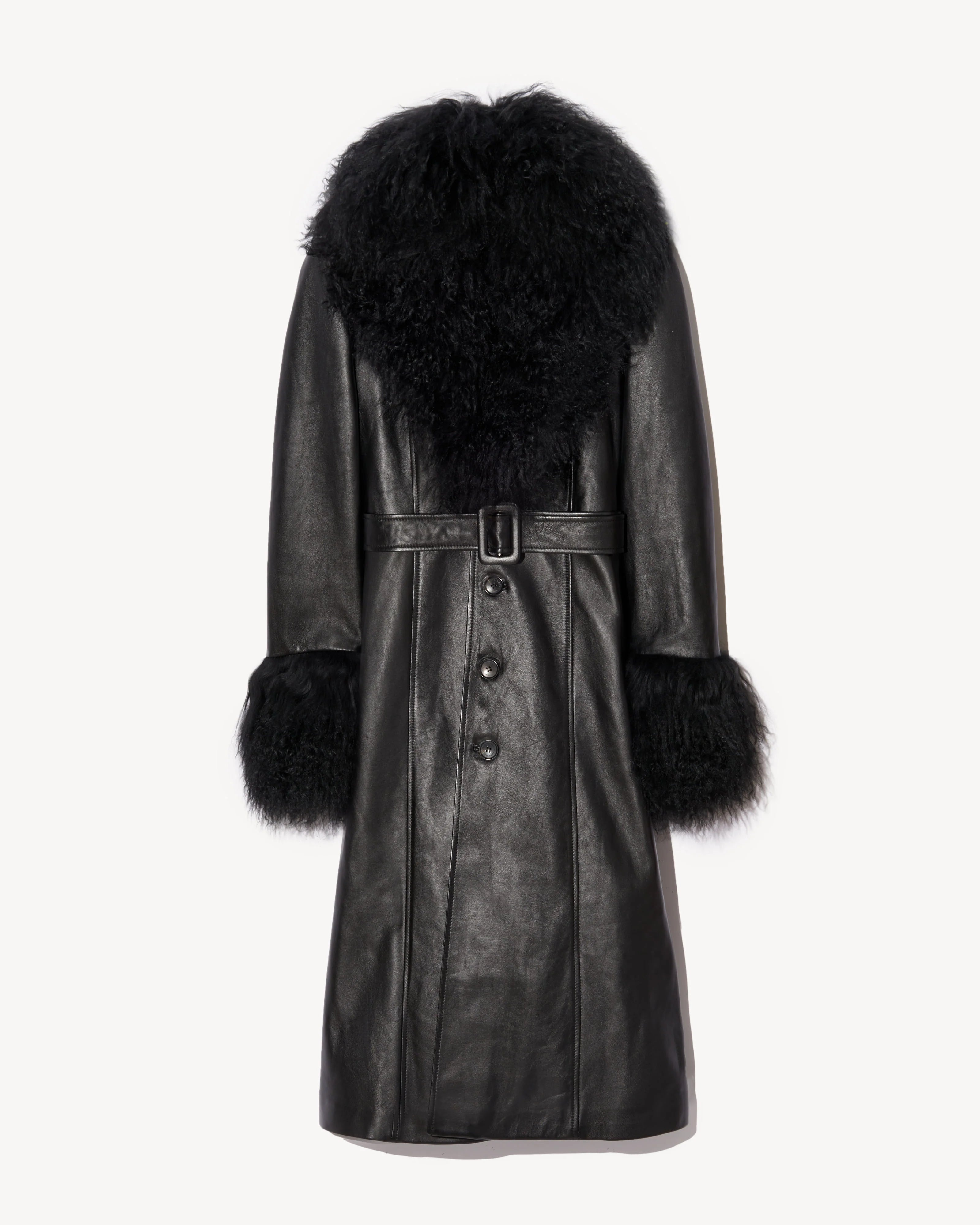 Slim fit coat in Italian leather. Turkish Mongolian shearling collar and cuff. Logo horn buttons. Tie waist belt with leather buckle. Side seam pockets. Fully lined.