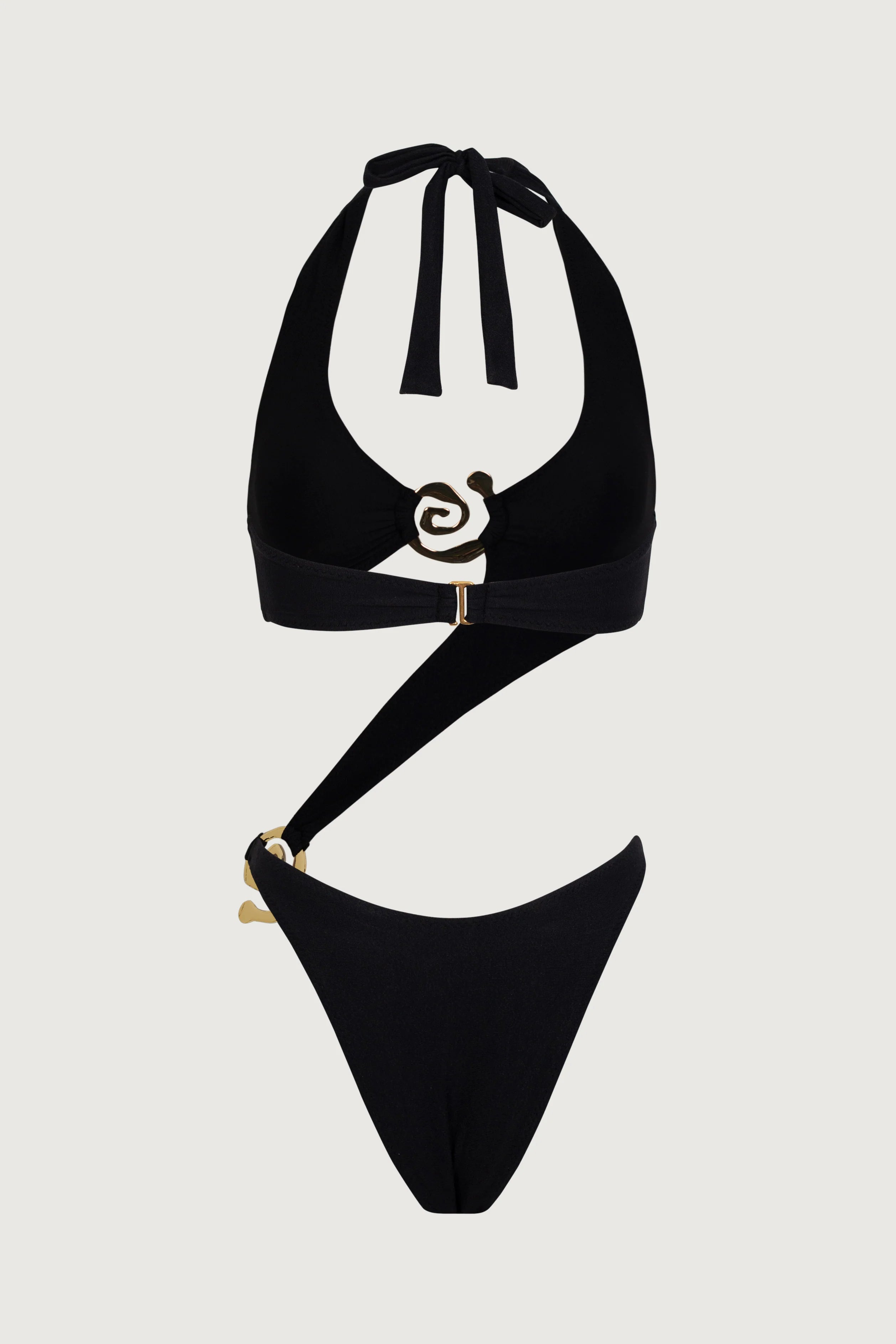 The Spiral One Piece featuring our custom gold spiral hardware and adjustable halter neck ties.