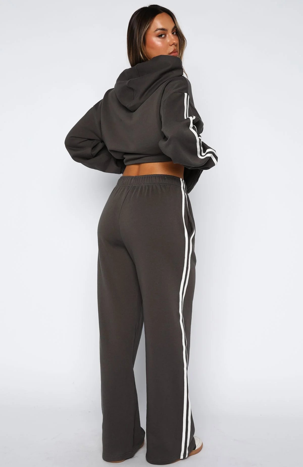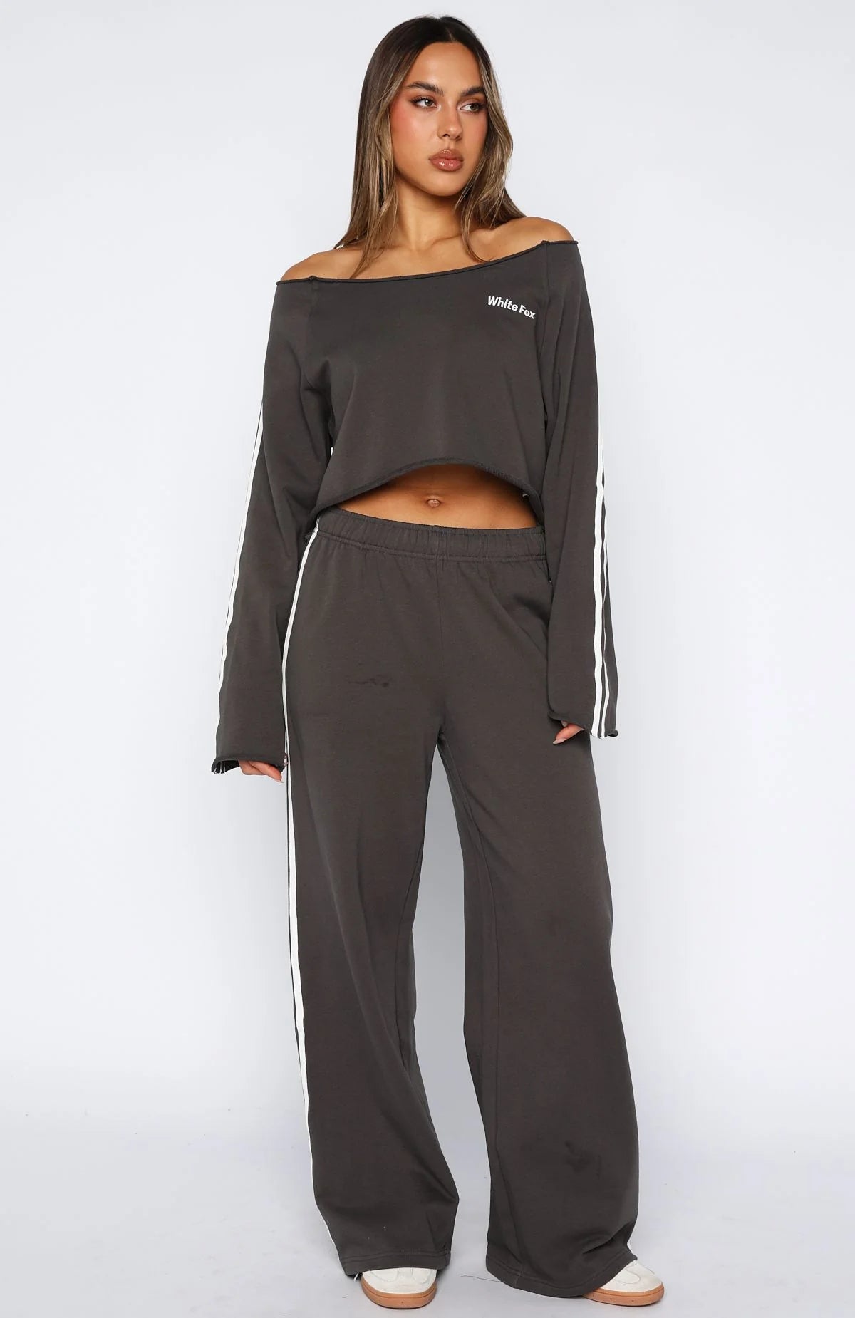 Impress all in the Star Student Wide Leg Sweatpants in Charcoal! Features a thick waistband with internal drawstring, side pockets, stitched White Fox text on side, front double stripe detailing, loopback fabric and wide leg design. Pair with the matching Star Student Oversized Hoodie or Star Student Cropped Off Shoulder Sweater for the perfect studying fit!
