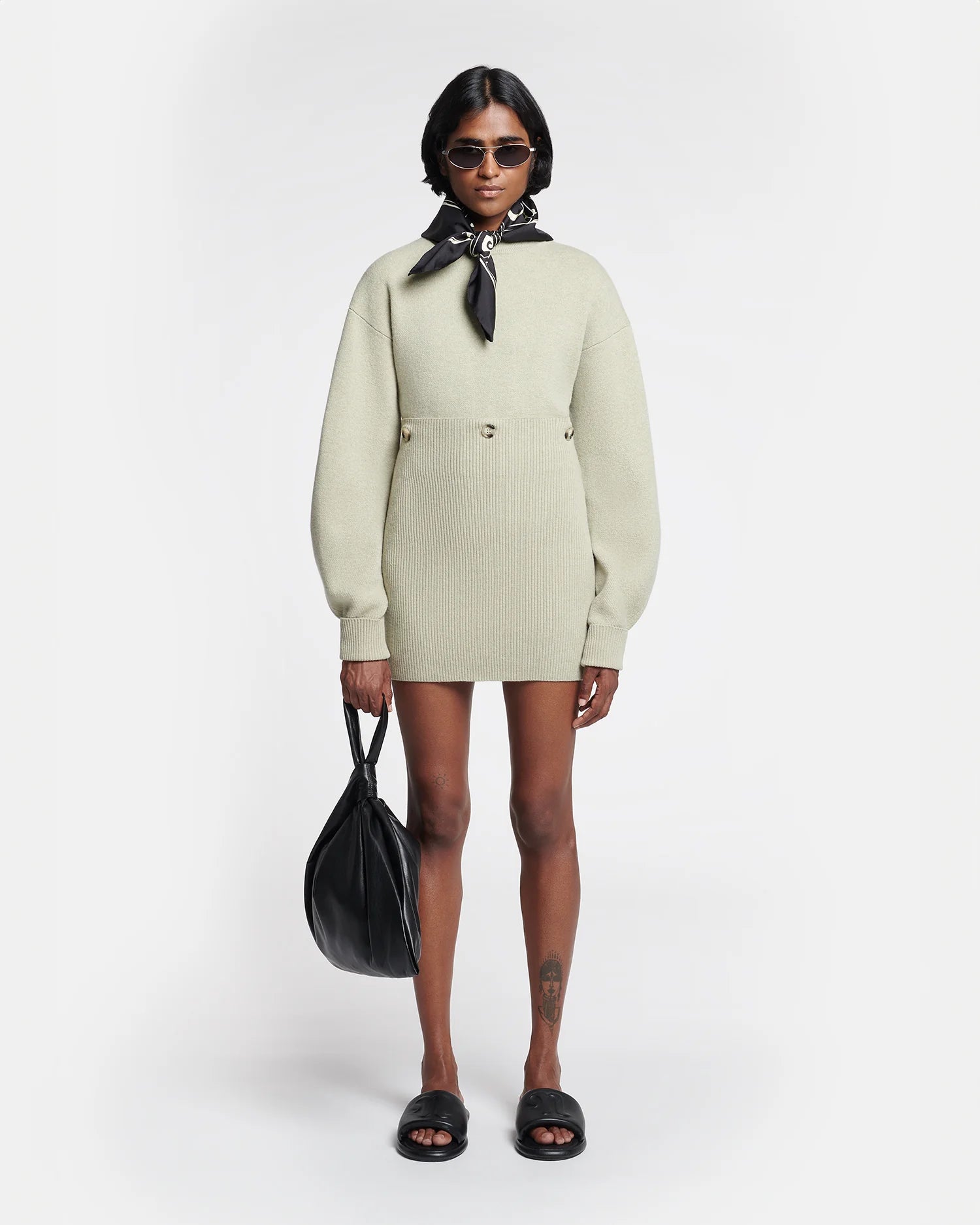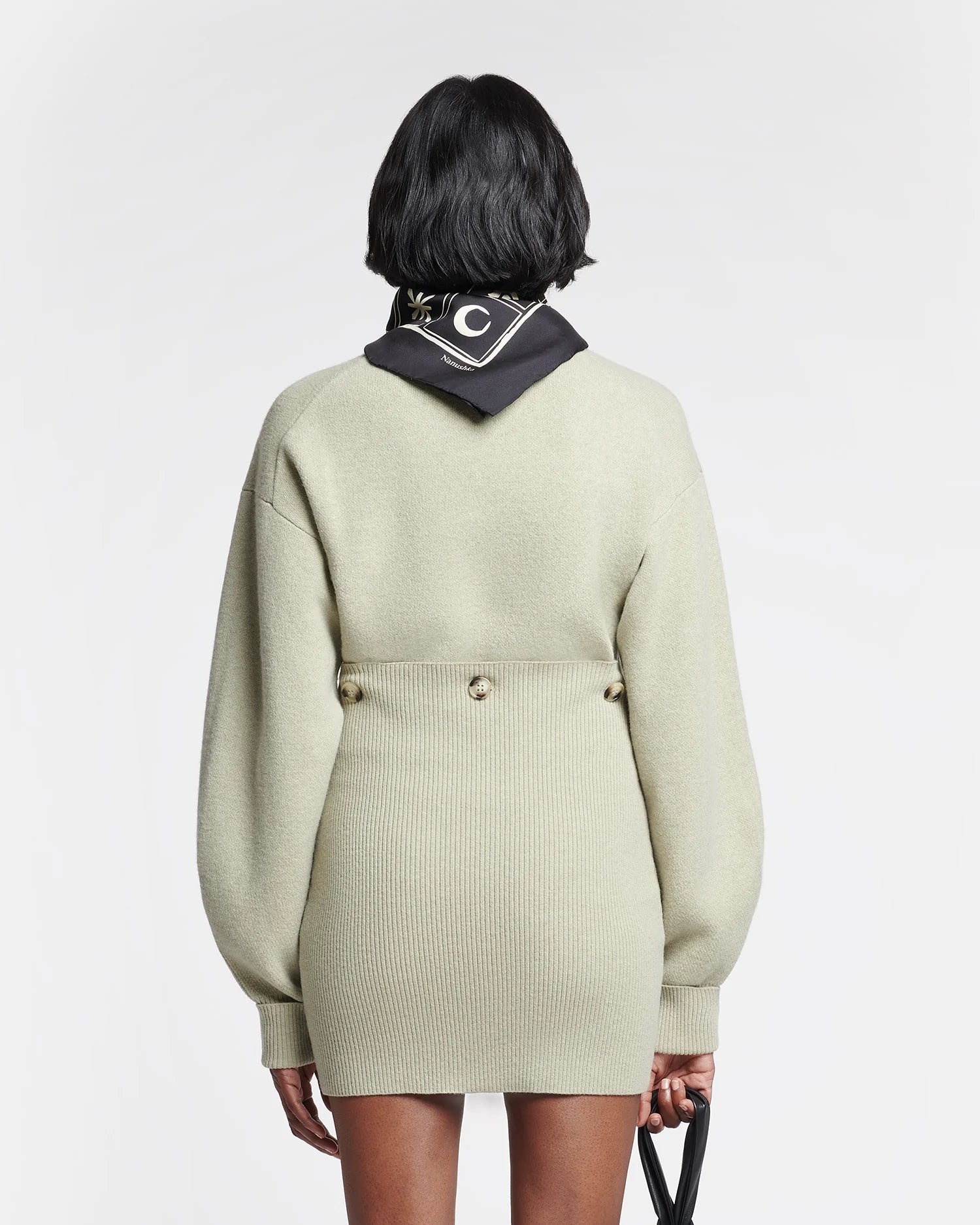 The Strahe dress demonstrates our interest in modularity. ensuring endless styling versatility. Made from soft compact merino wool. it can be unbuttoned at the waist to create a sporty cropped sweater. The stone hue just adds to its wearability.