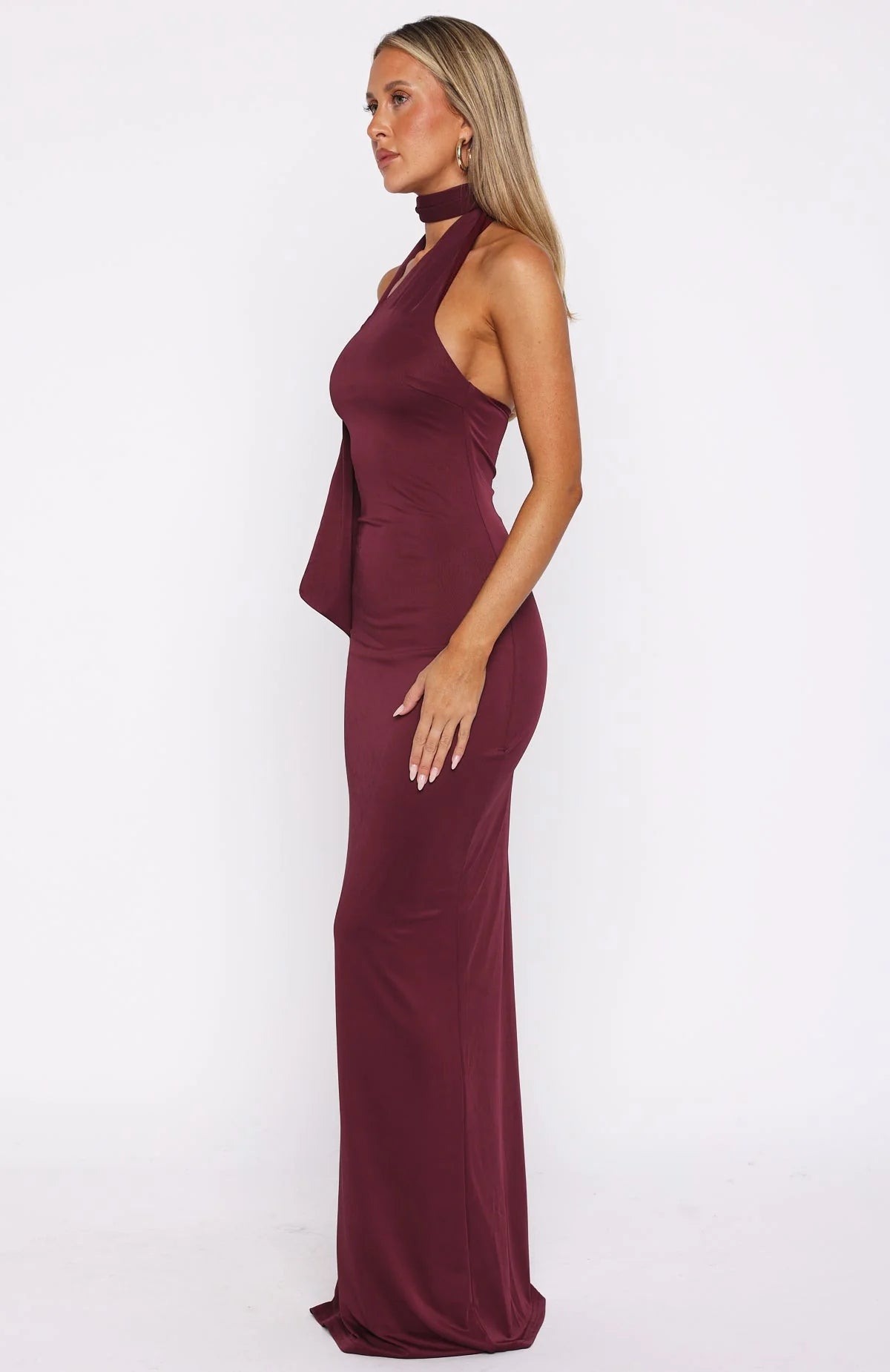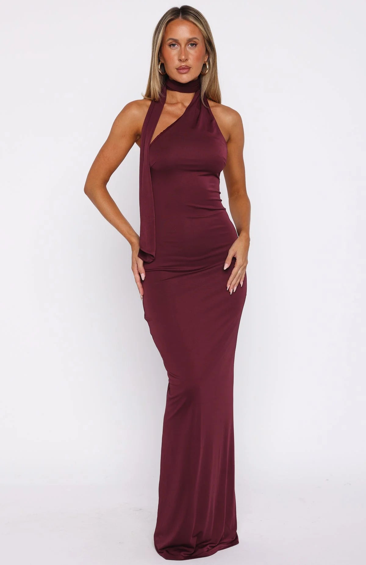 Drape yourself in confident glamour with our Sugar High Maxi Dress in Burgundy. This captivating maxi features an elegant one-shoulder silhouette with an attached neck scarf, a figure-hugging, backless design, and full lining for flawless fit and comfort. Finish the look with kitten heels and minimalist gold jewelry for a striking, unforgettable ensemble.