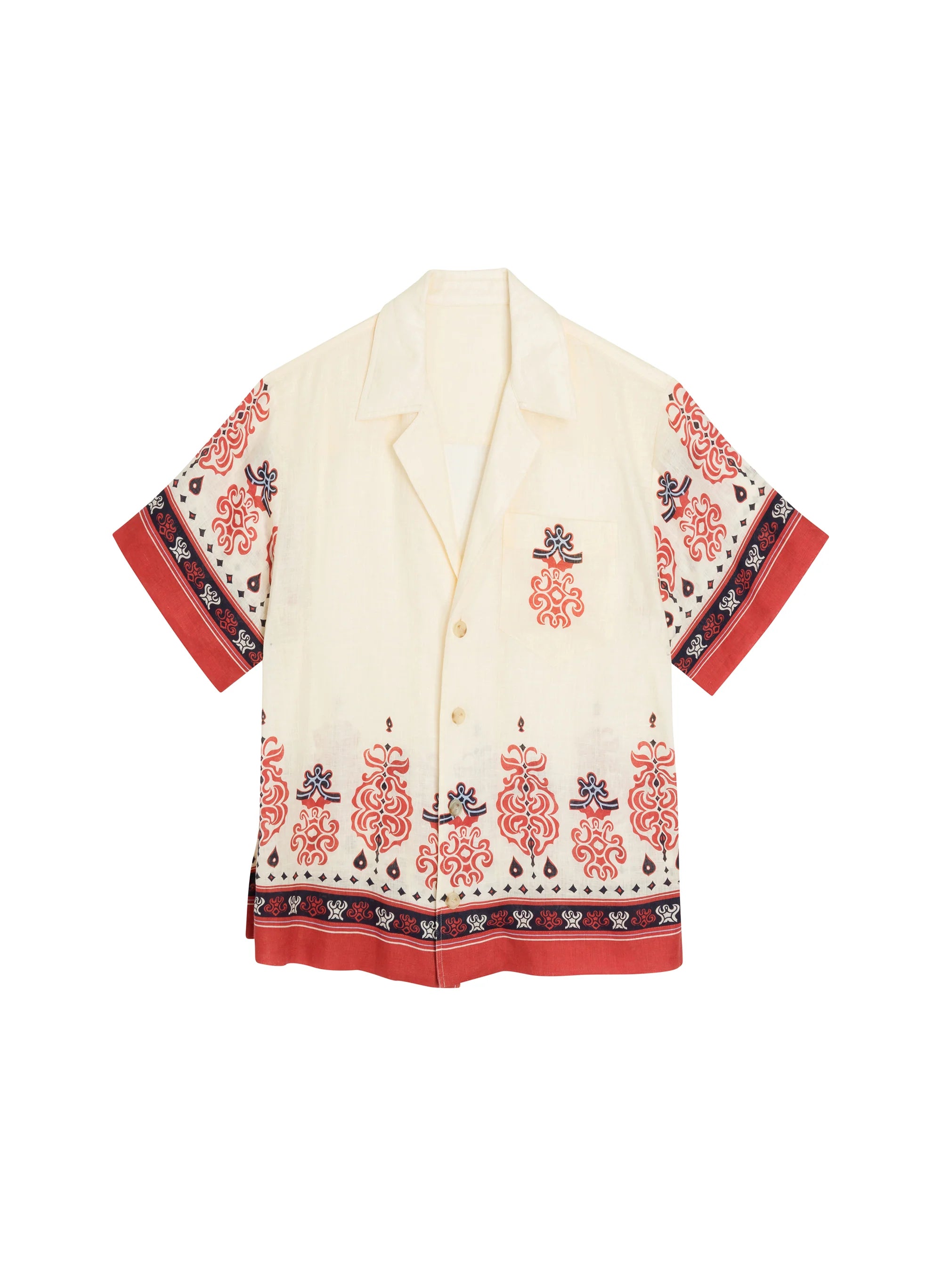 The Sullivan Top is crafted in our Pellicano print lightweight linen in a cream and spice color palette. This short-sleeve silhouette features a boxy fit with a pattern-adorned chest pocket. This style runs true to size. Shop Swim.
