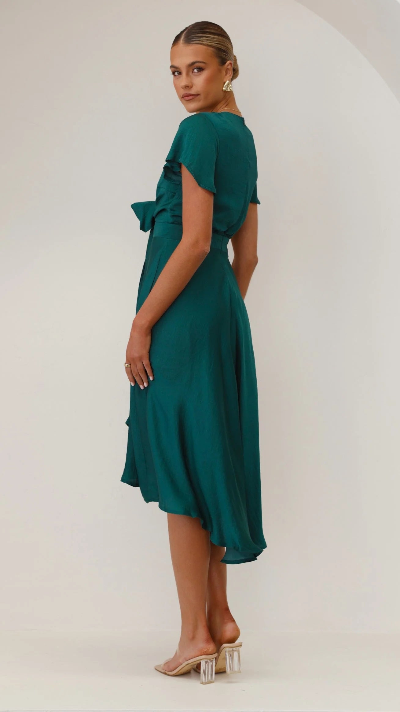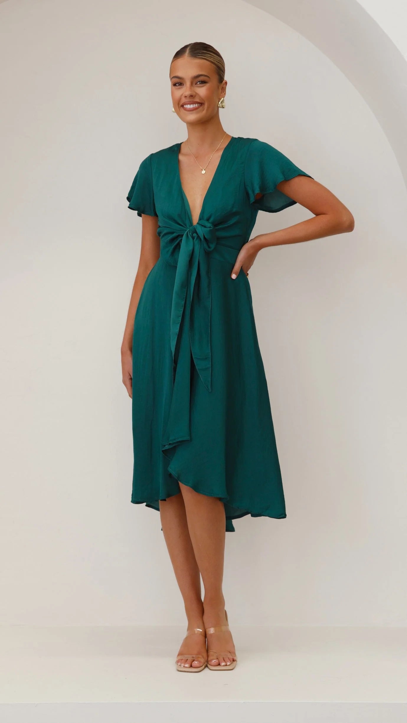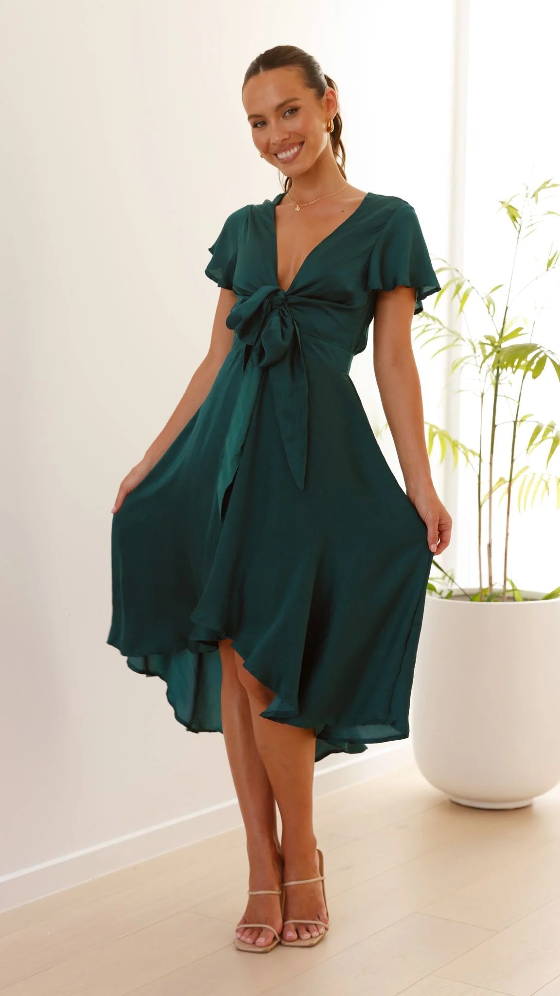 Our Sunny Daze Dress is a must have occasion piece, perfect for that upcoming party or wedding! This dress features butterfly sleeves, a soft satin feel and high low flowy skirt with a tight waistband. This piece will be your go to dress for impressing at any event, we suggest pairing with our and to finish the look.