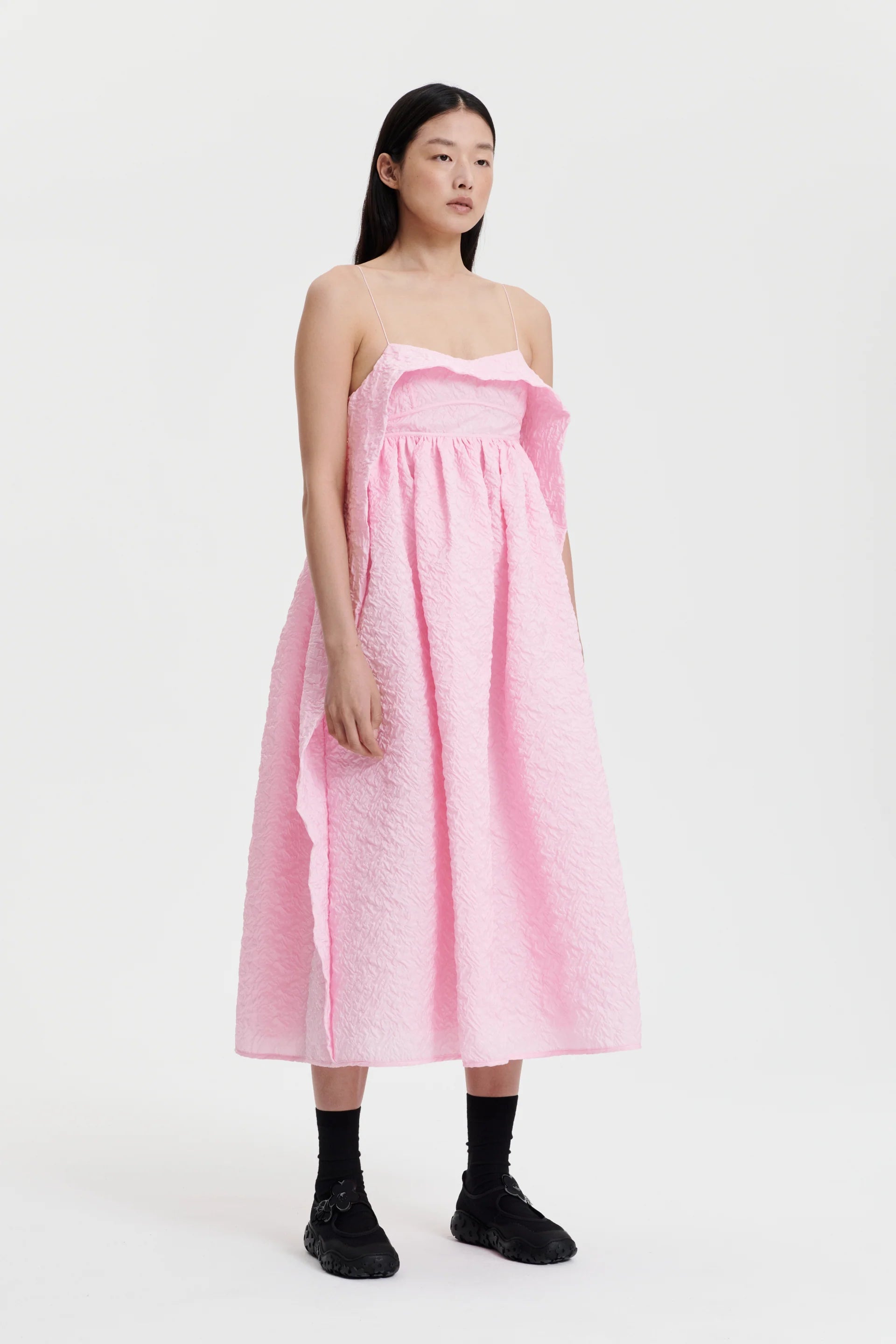 The Susa Dress. an elegant gown. expressing fluid form and classic feminine silhouettes. Crafted from a pink grappolo matelassÈ. the dress is composed of an empire waist bodice. distinguished with a cascading drape falling into the skirt. Sitting on delicate straps on the shoulders. finished with an open back for an added intrigue.