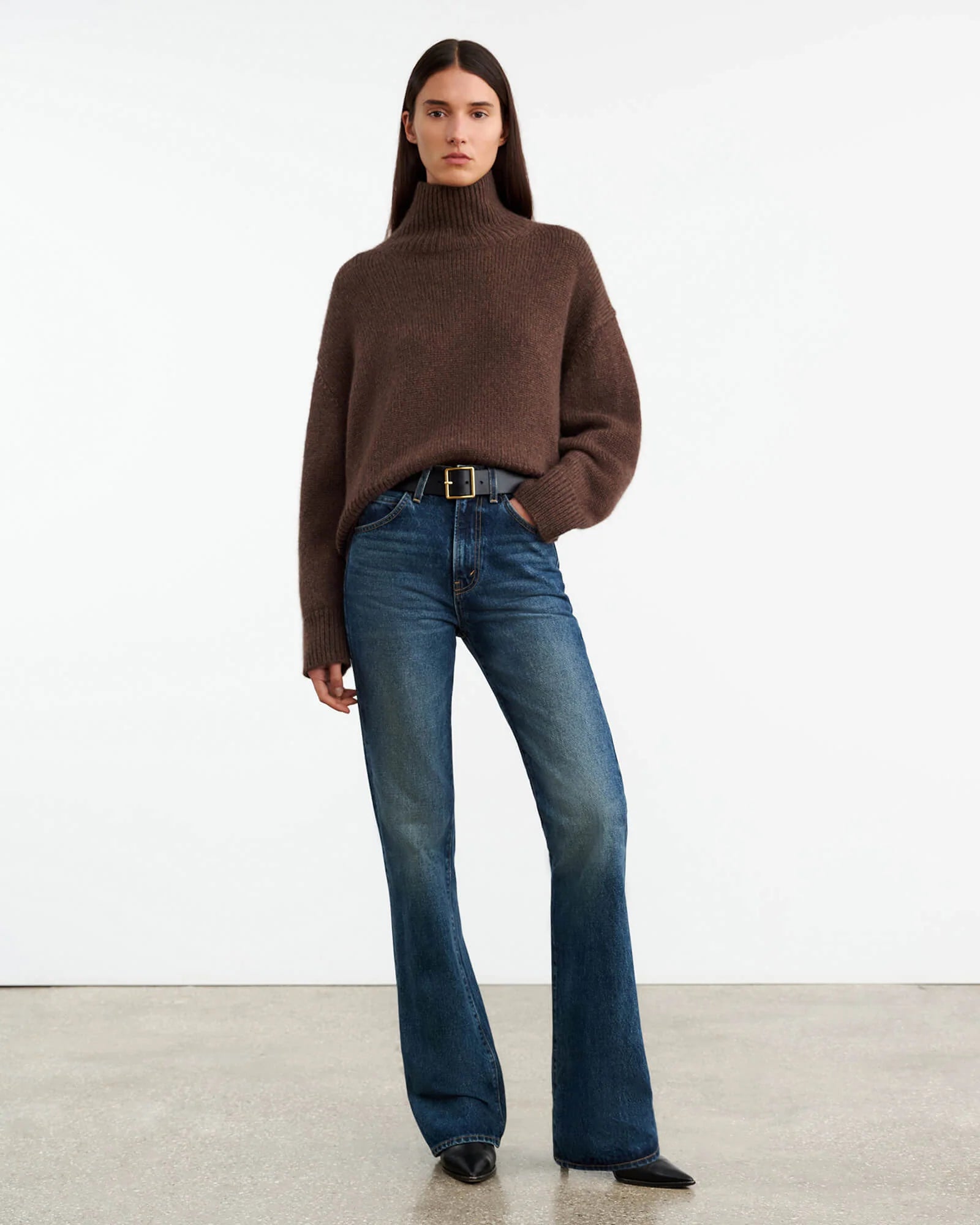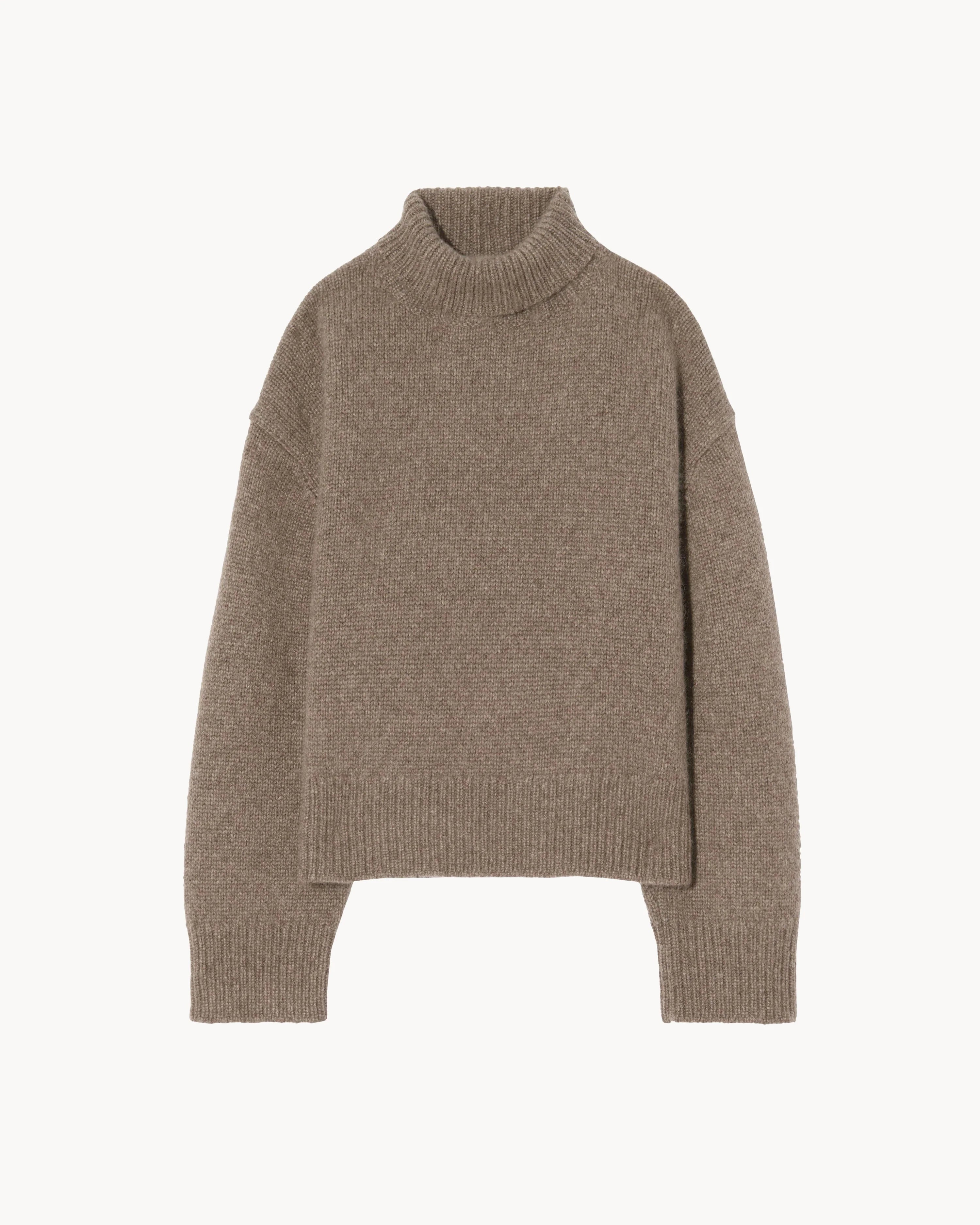 Chunky weight boxy turtleneck in Italian cashmere. High neck designed to be worn up. but easily able to fold over. Dropped shoulder. Rib start at hem and sleeve. Fashioning along arm hole. Signature center back cable knit detail.