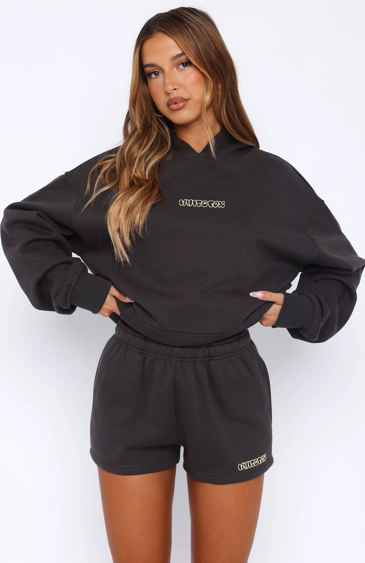 Cozy vibes, now made even cuter with the Take A Guess Lounge Shorts Charcoal! Featuring a loose relaxed fit with an elasticated high waistband with inner drawstring, side pockets, soft fleece fabric for extra comfort and logo front side. Team with your favourite lounge hoodie and snug boots!