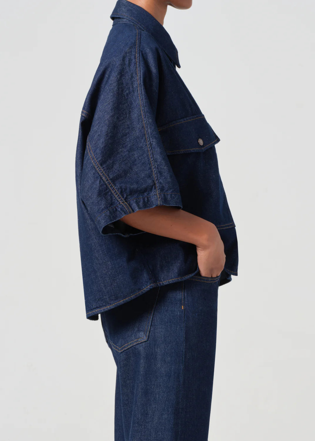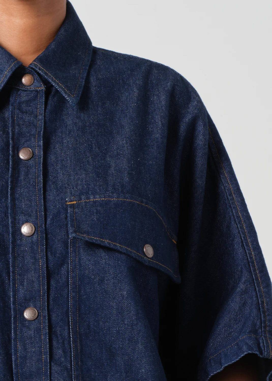 Looks Like: Clean dark rinse indigo short sleeve button up shirt