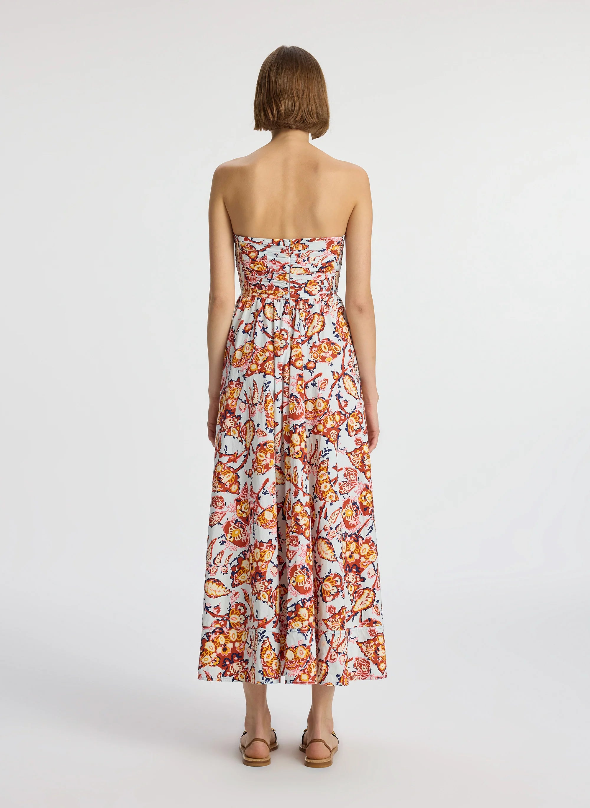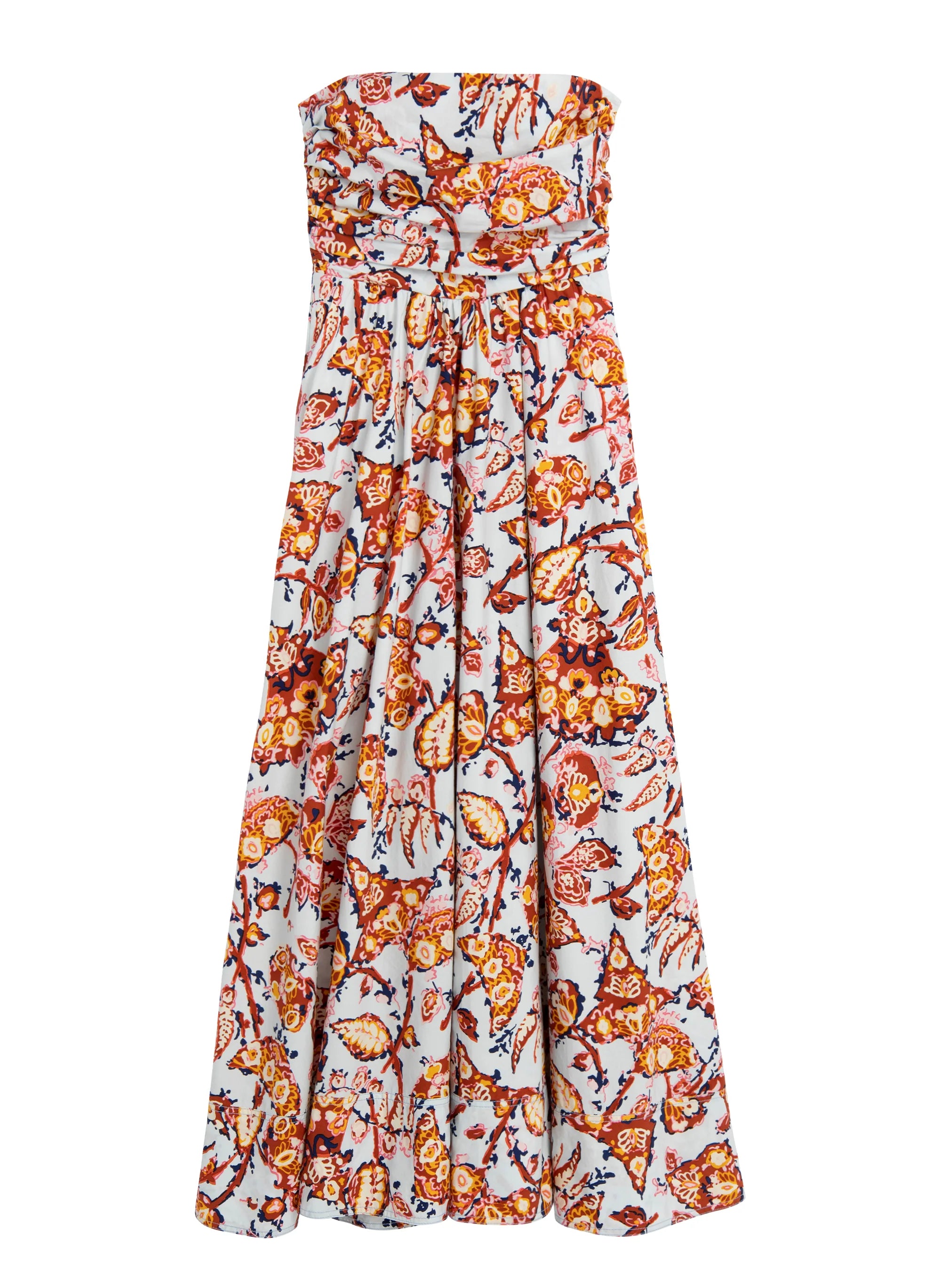The Tate Dress is crafted from our washed easy day cotton fabric in a golden and blue floral motif. This strapless silhouette is beautifully pleated and gathered with smocking at the sides and a full midi skirt. Pockets and gum lining at the bodice complete the look. This style runs large. Shop Dresses