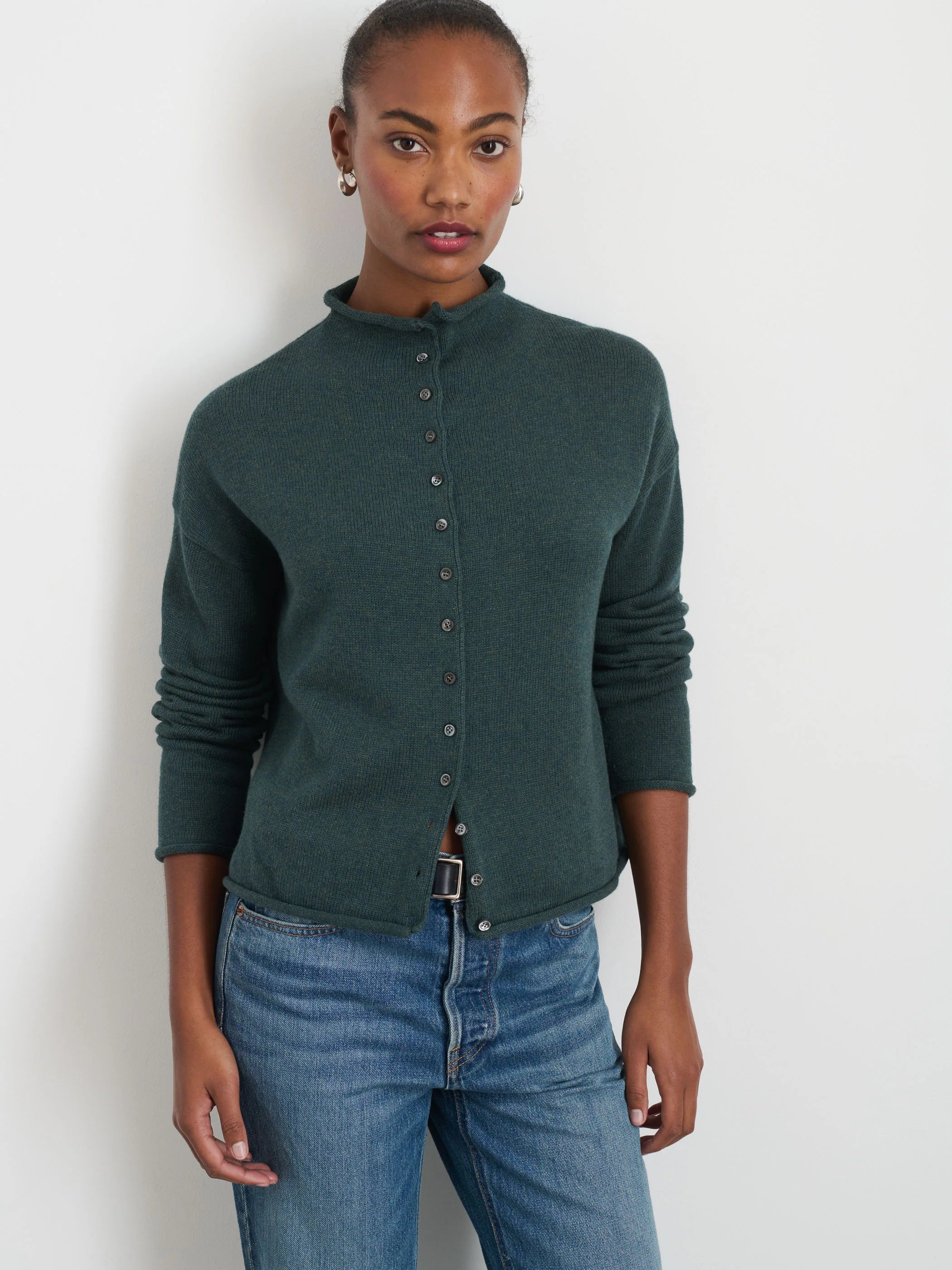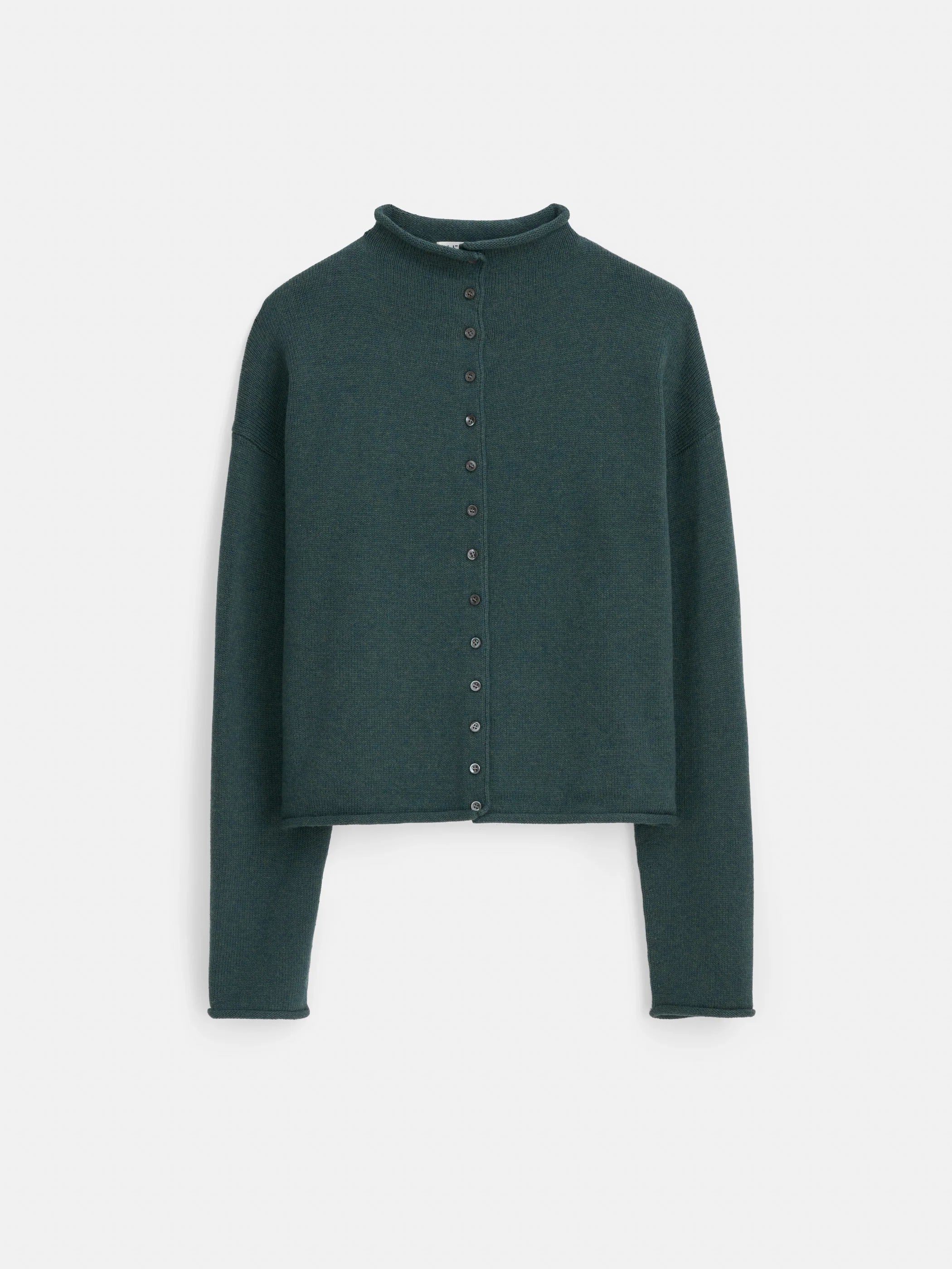 The perfect cardigan-you-can-wear-as-a-top in supersoft cotton-cashmere. The fit is drapey with a cool roll-edge detail.