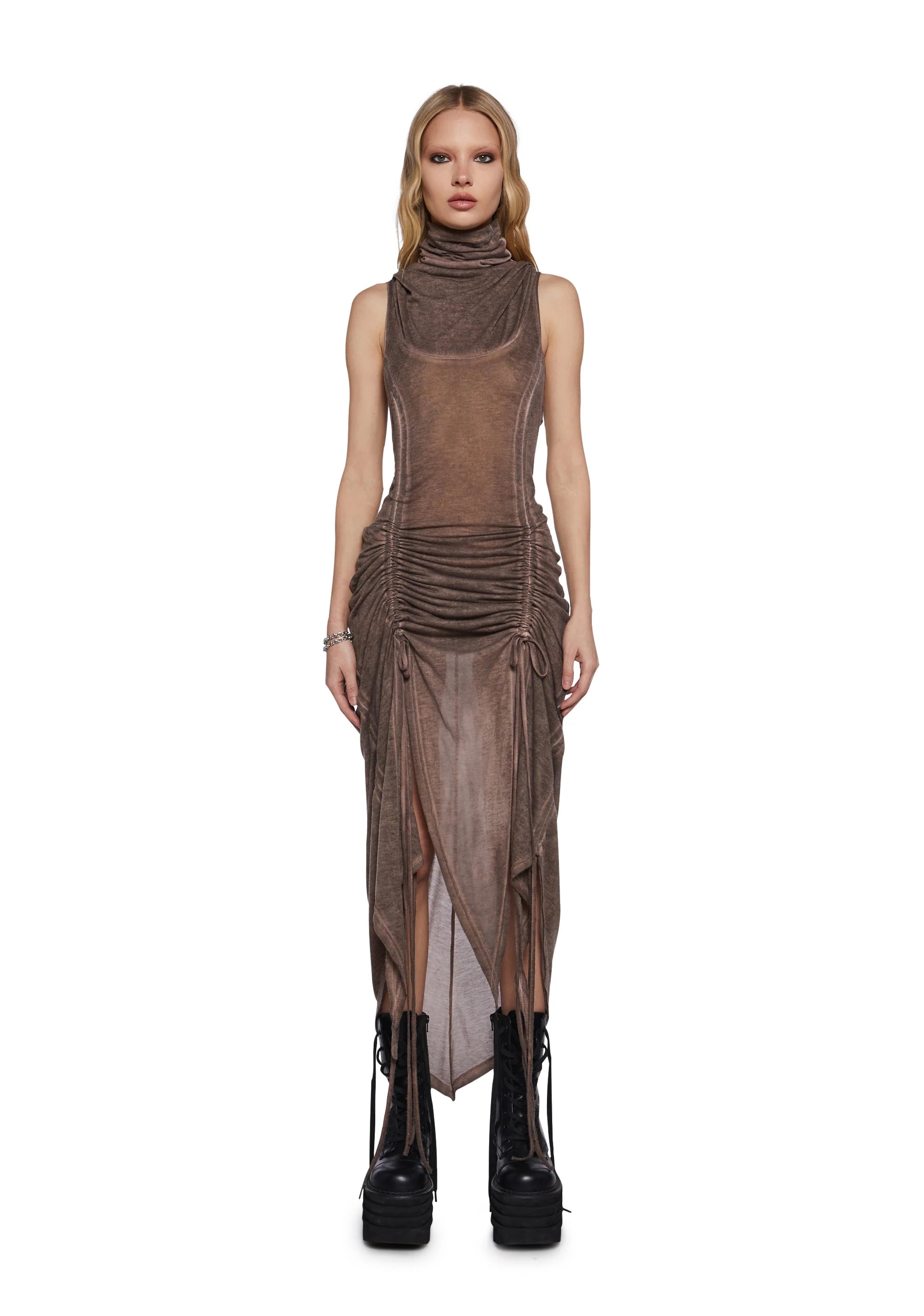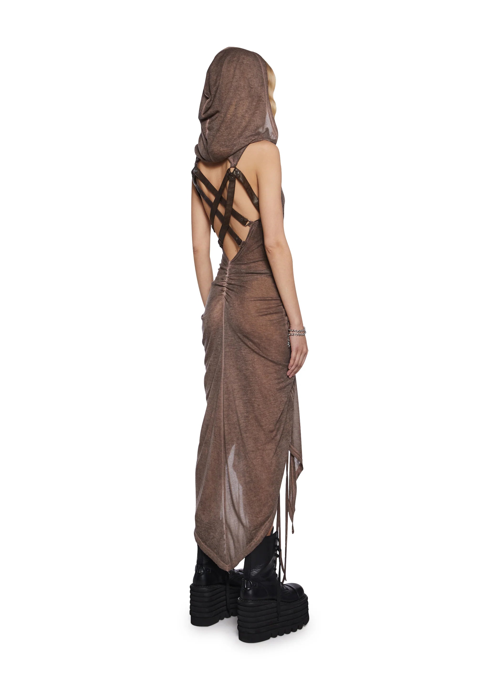 in semi-sheer jersey construction with a fabric finish and raw edge hems. Vegan leather harness design on back, hooded detail with cowl neckline that can be pulled up into a mask, and ruched seams with drawstrings for adjustable length. Fabric is delicate and may have imperfections.