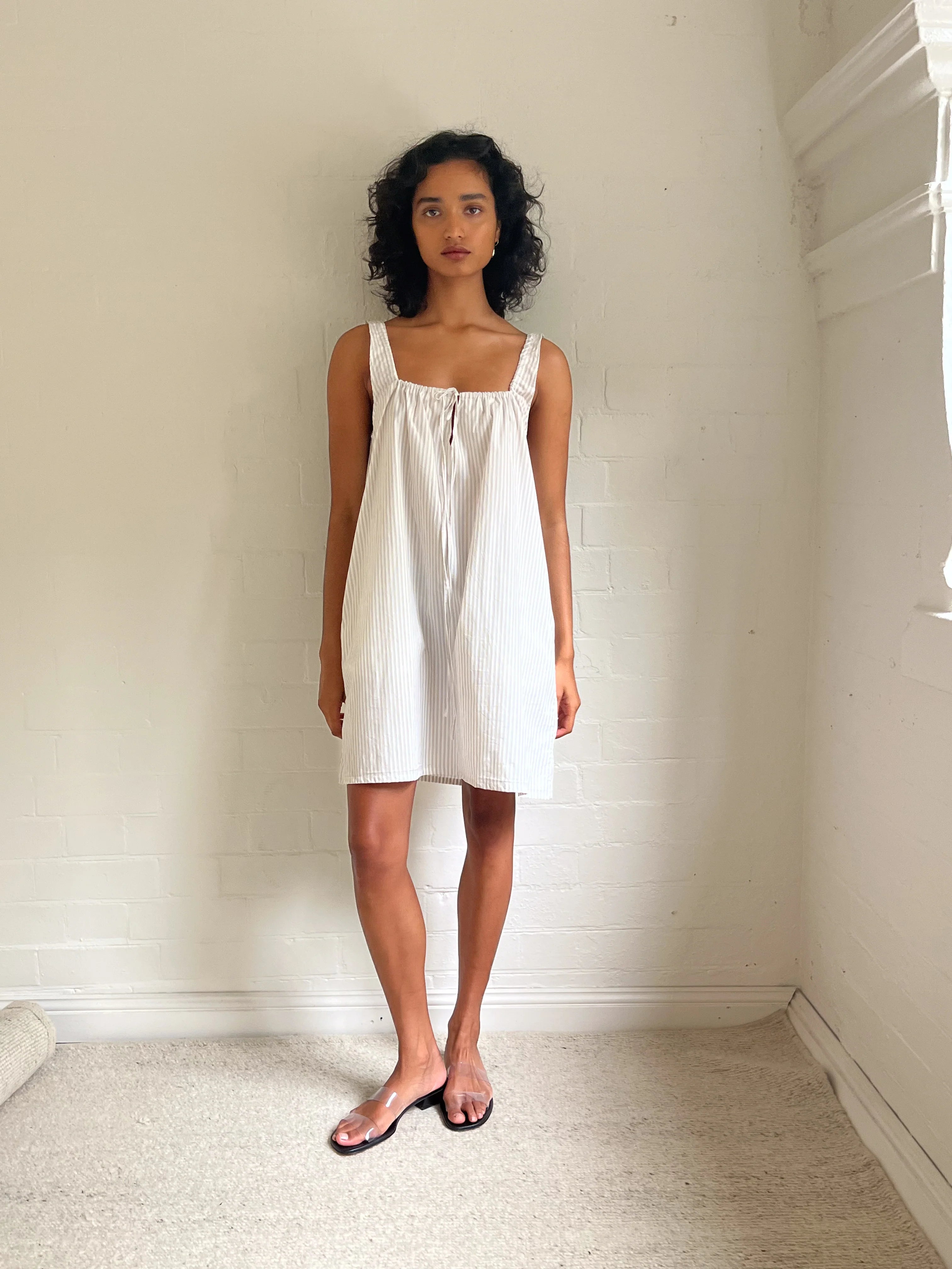 a crisp and lightweight mini-length dress features a flattering gathered square neckline with keyhole and tie front feature and side seam pockets