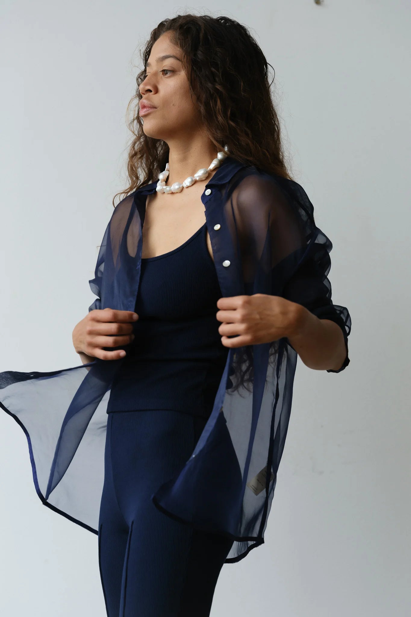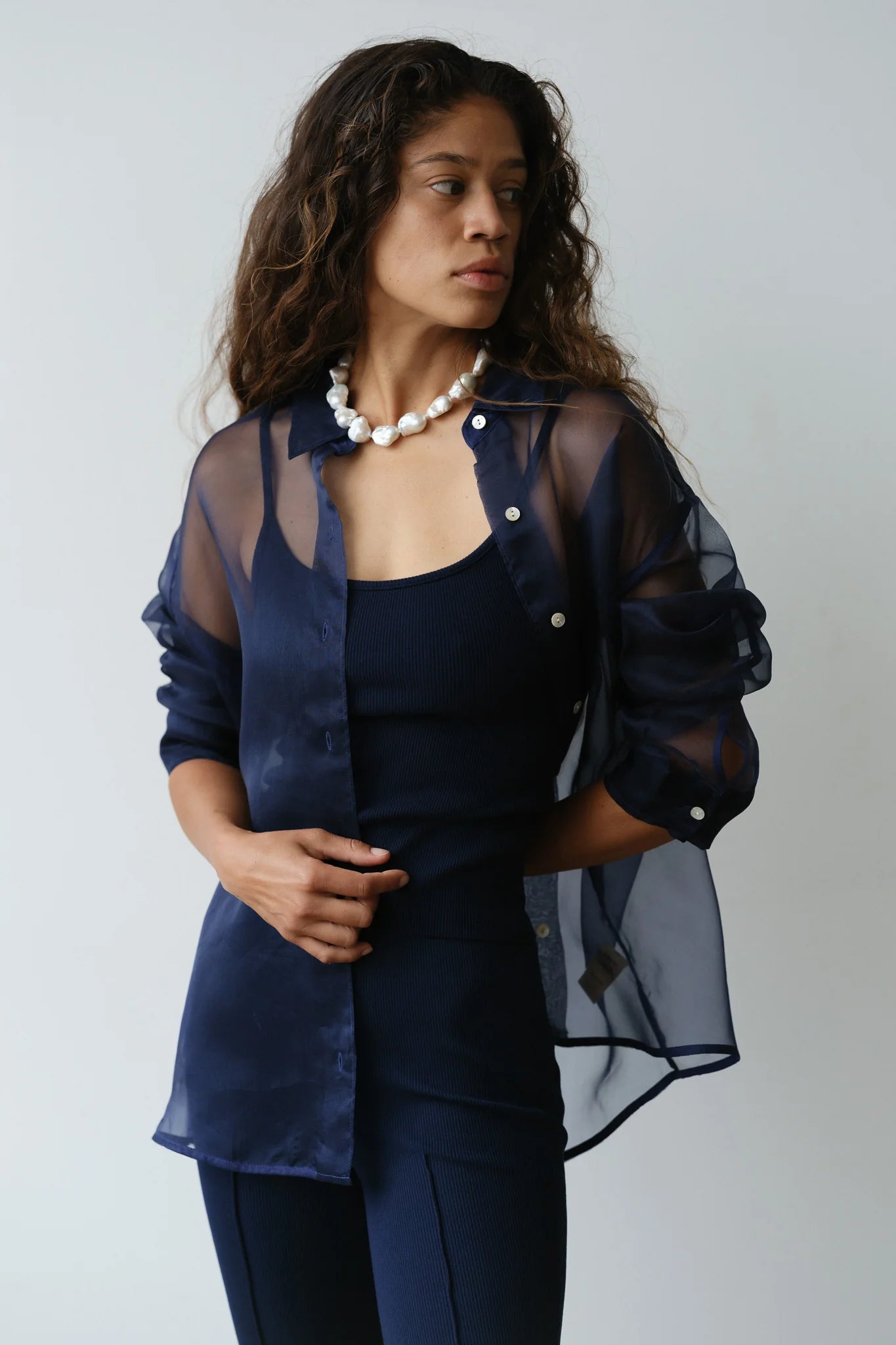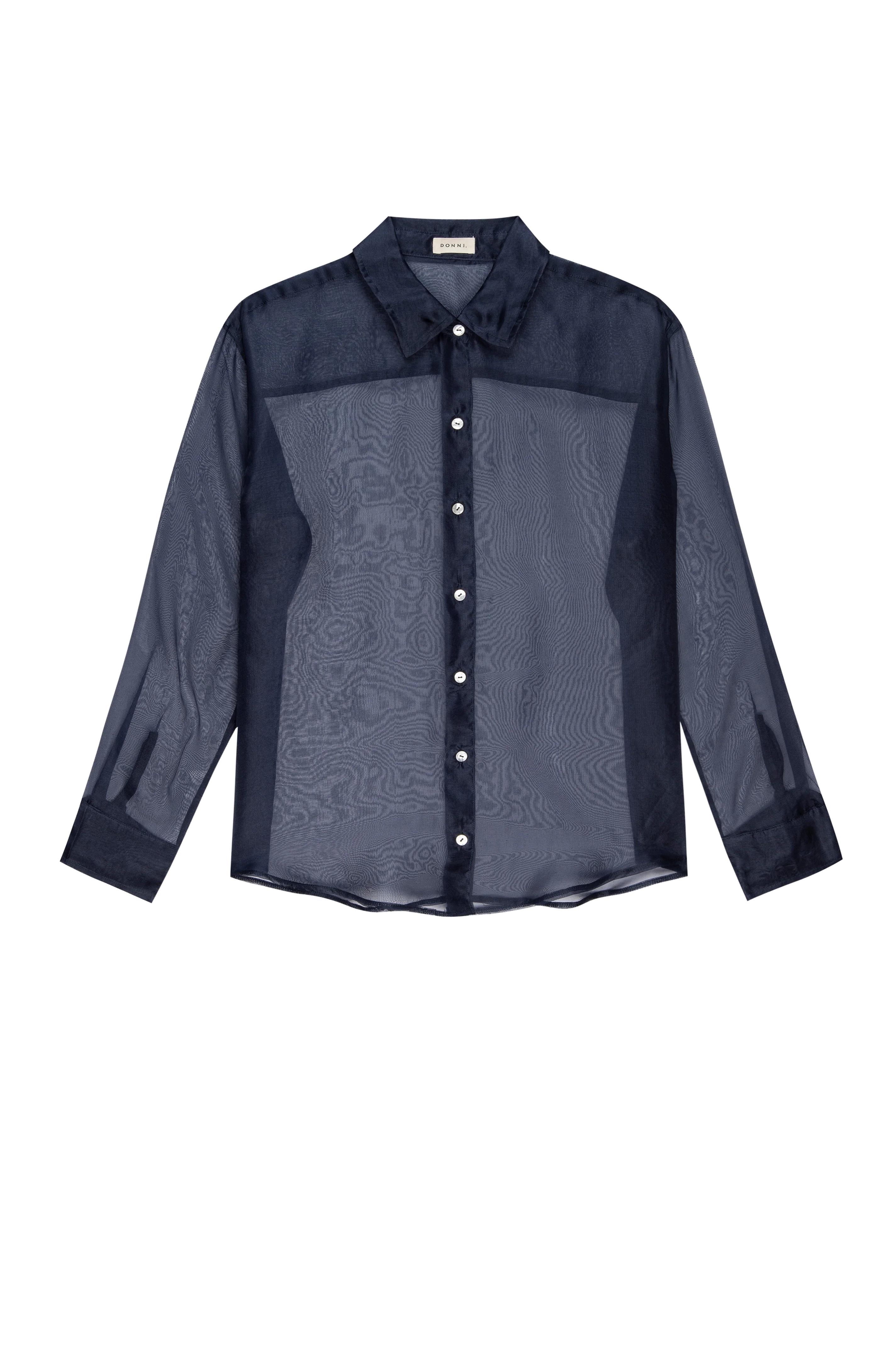The Organza Shirt is crafted from 100% silk. We love this top worn on it's own or as a light jacket. It features. mother of pearl buttons. dropped shoulders. and a relaxed fit.