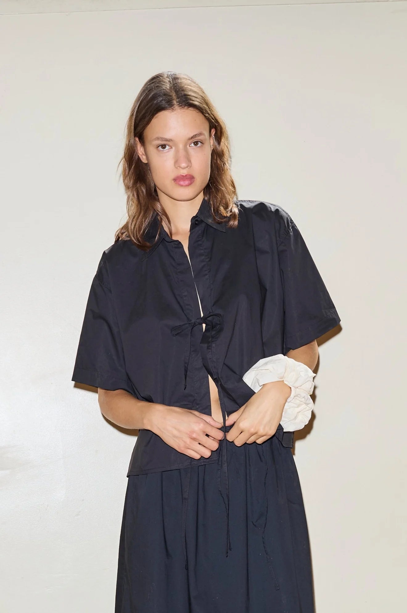 the oversized box fit shirt features a double tied front placket. dropped back yoke and dropped shoulder with back pleats and wide sleeves for a relaxed fit