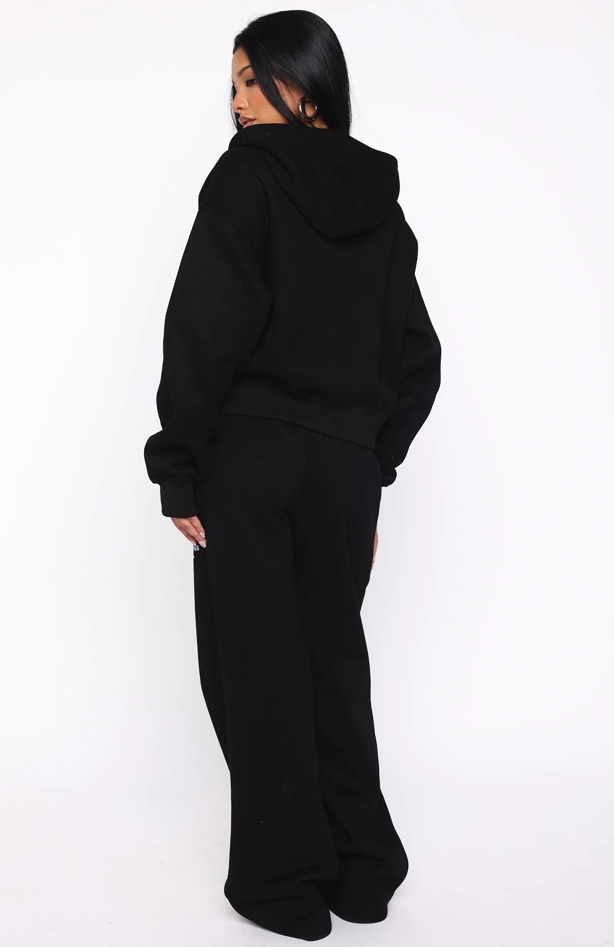 The Through Thick And Thin Wide Leg Sweatpants Black redefines loungewear with a dainty edge. Designed with a thick elasticated waistband featuring an internal drawstring tie, and a wide-leg silhouette. The cursive White Fox embroidered text at the side adds a signature touch, while the unlined fleece interior ensures a cozy feel. Style with the matching Through Thick And Thin Boxy Hoodie Black.