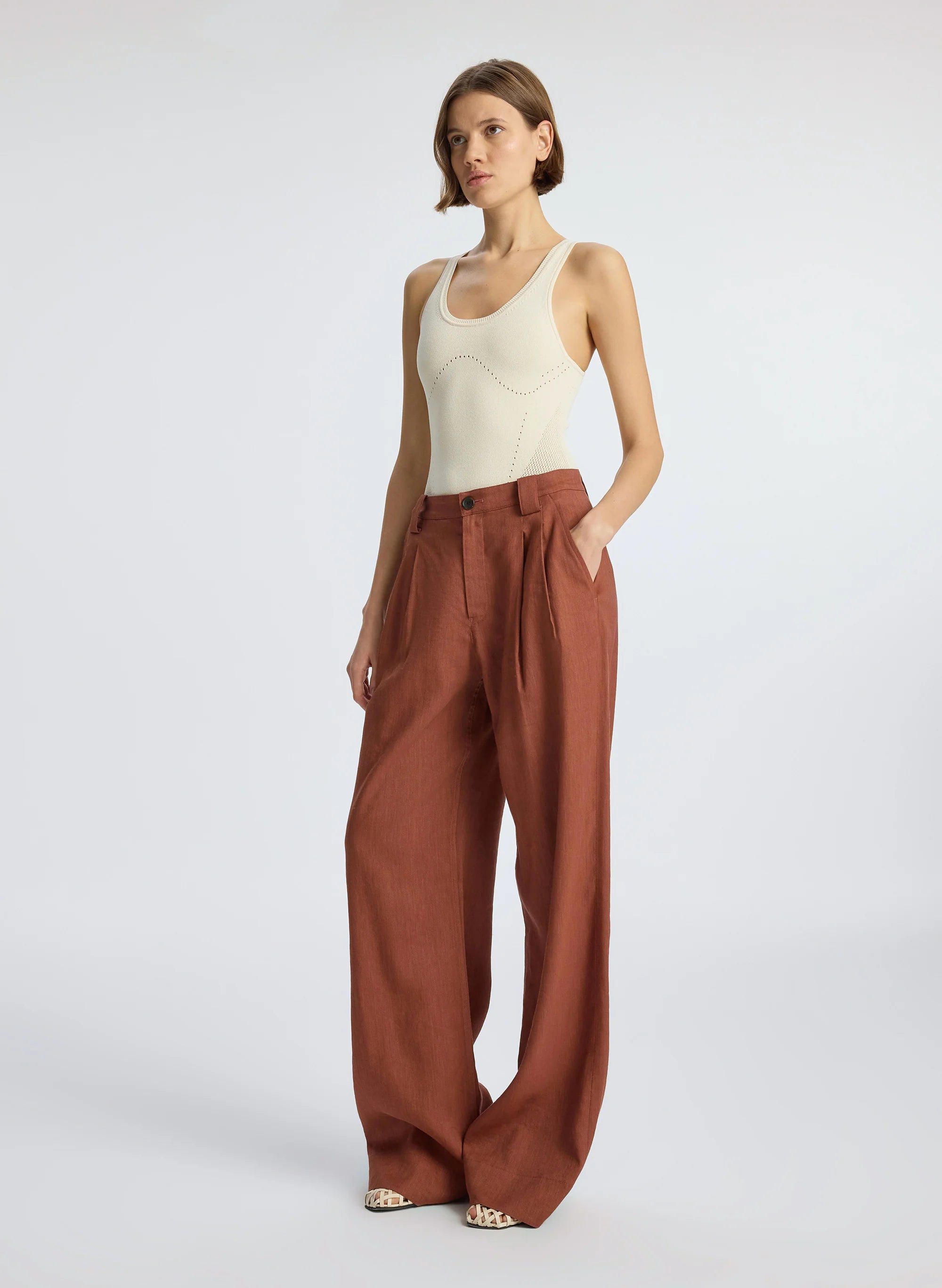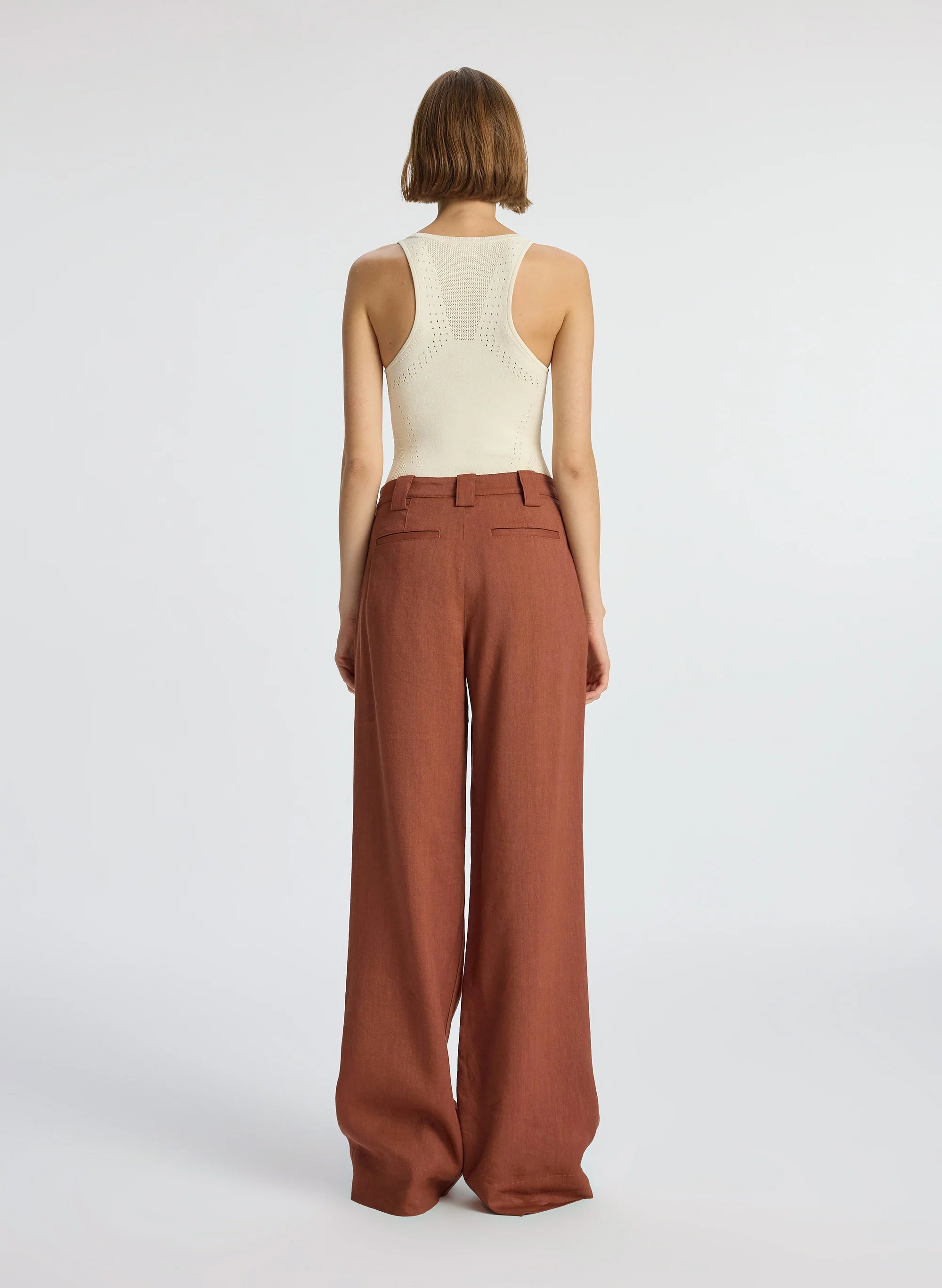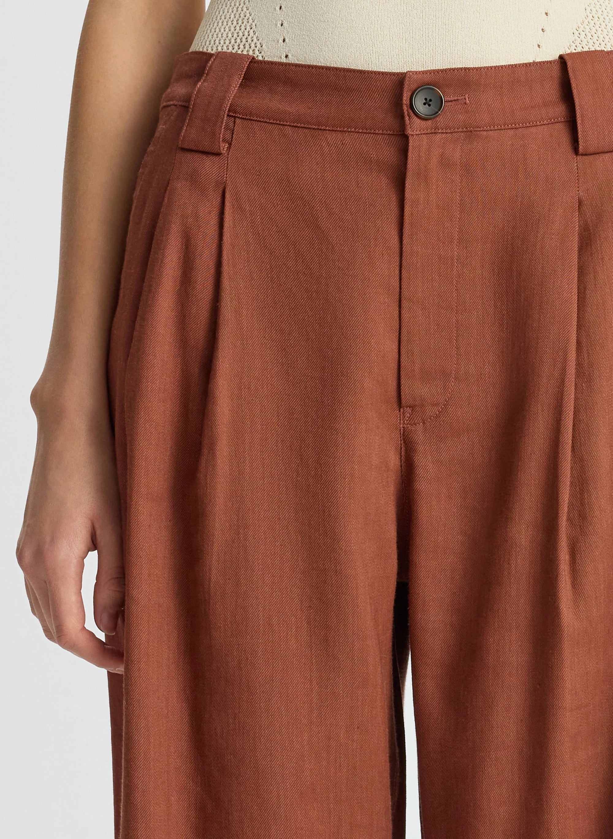 The Tommy II Pant is crafted from our airy linen-viscose blend fabric in a rust-red hue. Offering slightly less volume at the thigh than our Tommy Pant. this wide-leg silhouette features front pleats. side slash pockets and back welt pockets with a mid rise fit meant to sit right at the hips. A.L.C. suggests sizing down if a higher rise fit is preferred. This style runs large. Shop Bottoms