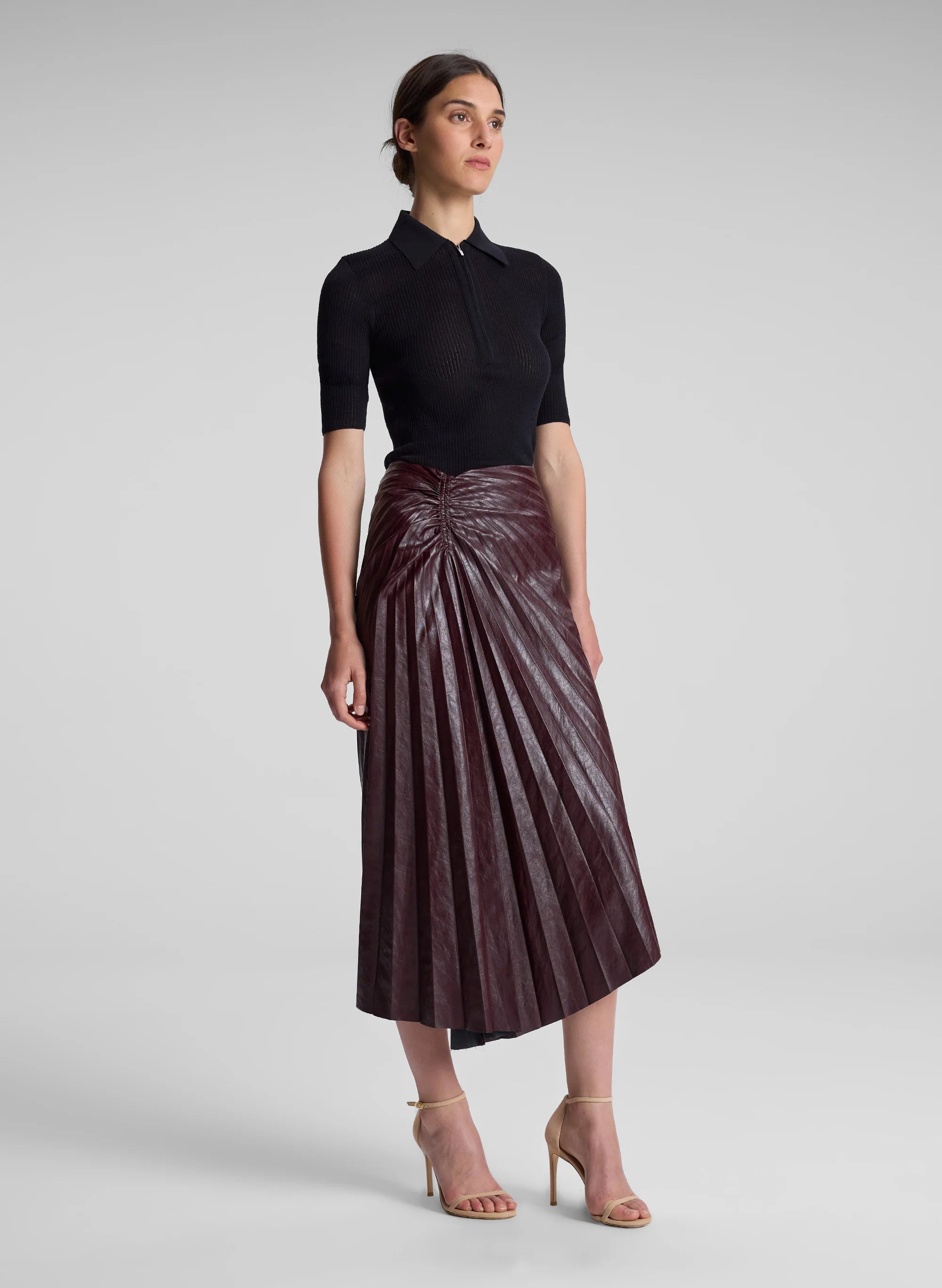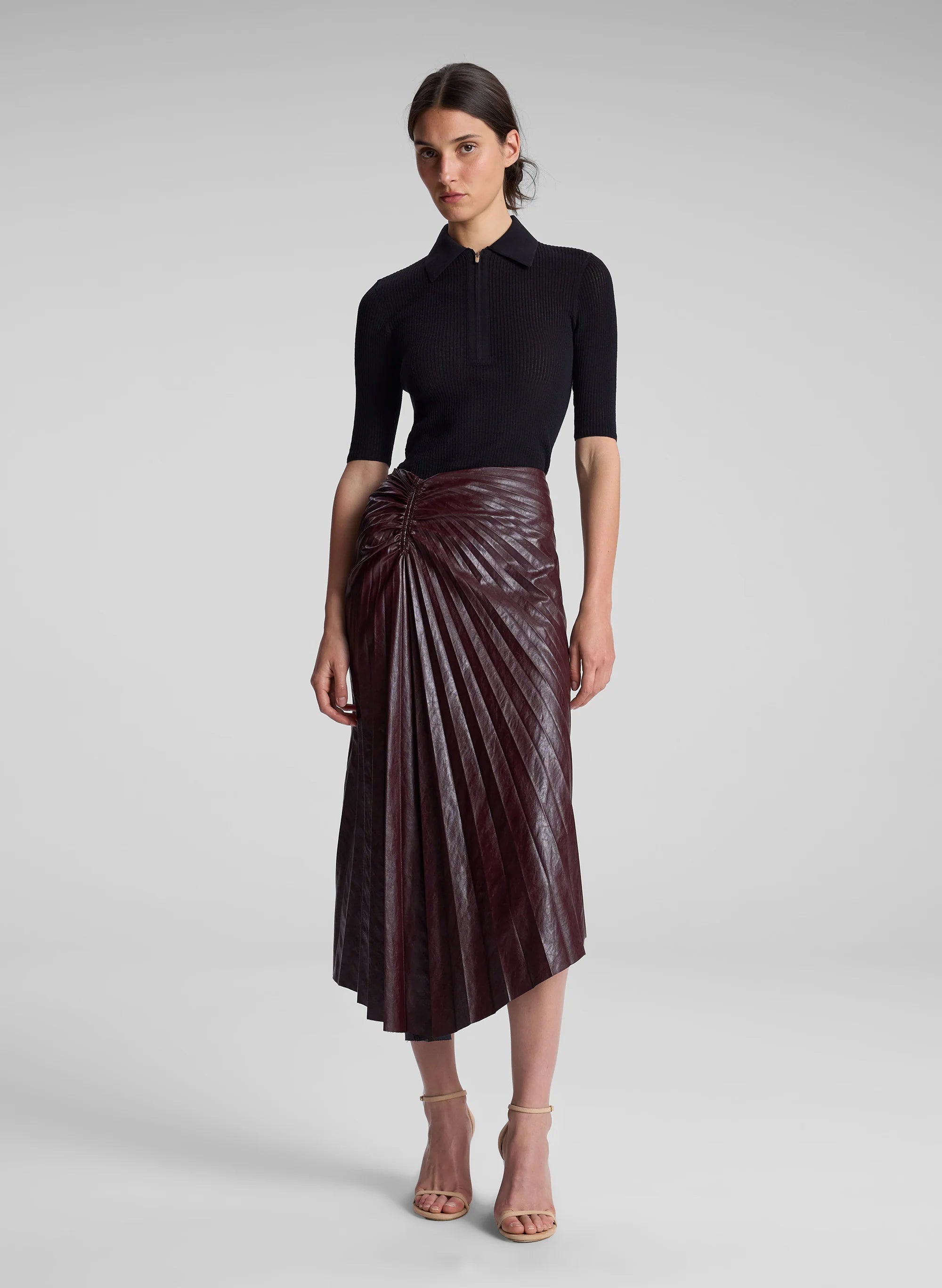 The Tracy Skirt is crafted from our luxe vegan leather fabric in a cordovan hue. This midi silhouette features an asymmetrical hem with starburst pleating and ruched detailing at the hip. This style runs true to size. Shop Bottoms.