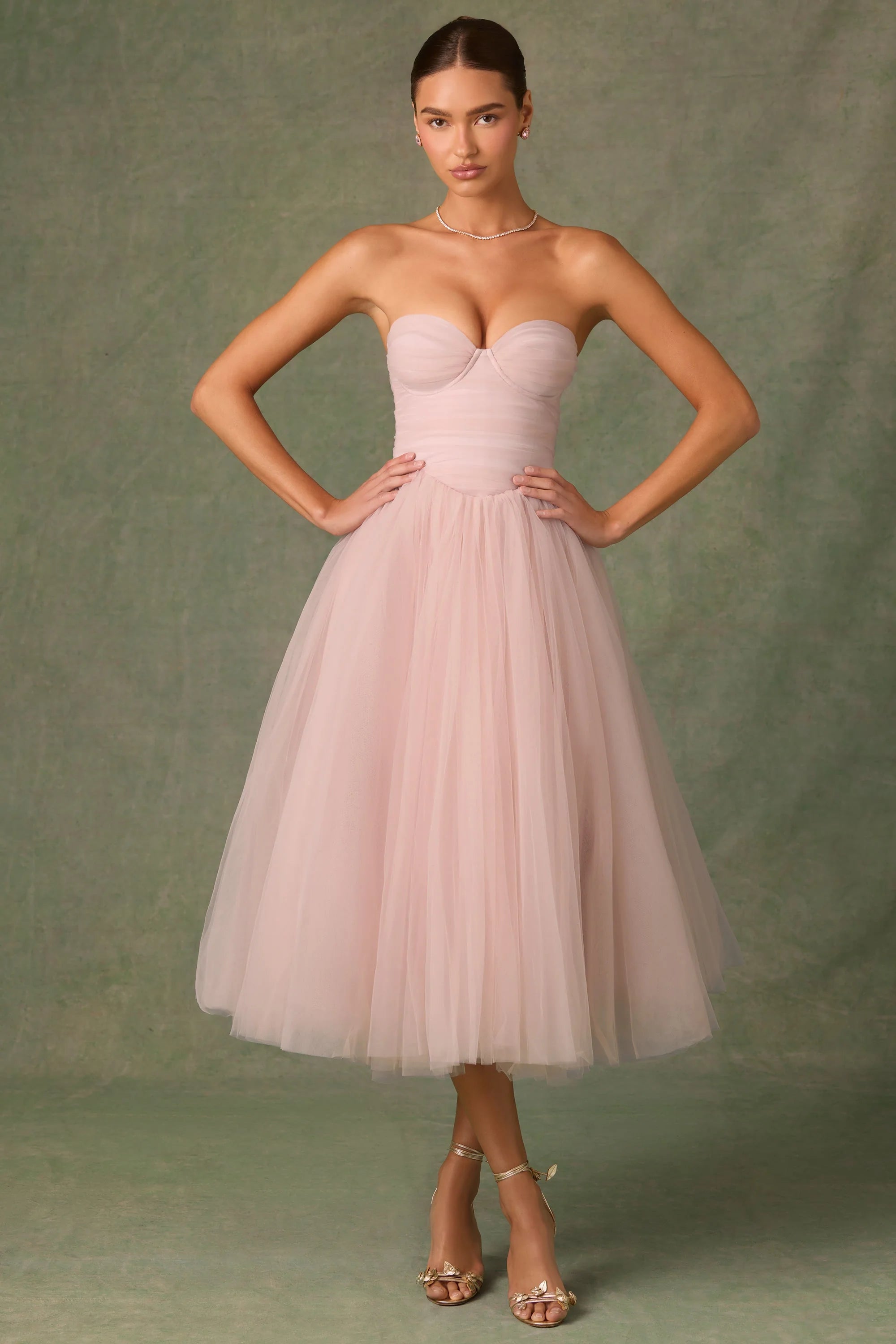 Divinely feminine, unapologetically bold. A perfect occasion piece, the Cindy midaxi dress is crafted from layers of frothy tulle with a fitted corset bodice for instant shaping and wired cups, complete with internal silicone grip tape for enhanced support. Its cut to a fit-and-flare silhouette with a voluminous layered skirt and comes with detachable, adjustable shoulder straps for a custom fit.