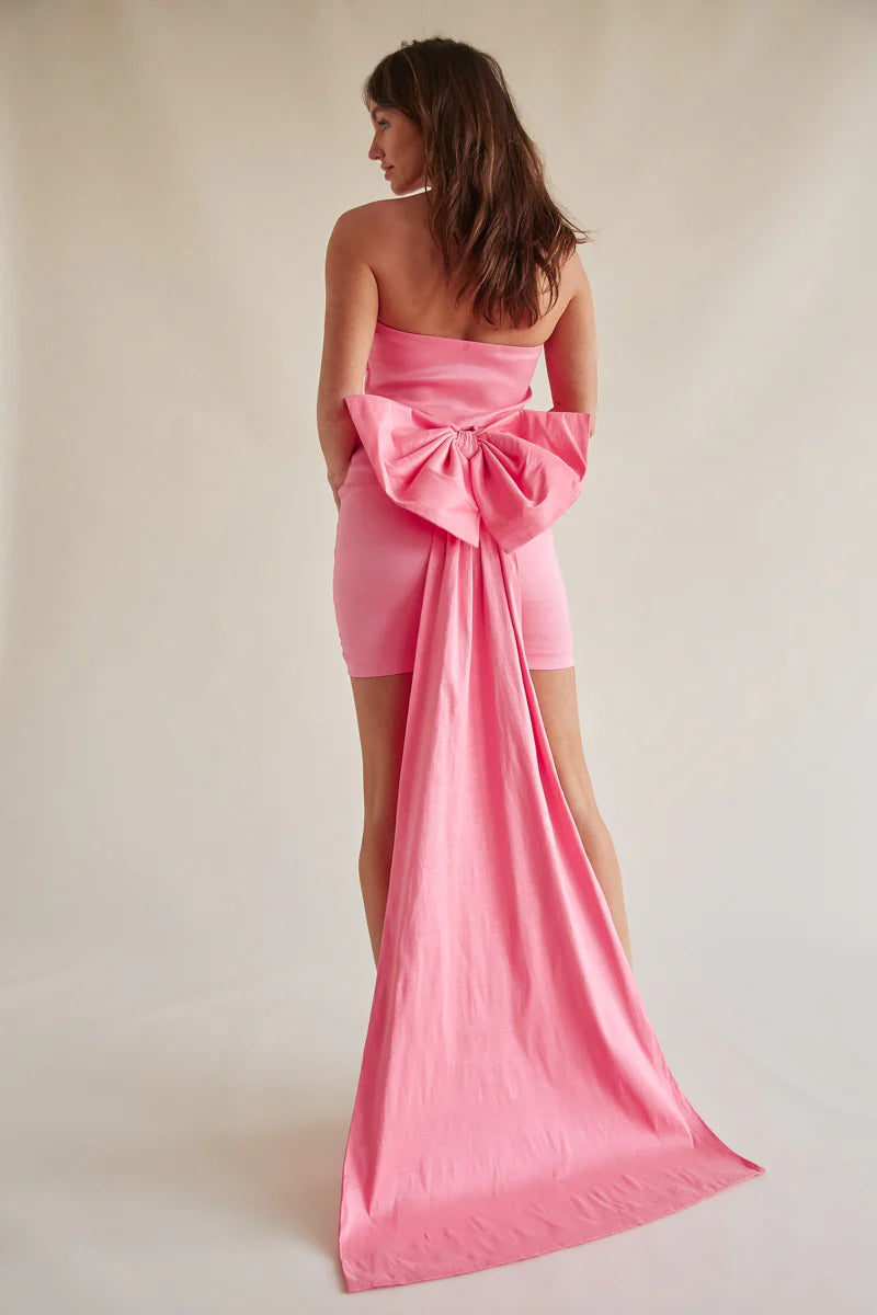 So elegant in the Valencia Strapless Bodycon Bow Train Mini Dress. This perfectly coquette mini dress features a straight across strapless neckline, a statement bow on the back, and a floor-length train. Available in pink, white and .