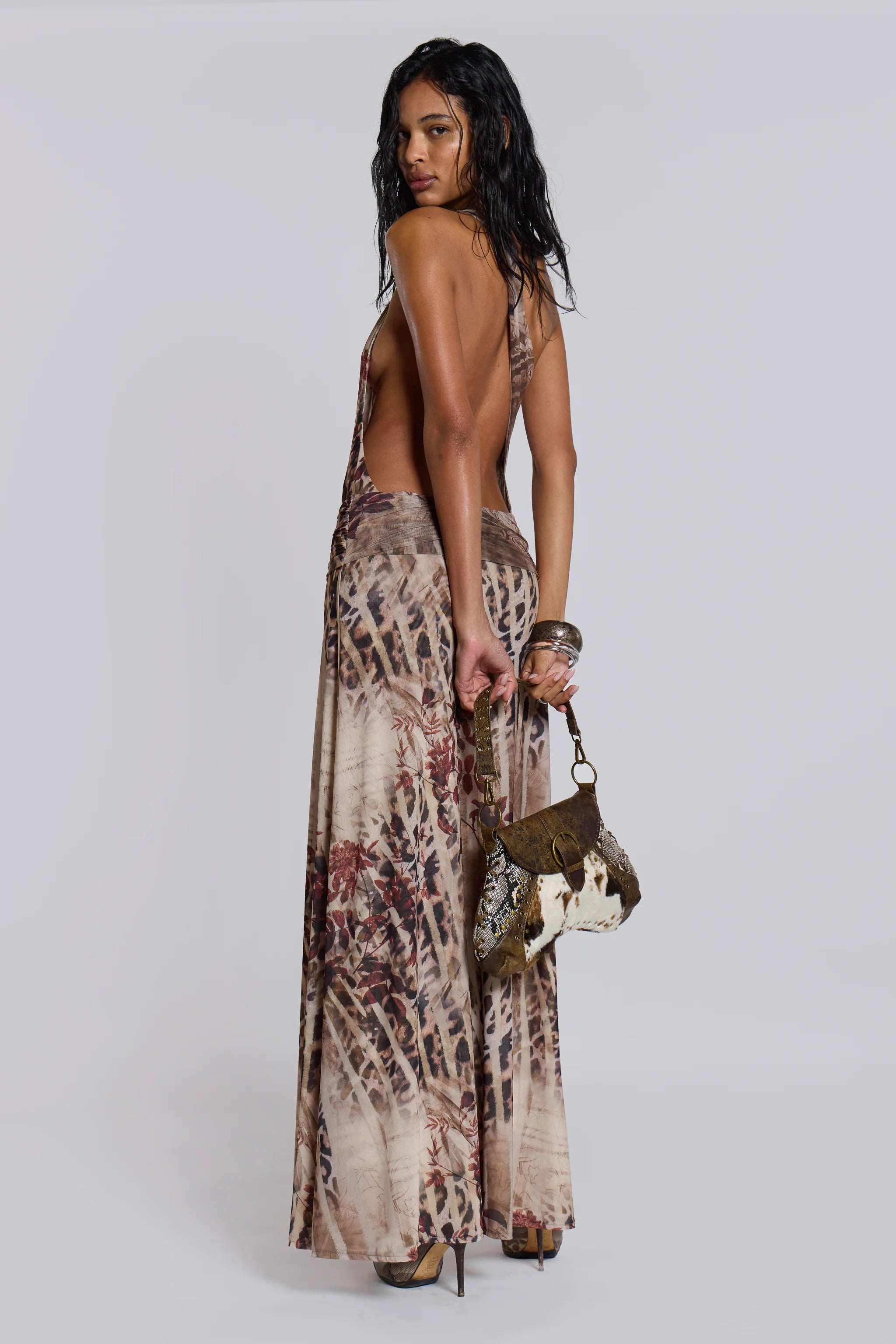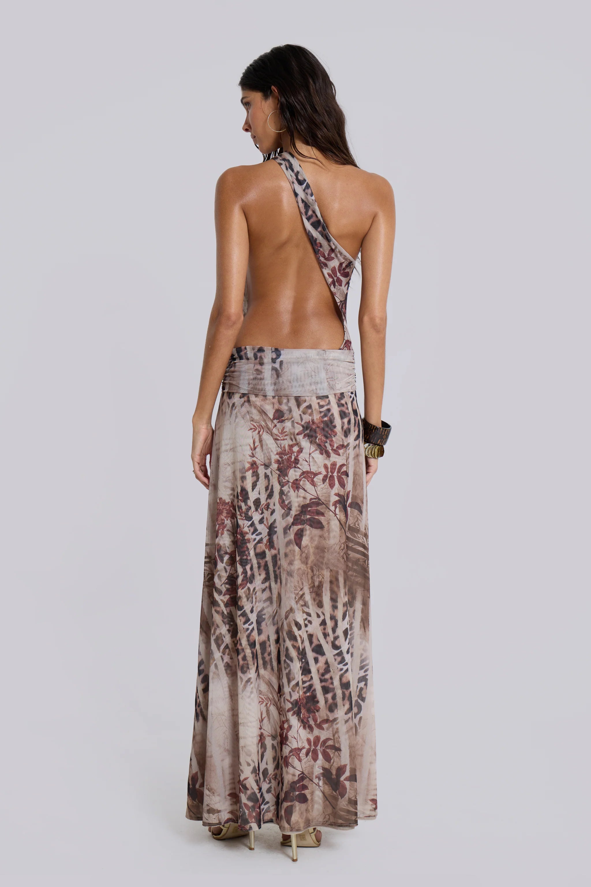 Asymmetric printed maxi dress with cut out and gold trim detail