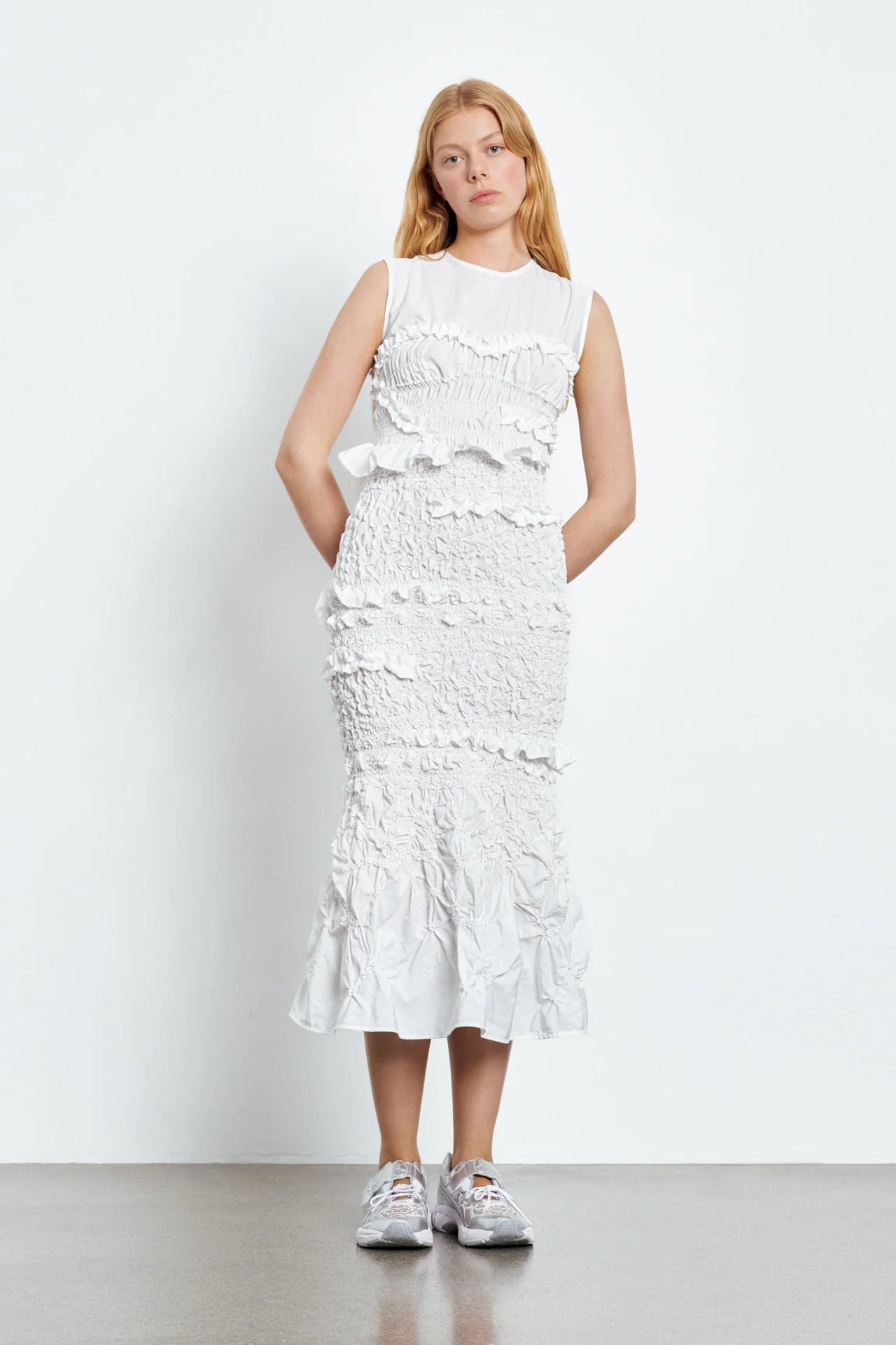 Expanding on newfound silhouettes. Cecilie Bahnsen introduces the Vanda dress. A unified take on beloved separates. the fitted silhouette is cut from a black/white faille. smocked to embrace the body and channel a relaxed. modern femininity complete with illusory ruffles.