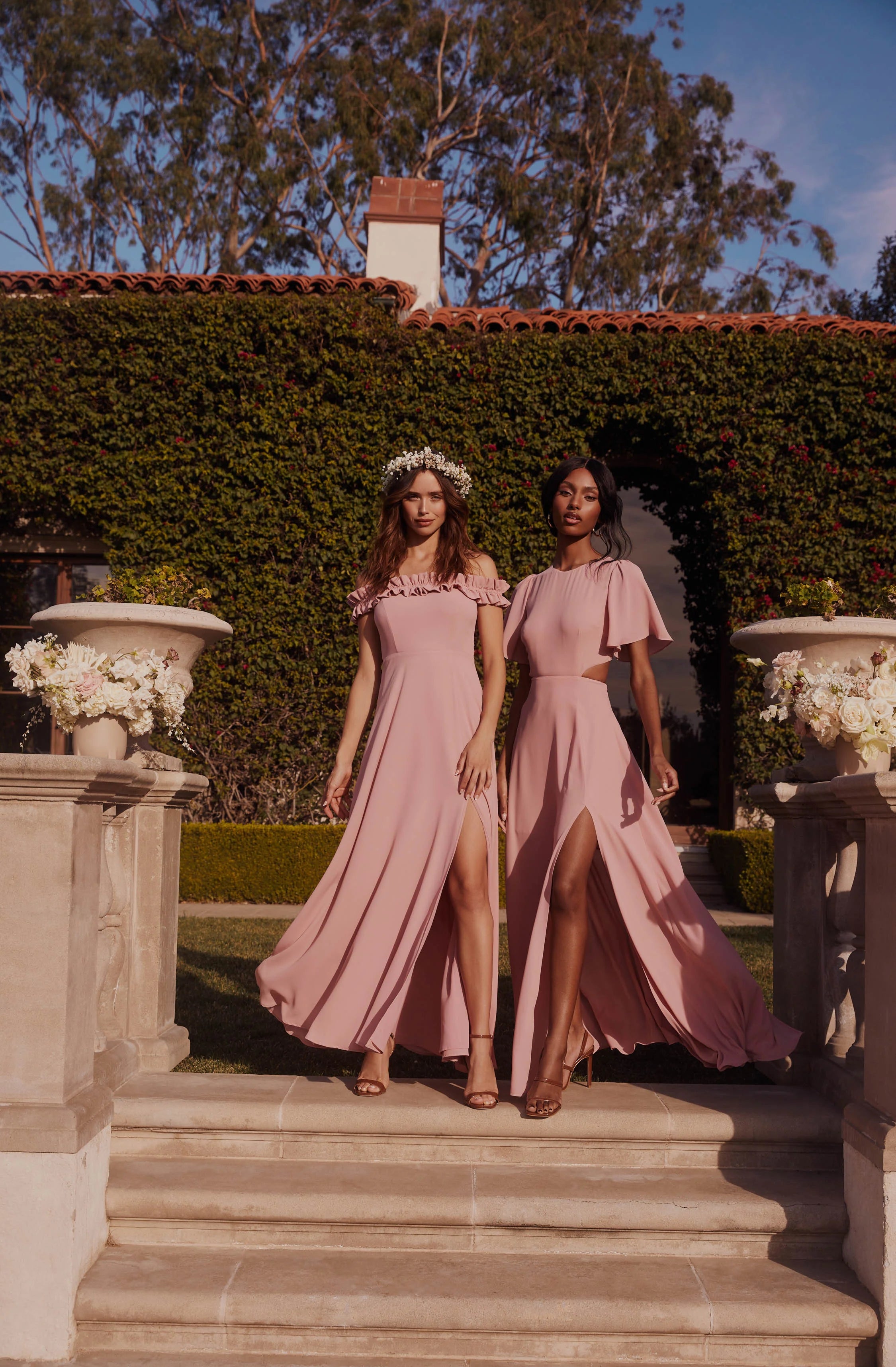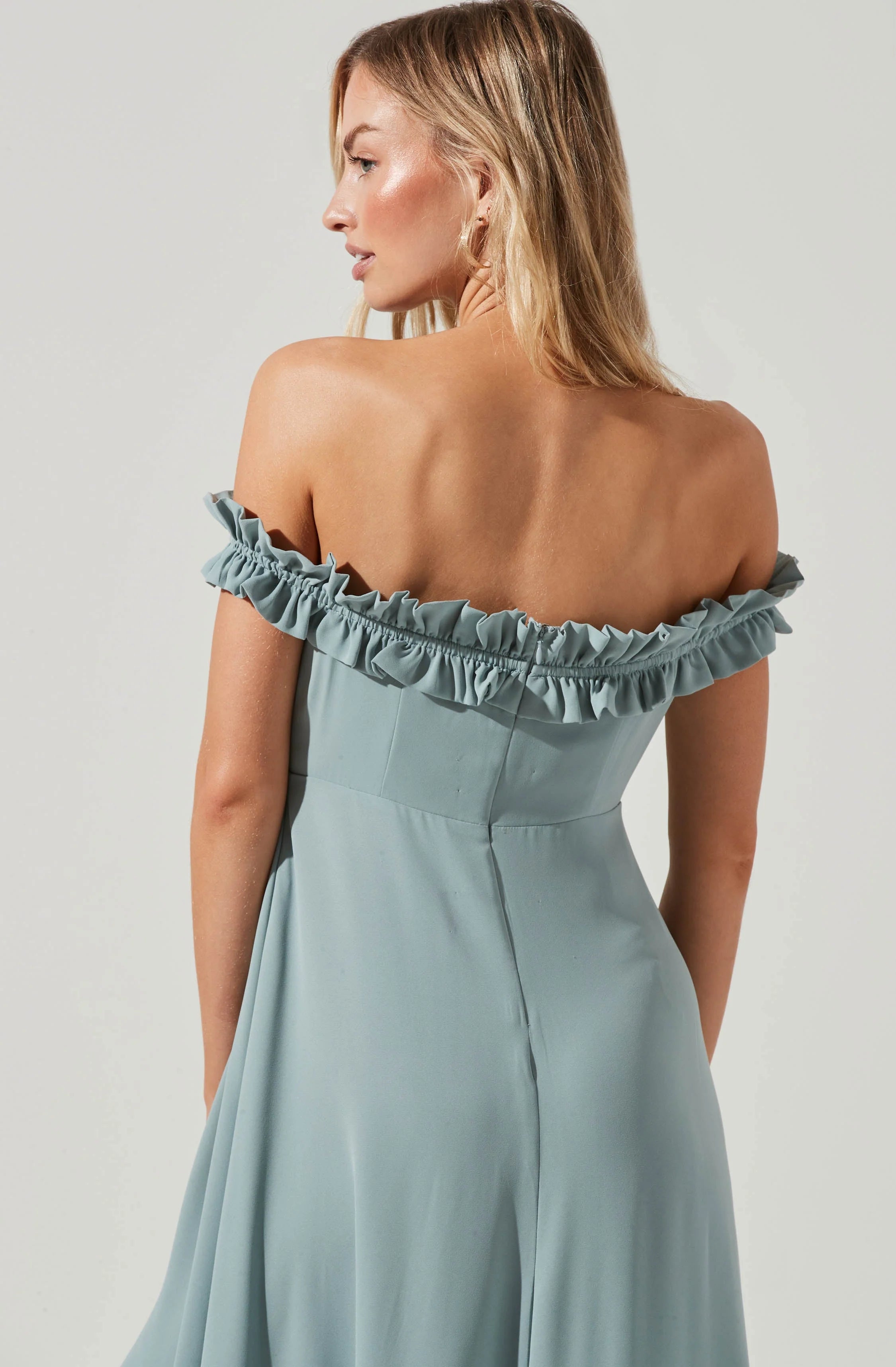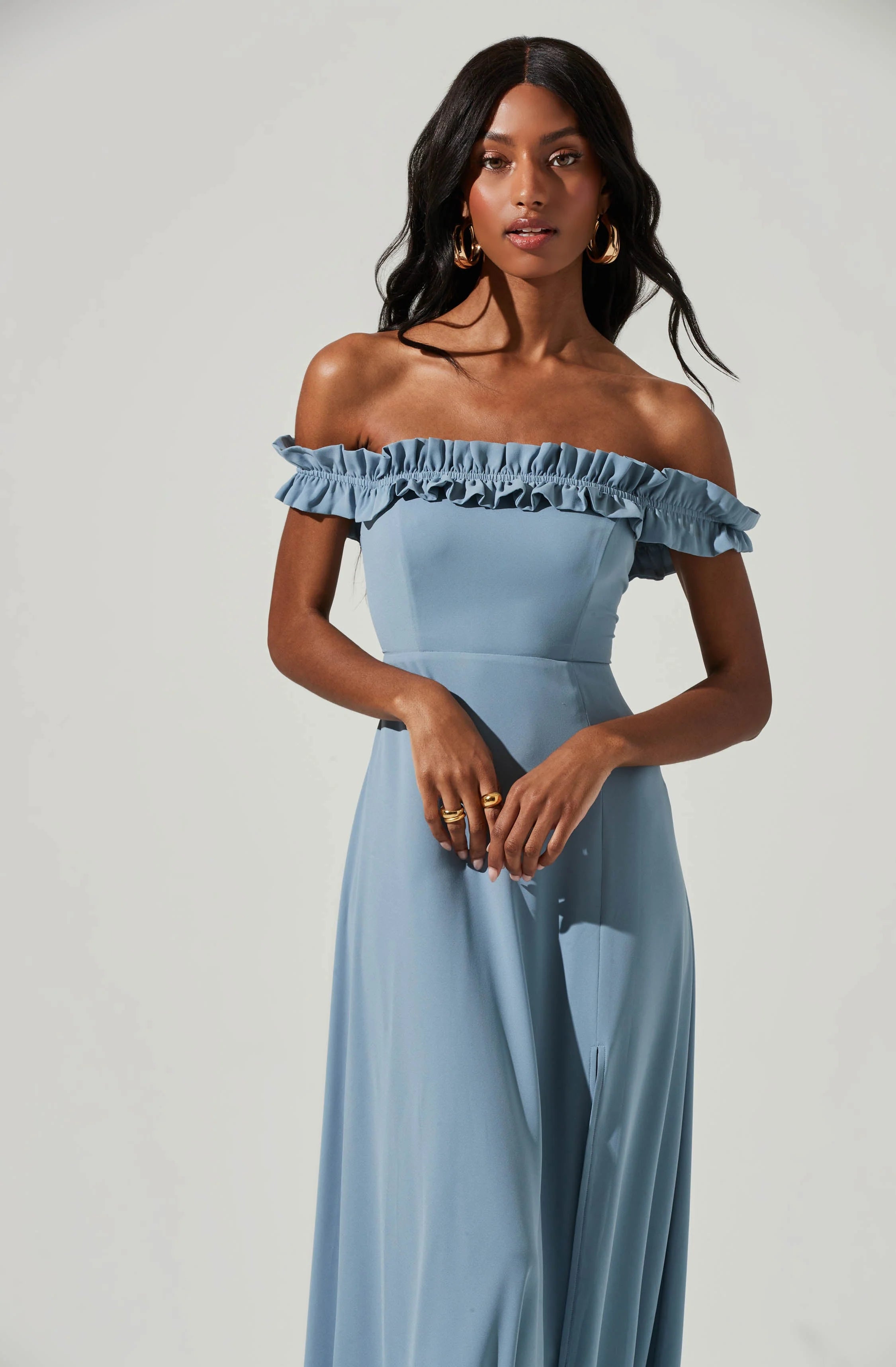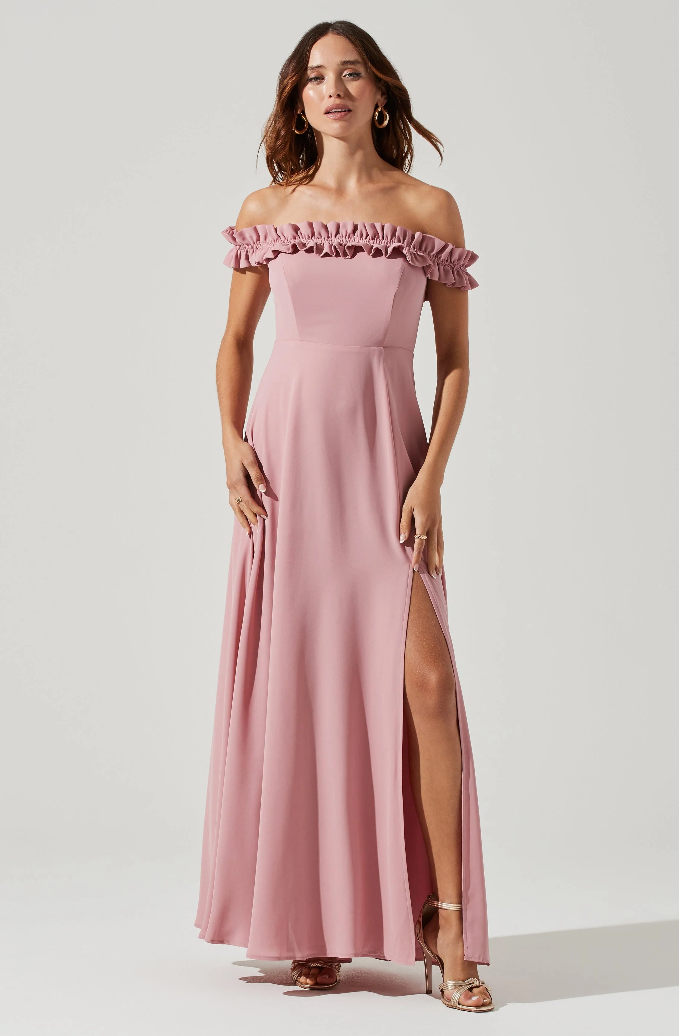 The dreamiest bridesmaid look. The Venetia Dress features an off-shoulder neckline with a statement ruffle trim. Darted bust leads to a maxi-length skirt with a side slit accent. Concealed back zip closure.