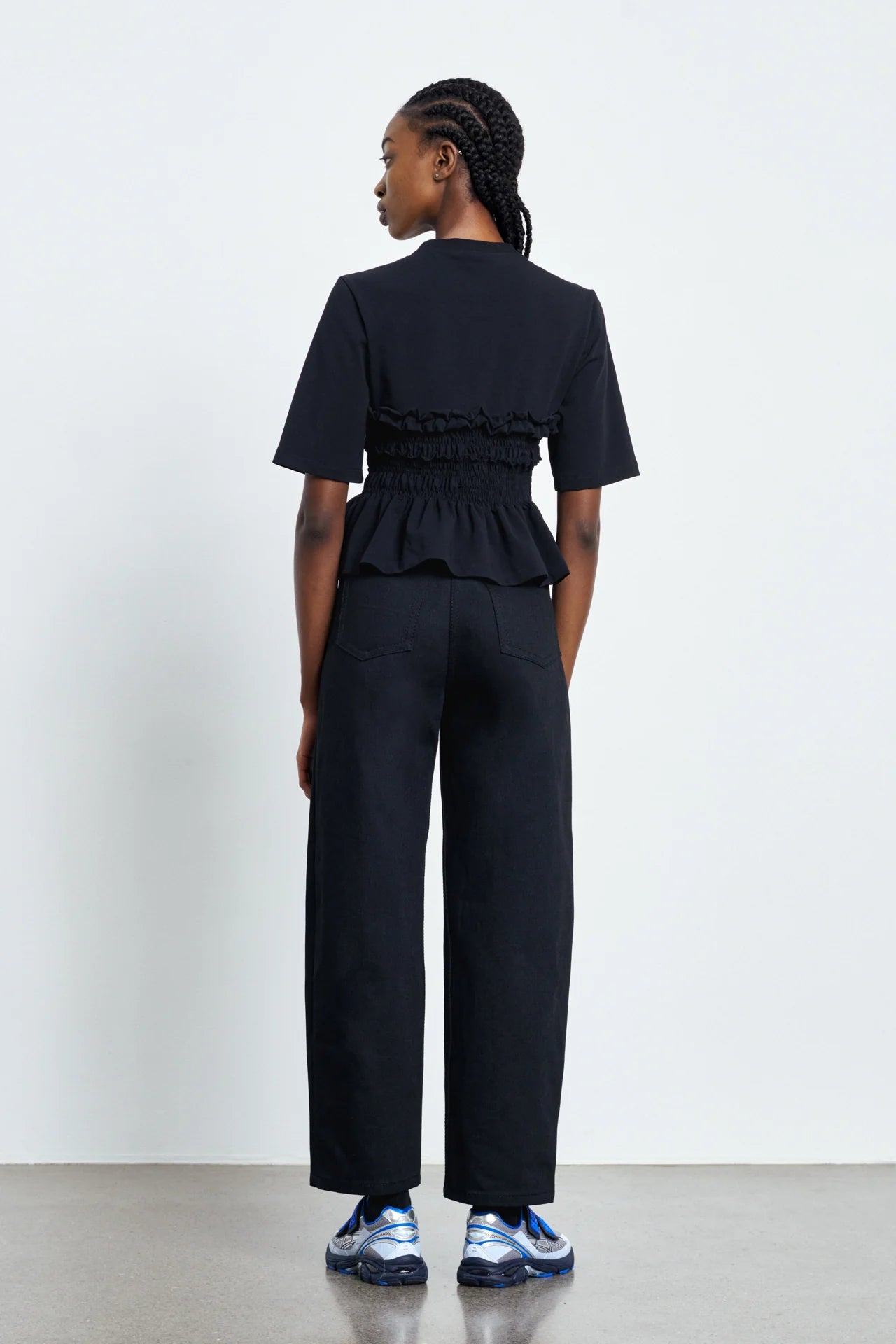Ease meets elegance with the Vilde t-shirt. Cut from jersey and manipulated to create a ruched silhouette. the bodice is a couture counterpoint to the casual white/black tee.