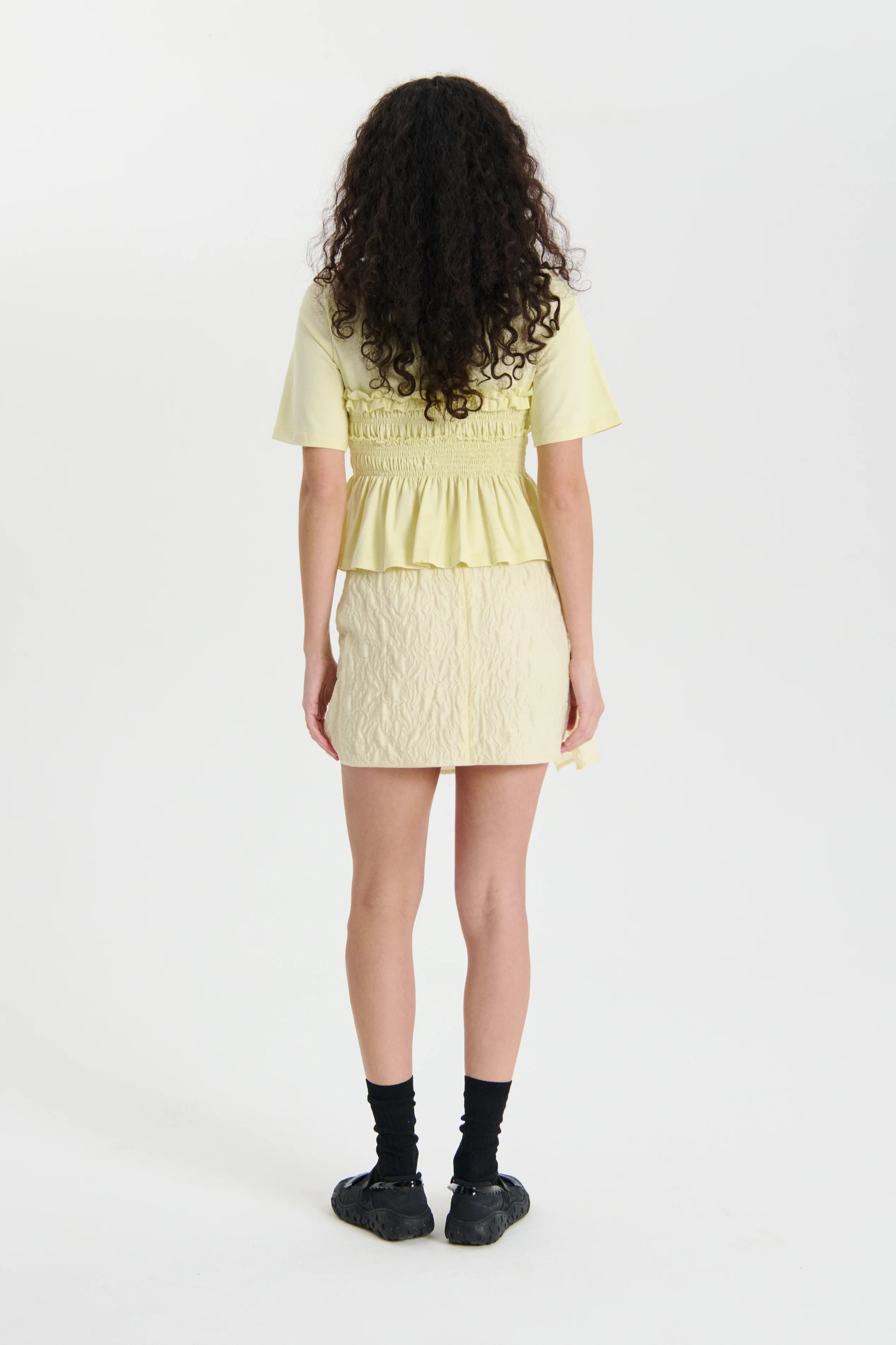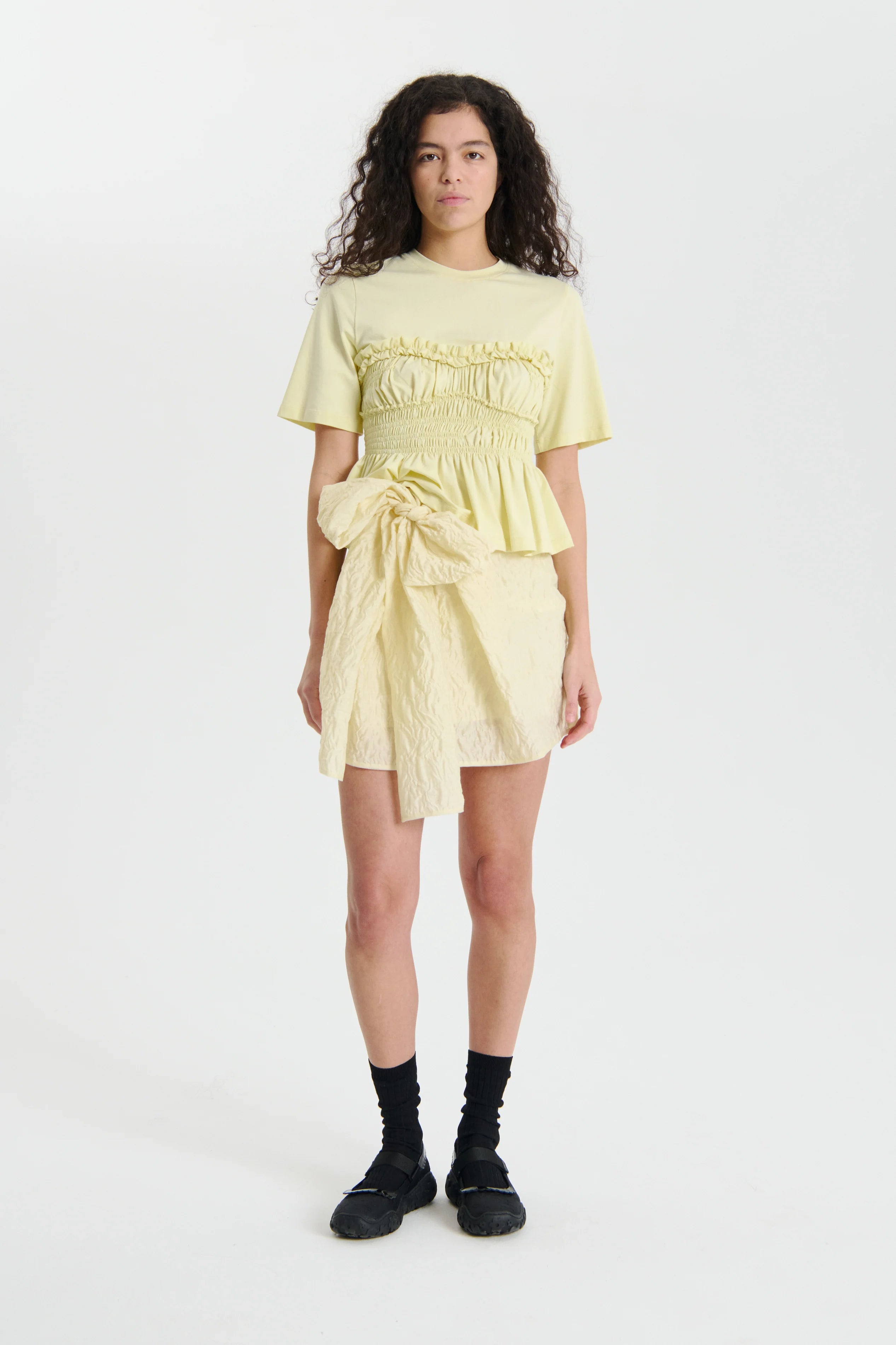 Ease meets elegance with the Vilde t-shirt. Cut from soft yellow jersey and manipulated to create a ruched silhouette. the bodice is a couture counterpoint to the casual plain tee.