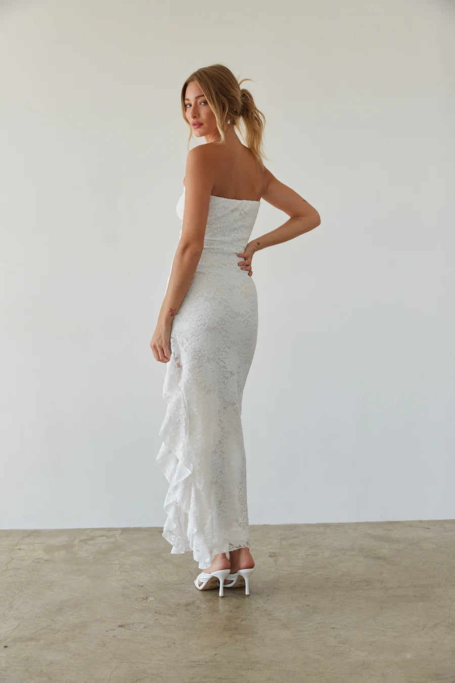 Shine in the Vivienne Lace Ruffle Maxi Dress! This gorgeous dress features a straight across neckline and a high leg slit with a ruffle trim. Available in white floral lace. Pair with a sleek to complete the look!