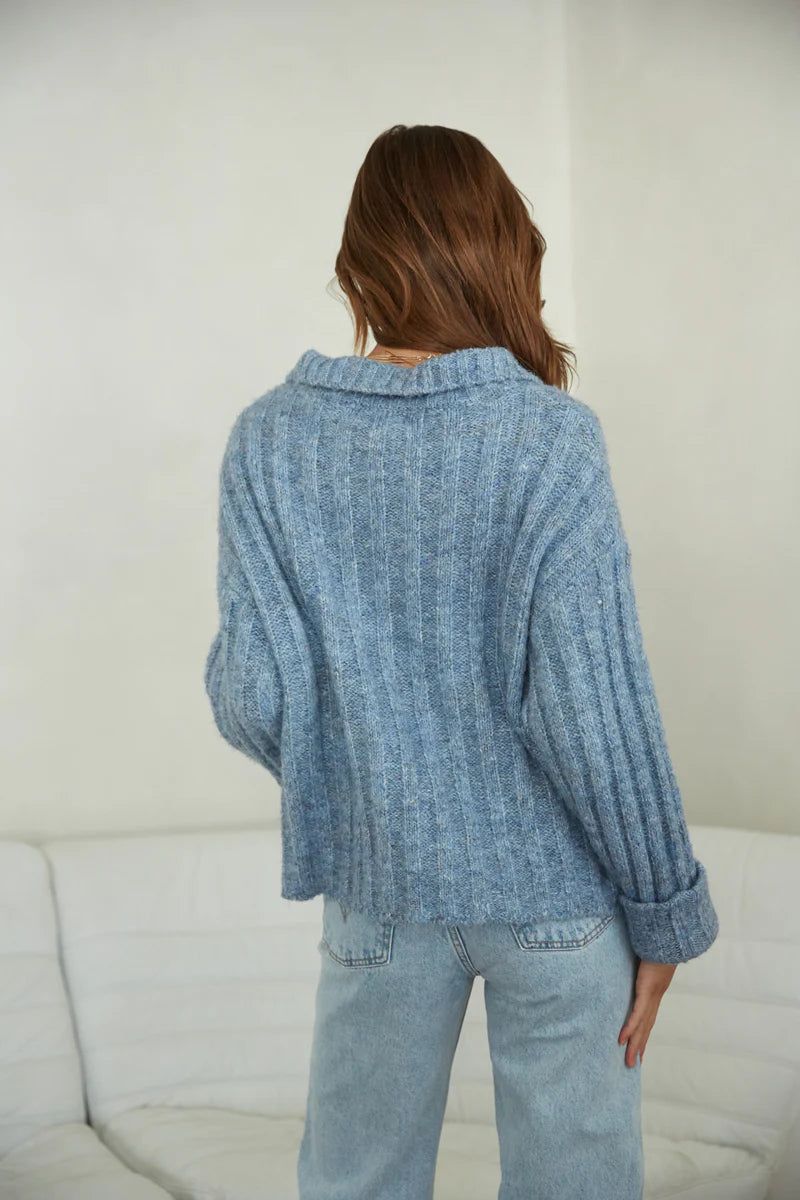 Your closet isn't complete without the Waverly Collared Sweater! This cozy sweater features a fuzzy rib knit, oversize boxy fit, and quarter button up design. Available in heather blue. Pair with some to complete the look!