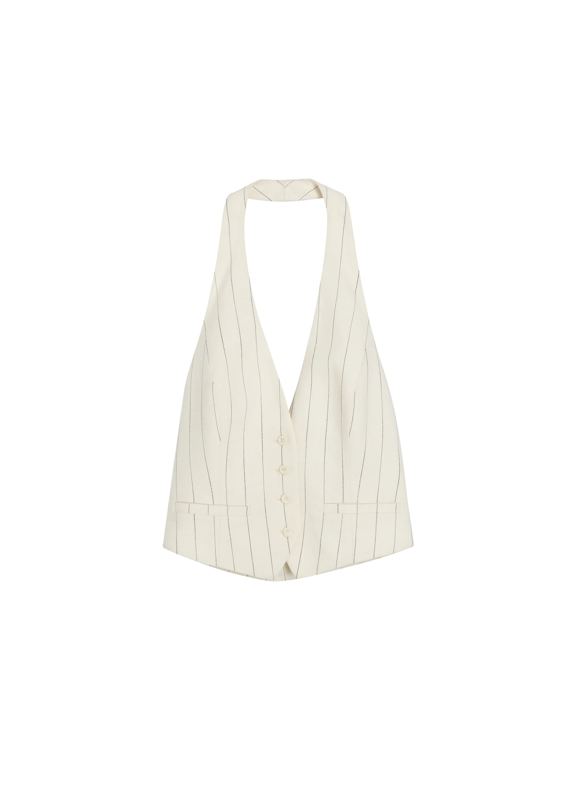 The Woodson Vest is crafted from our Portuguese woven suiting fabric with soft ticking stripes. This sleeveless silhouette features a halter neckline with four buttons and an adjustable back strap. This style runs true to size. Shop Tops.