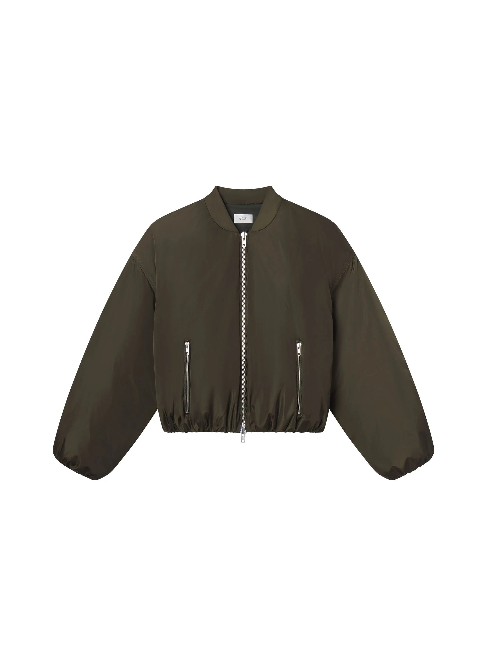 The Zane Jacket is crafted from a lustrous nylon taffeta in a deep olive hue. This bomber silhouette features voluminous sleeves and silver-tone hardware to complete the look. This style runs true to size. Shop Jackets.