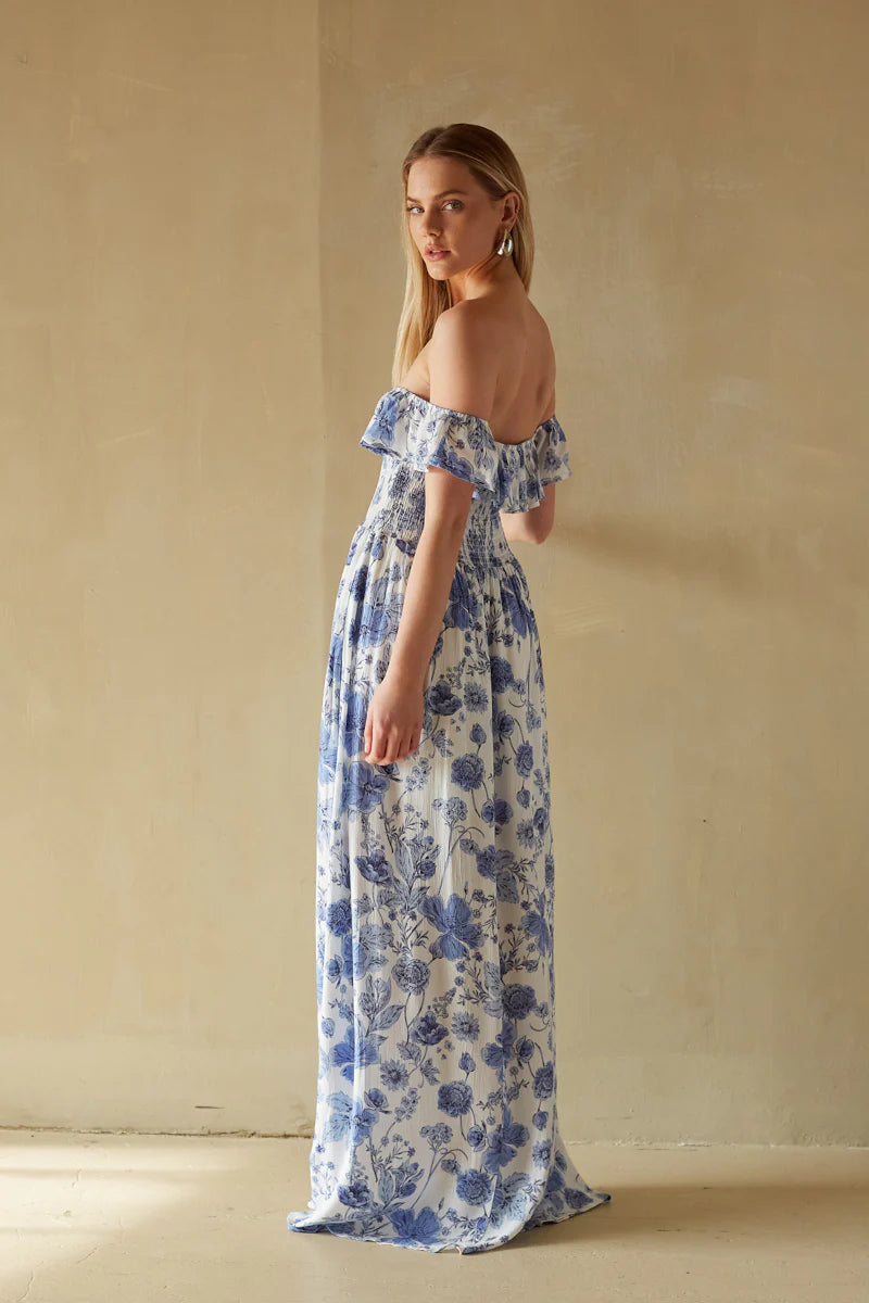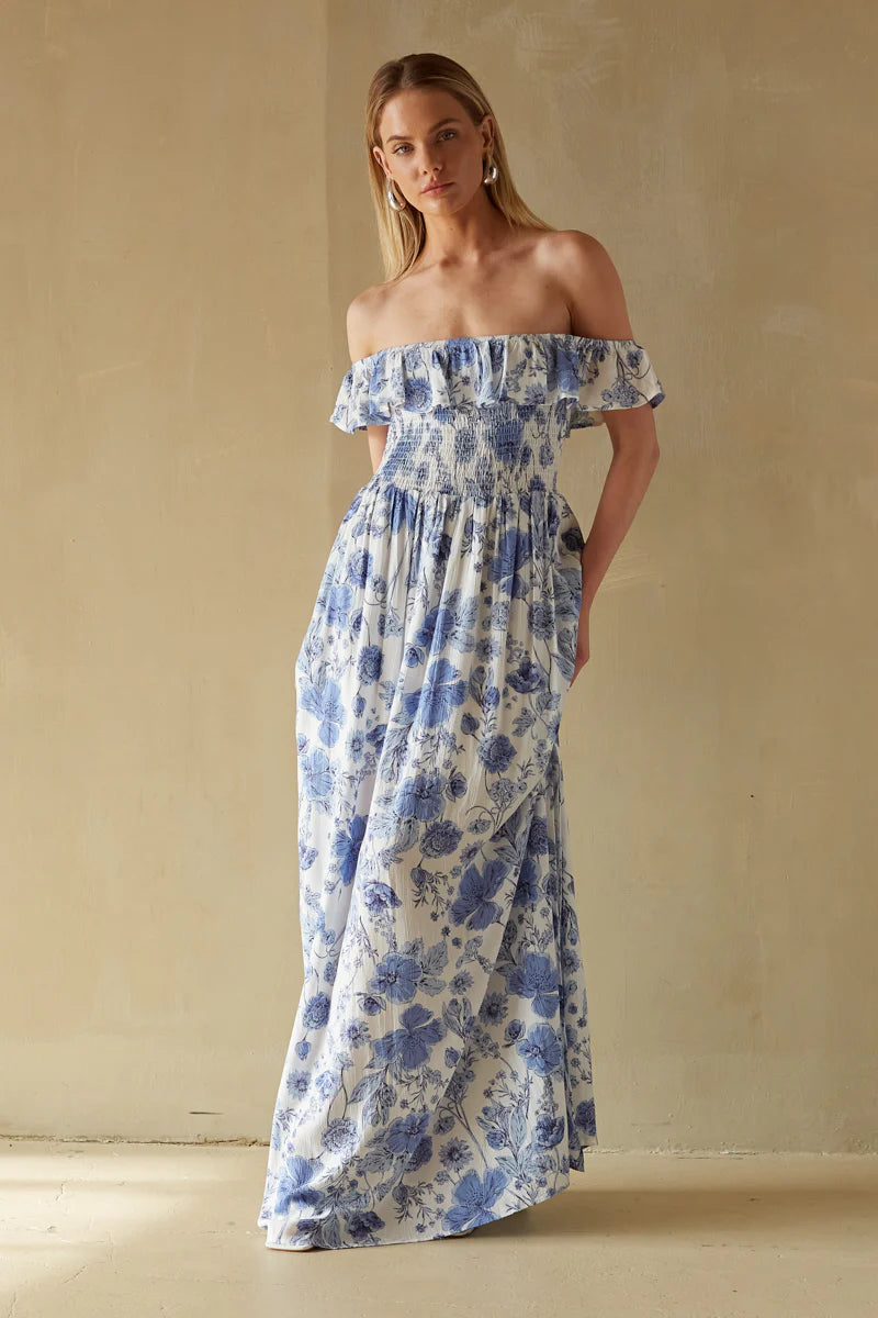 Get resort ready in this gorgeous flowy maxi dress! The Zari Floral Maxi Dress features hidden side pockets, a fun off the shoulder ruffle detail, stretchy smocked bodice for a flattering fit, and a pretty blue floral pattern. Complete this summery look with some trendy jewelry from !