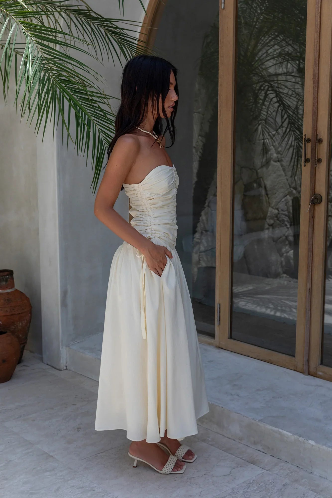 Elegant and timeless, the Zori Maxi Dress is the perfect blend of sophistication and style. A statement piece made for your summer wardrobe, you'll be dancing through a French chateau in this maxi. Pair yours with classic white heels and gold adornments.